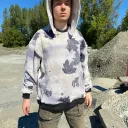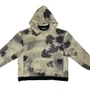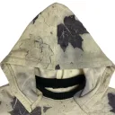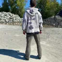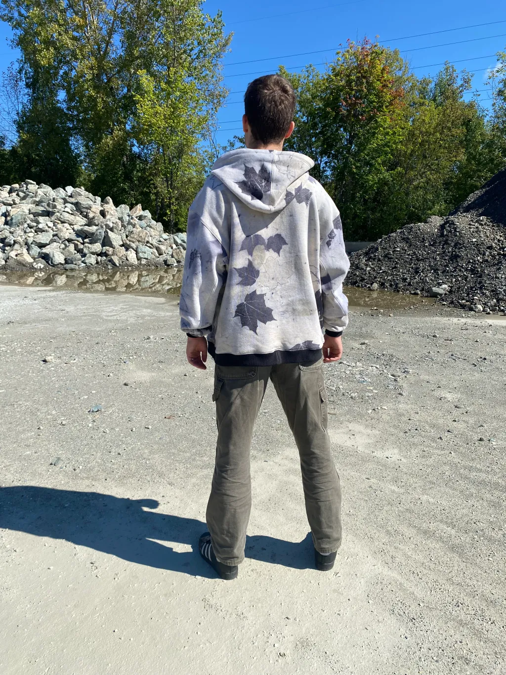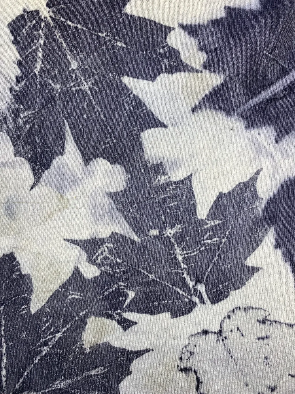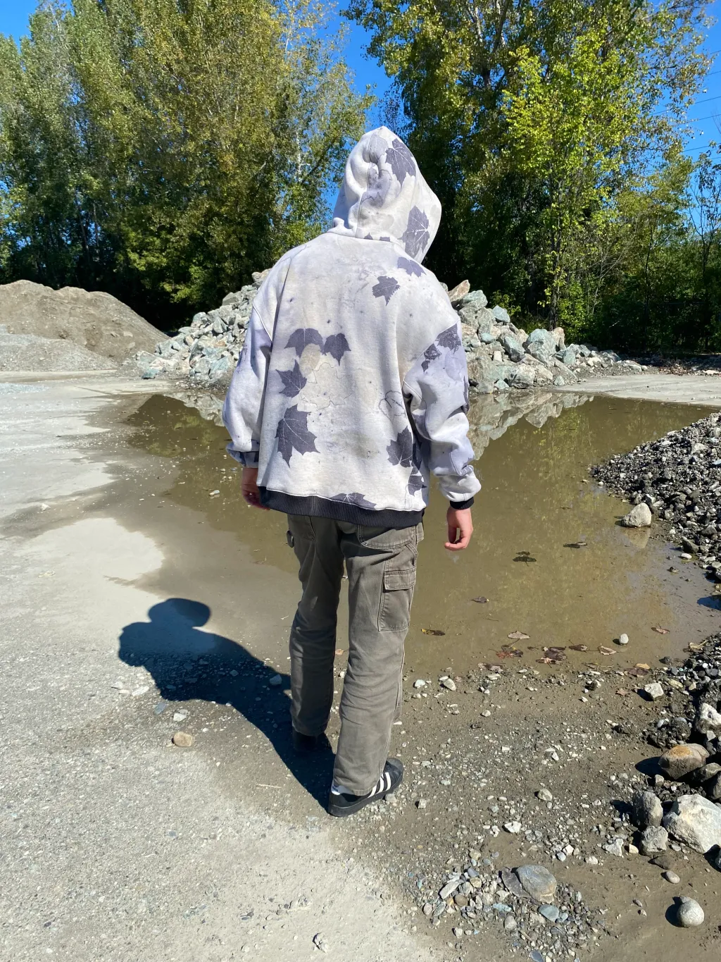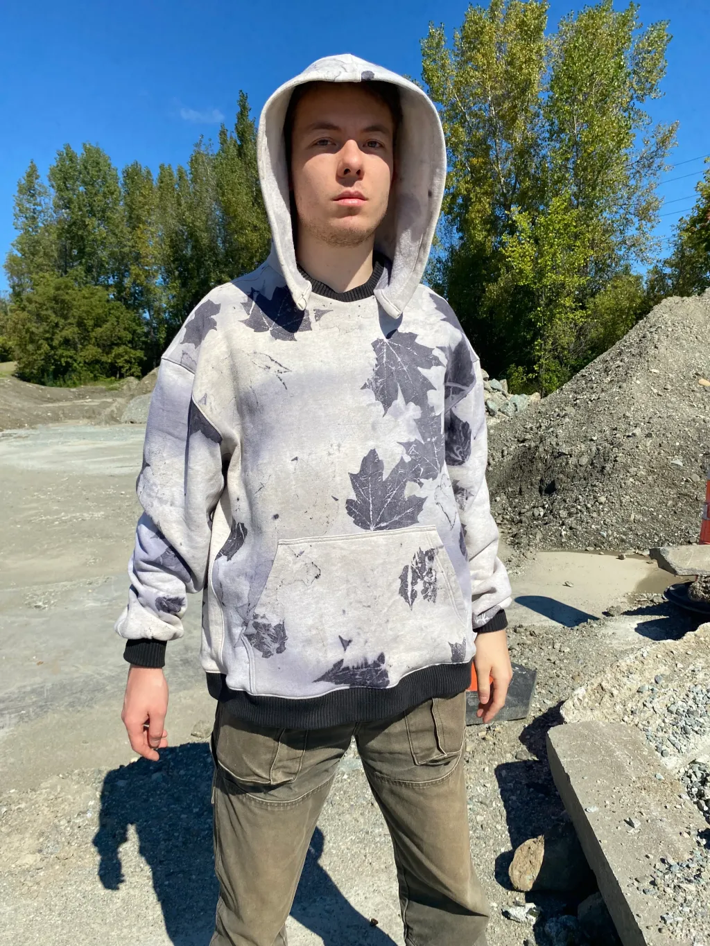 Made of cotton fleece (100% cotton) and printed using the Eco-print technique. This technique is a plant printing process by which leaves of trees (or other plants) are printed on the fabric. The result obtained is different from one time to the next and generates images that are both figurative and abstract, like a very unique camouflage.