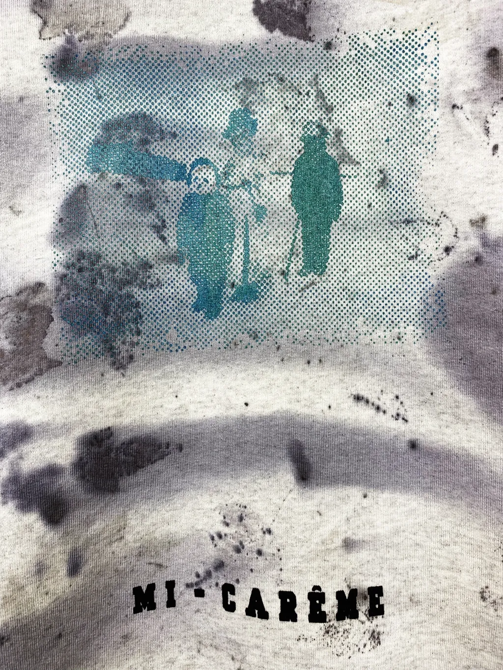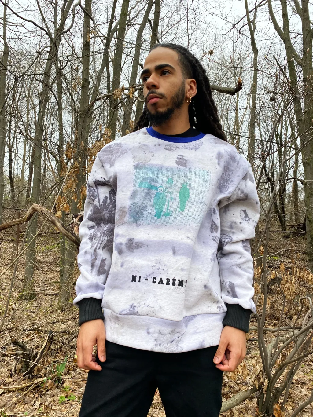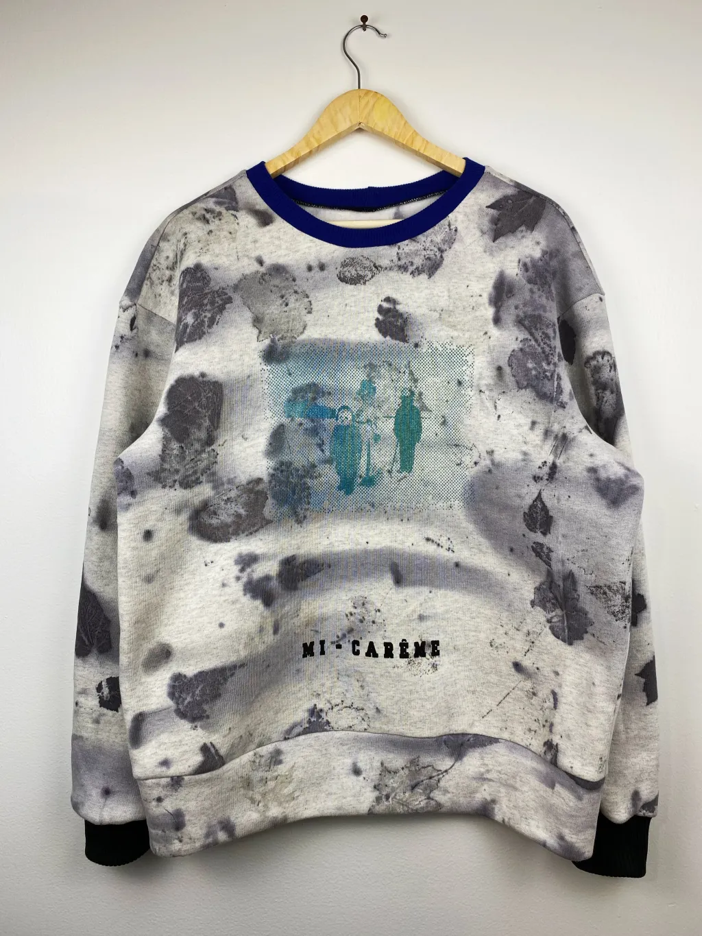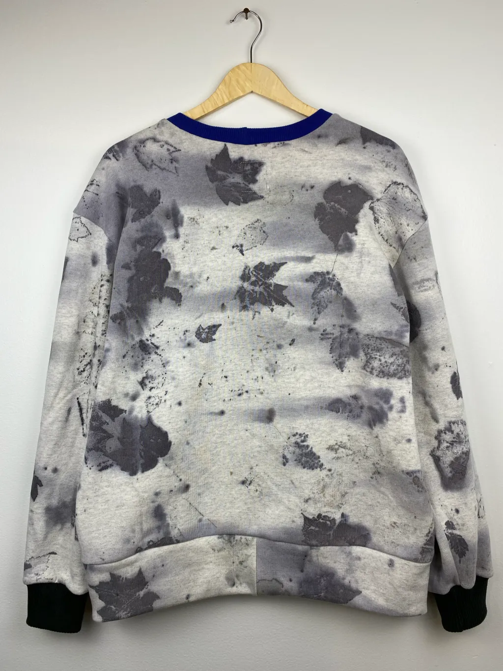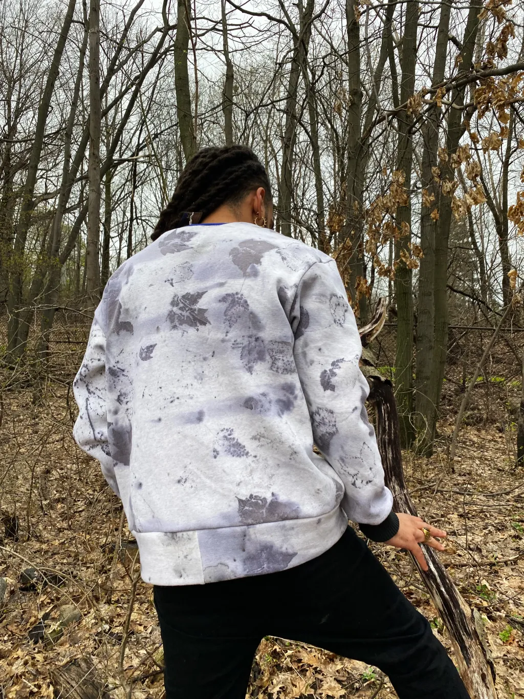 -Made of fleece (100% cotton) and printed using the Eco-print technique. This technique is a plant-based printing process in which tree leaves (or other plants) are printed onto the fabric. The result is different from one time to the next and generates images that are both figurative and abstract, like a very unique camouflage.