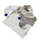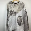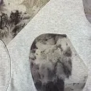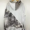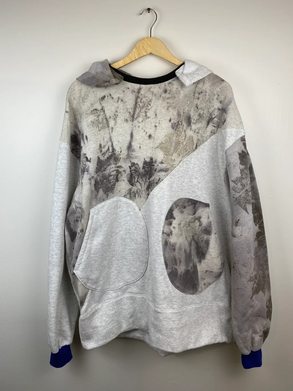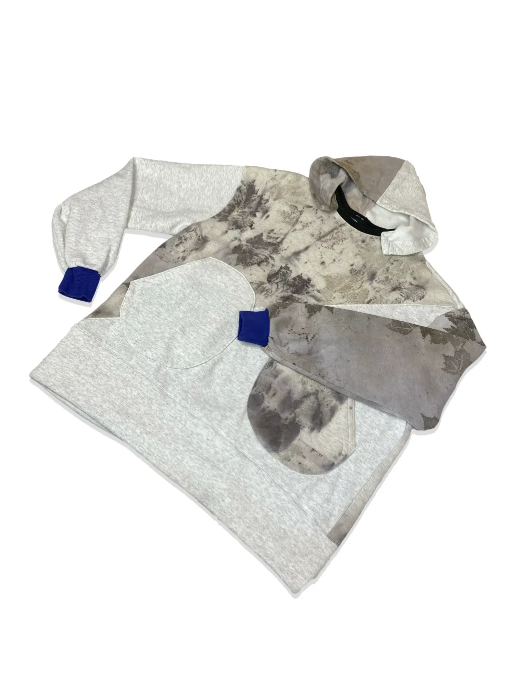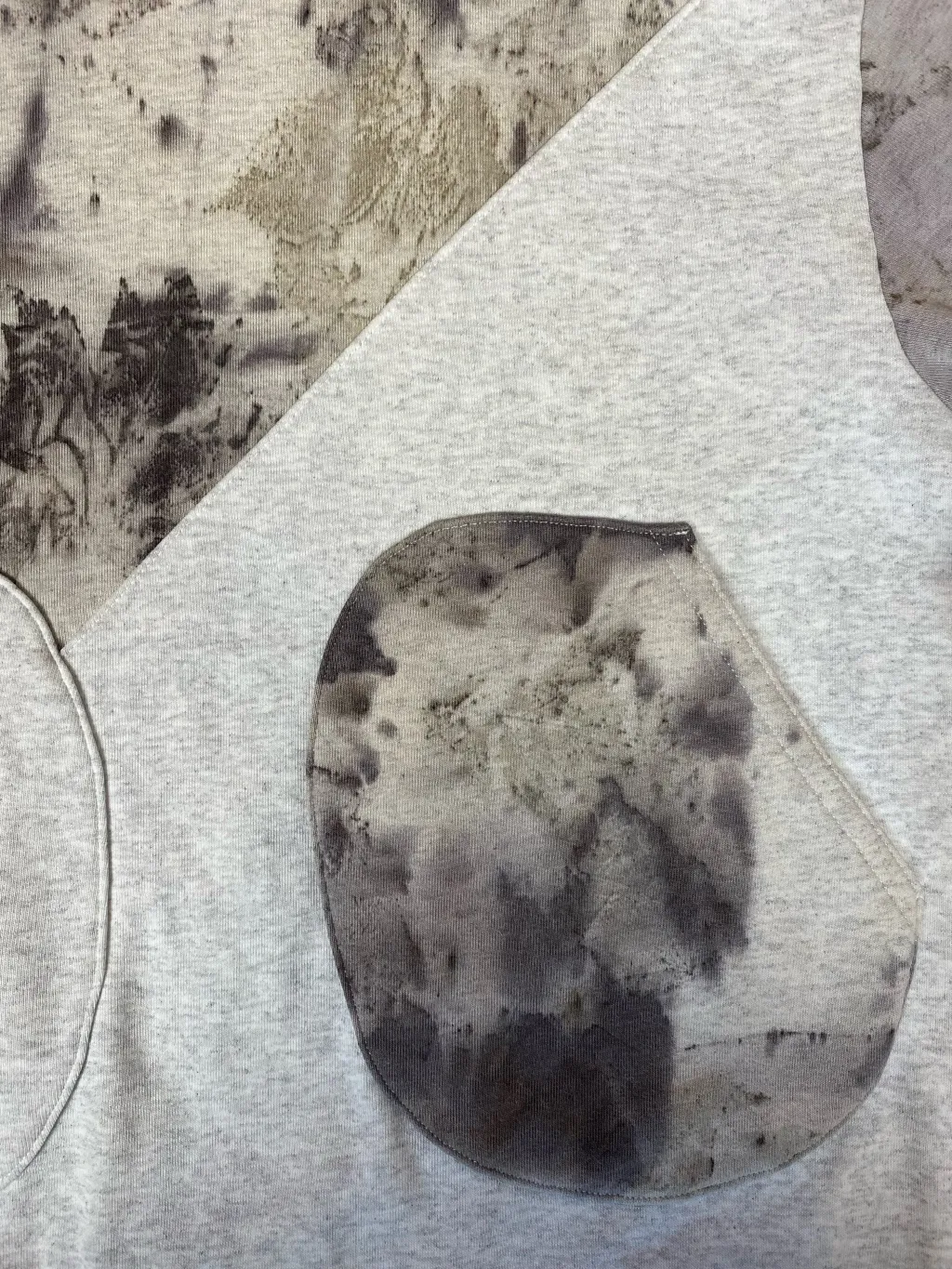 Made of cotton fleece (100% cotton) and printed using the Eco-print technique. This technique is a plant printing process by which leaves of trees (or other plants) are printed on the fabric. The result obtained is different from one time to the next and generates images that are both figurative and abstract, like a very unique camouflage.