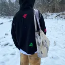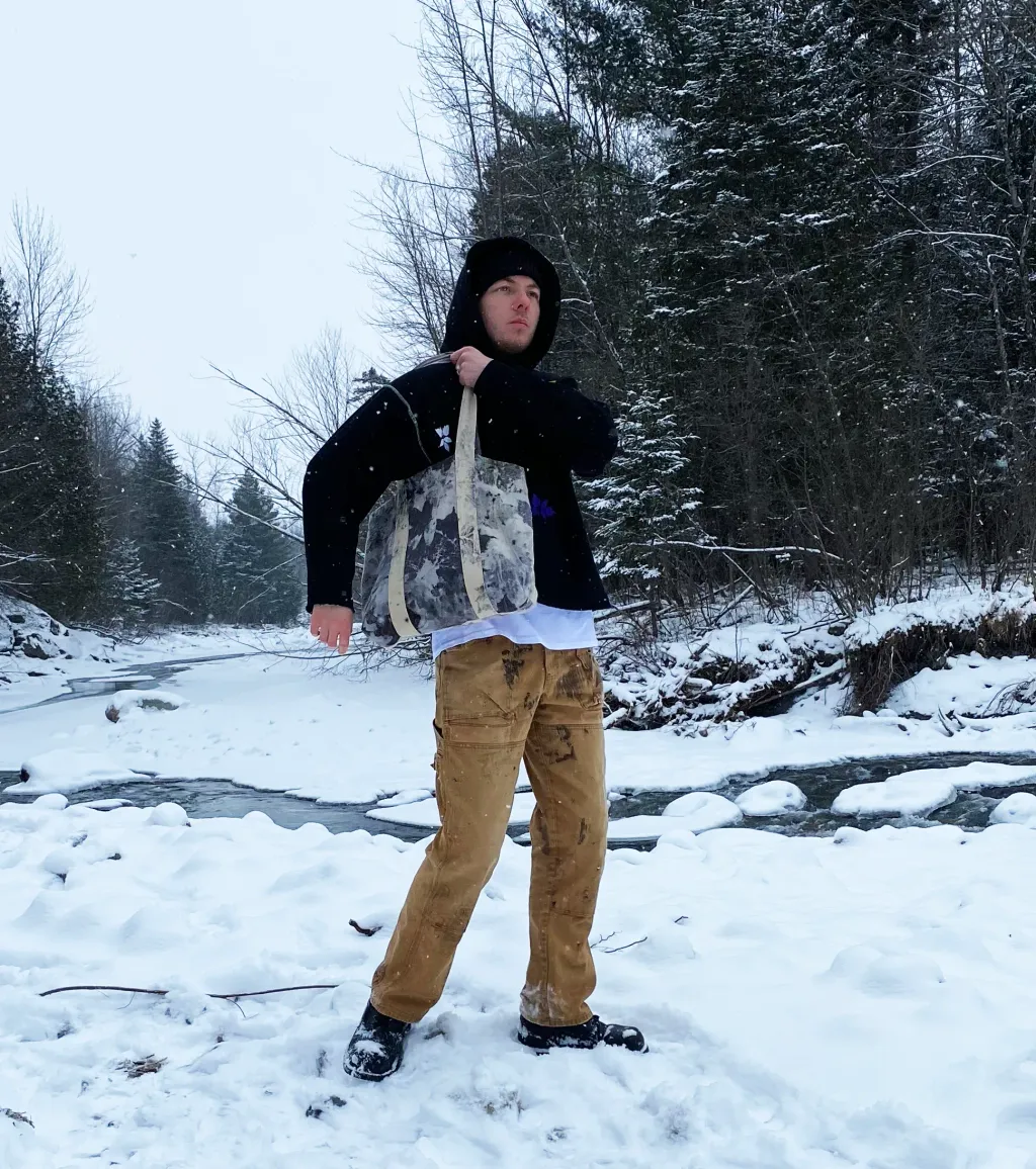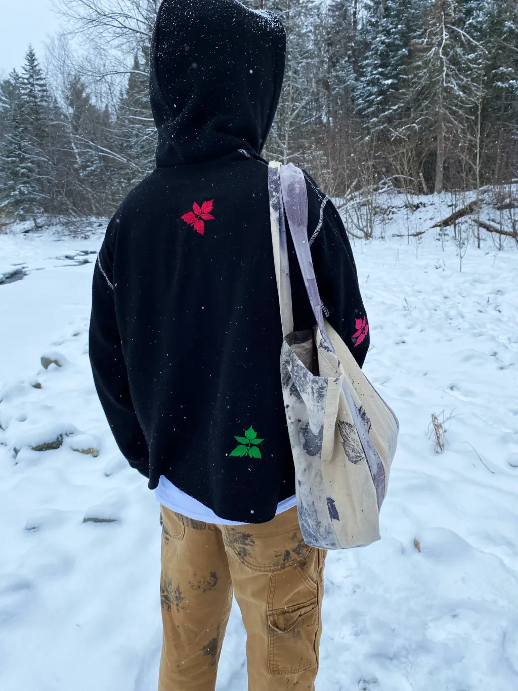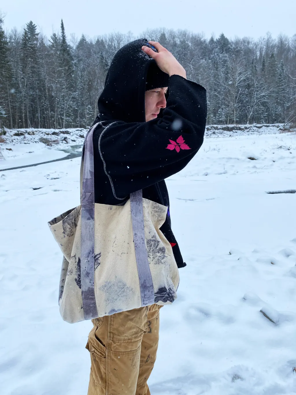 Made from 100% cotton and printed using the Eco-print technique. This technique is a plant printing process by which leaves of trees (or other plants) are printed on the fabric. The result obtained is different from one time to the next and generates images that are both figurative and abstract, like a very unique camouflage.