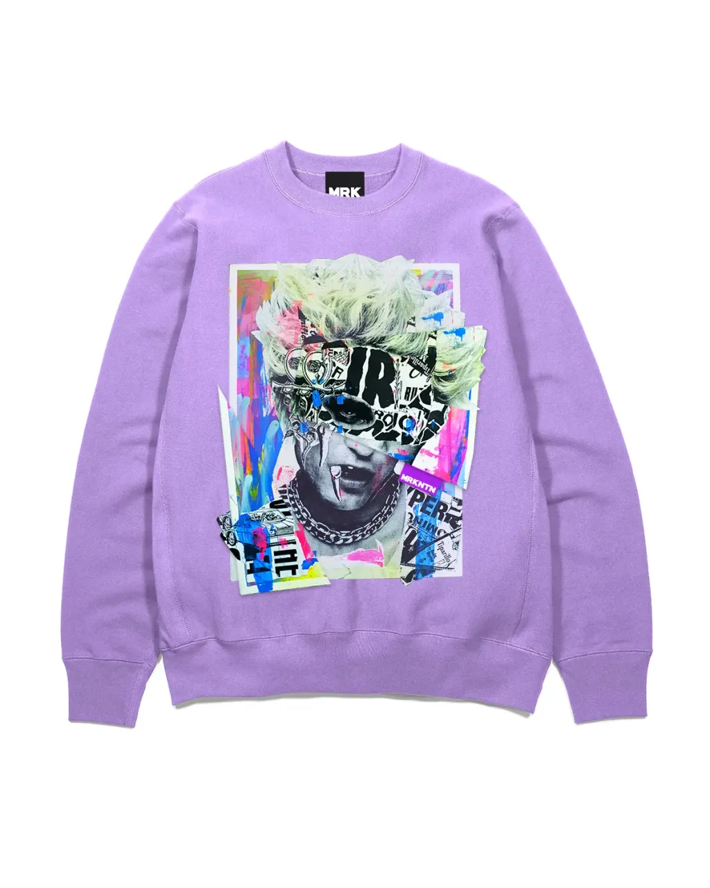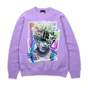 Unisex heavyweight combed cotton fleece sweater in lilas. MRKNTN x TEETZ: Twilight graphic printed et assembled at front. Each collage is unique.