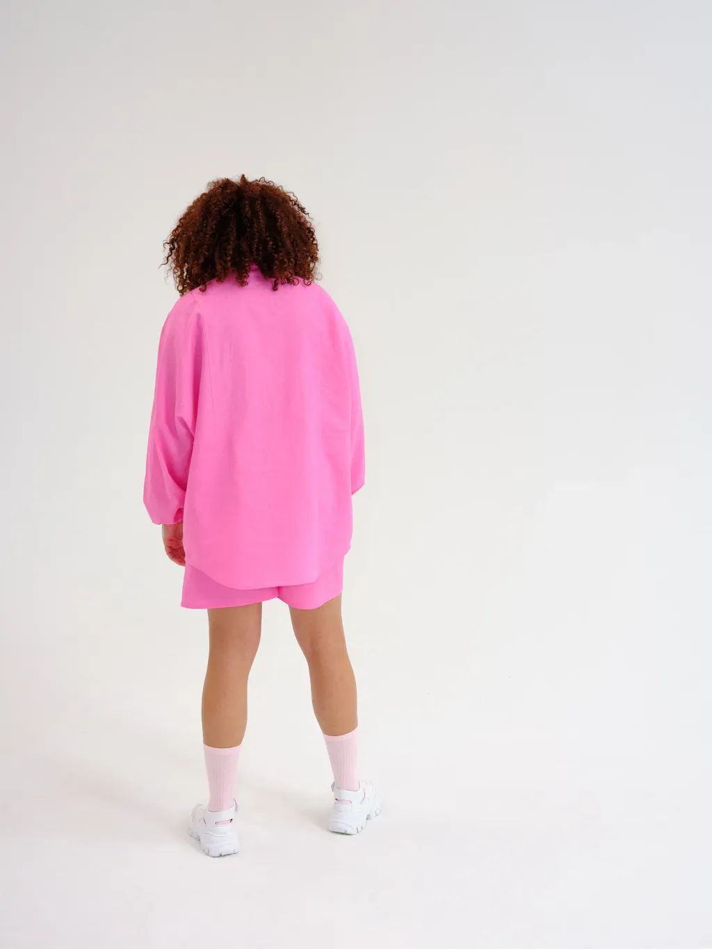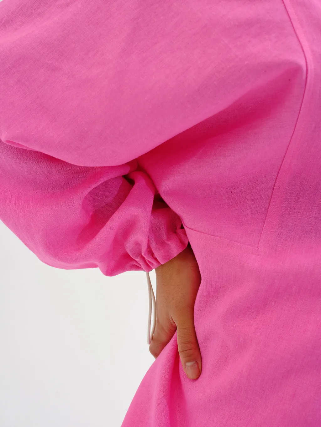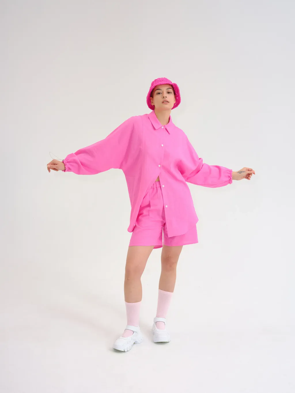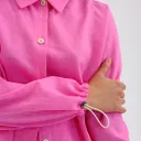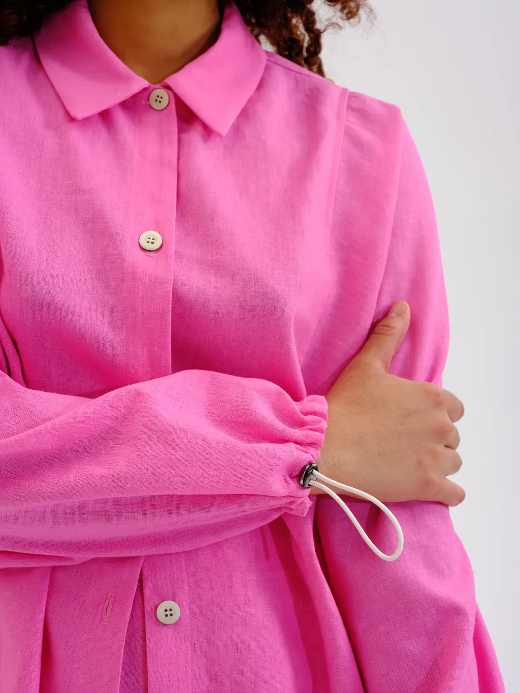 The CHIFA shirt is back in hot pink for the summer! Made in a breezy linen/viscose fabric, the shirt has a long and loose fit with a nice sleeve cut that's very roomy, perfect to be worn alone, on top of your bathing suit or over your favorite t-shirt. The button placket features delicate shell button closure. An elastic is integrated at the wrist to allow you to adjust the sleeve as you like; you can wear it loose and wide, tighten it or pull it up a bit so that it holds in place giving it a little balloon effect.