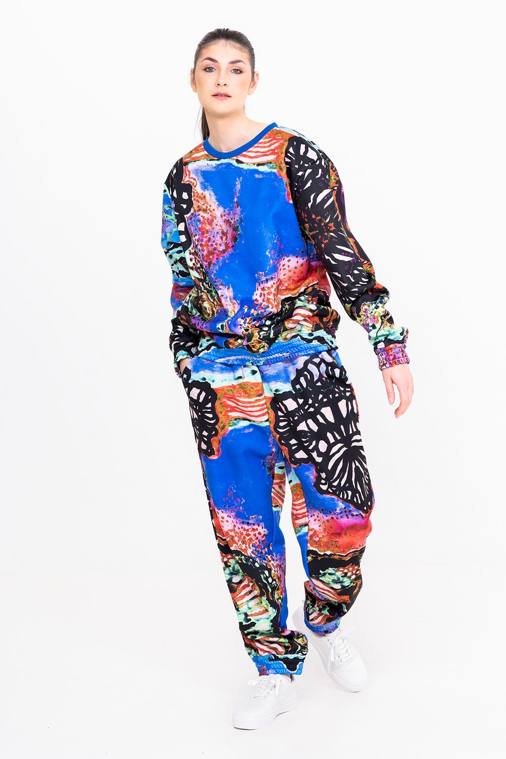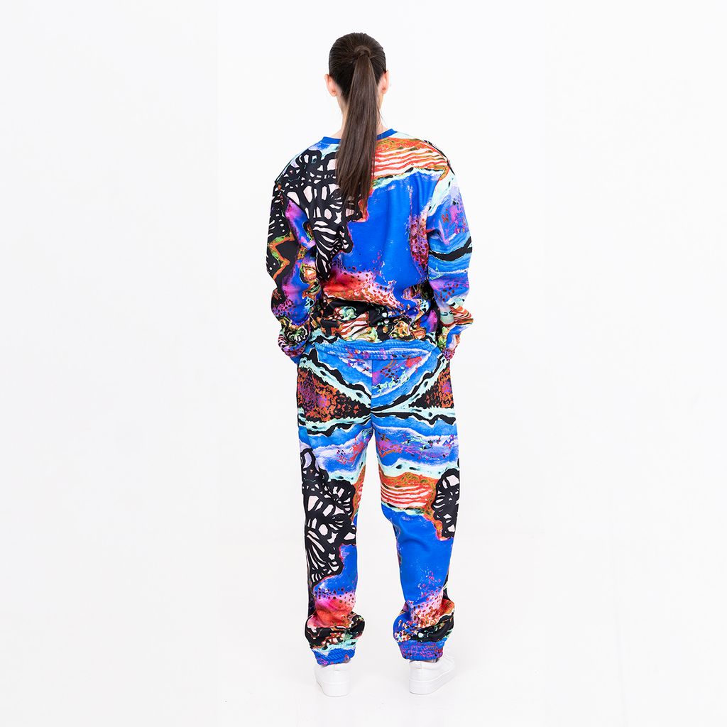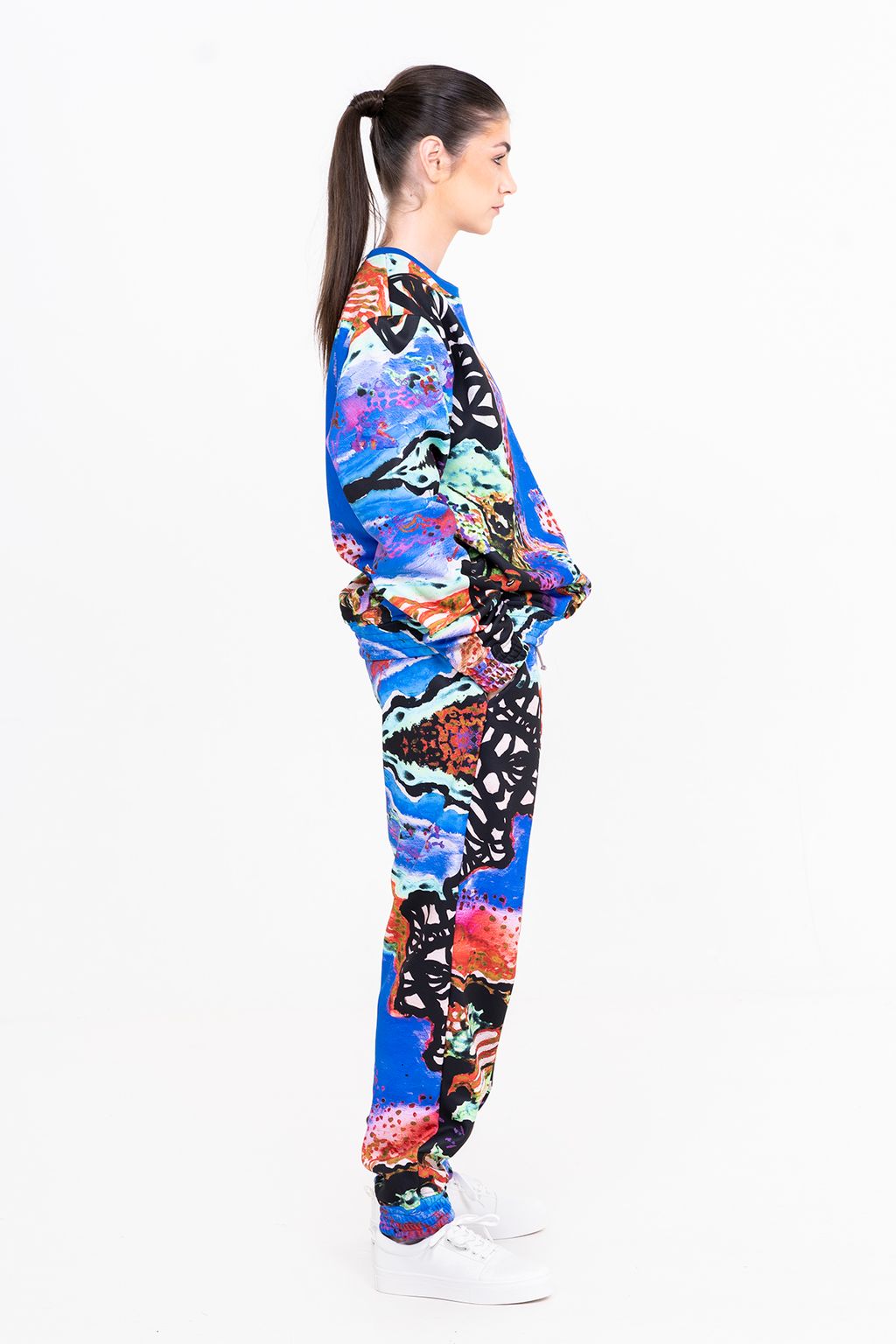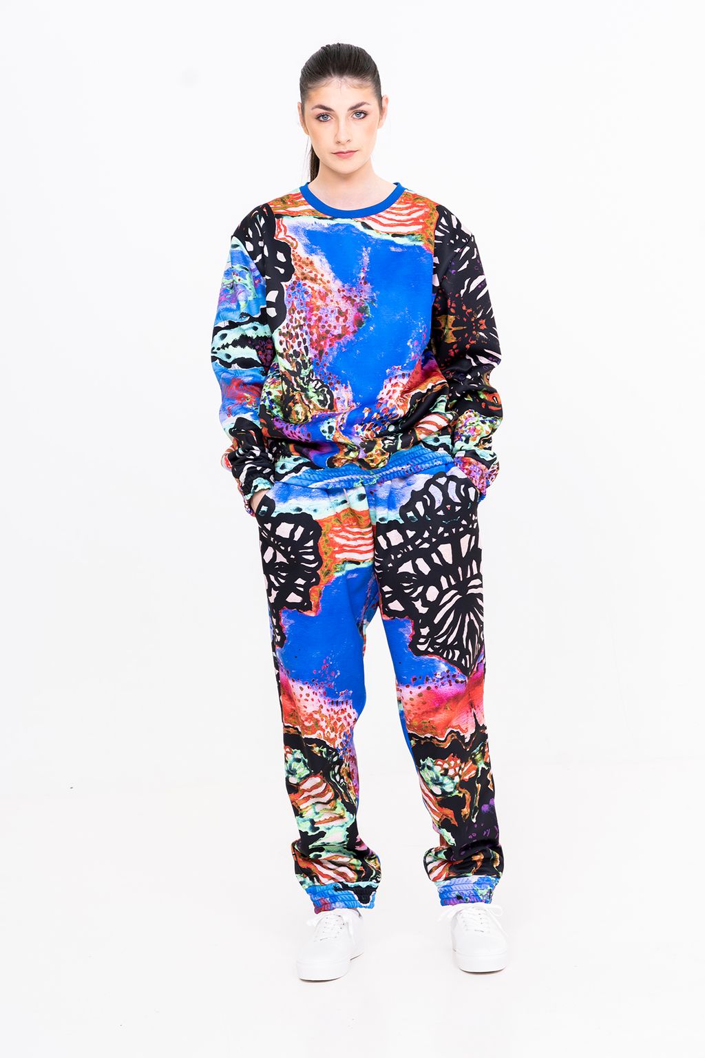 This Looks is an overall Print Statement Look, wear it with white tennis shoes for the perfect look. The crewneck and pants are made with a fleece printed fabric made in Montréal. This is our in house abstract butterfly print. This look is part of a collaboration with the Montrealer's Swimsuit Brand SELFISHswimwear.