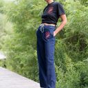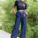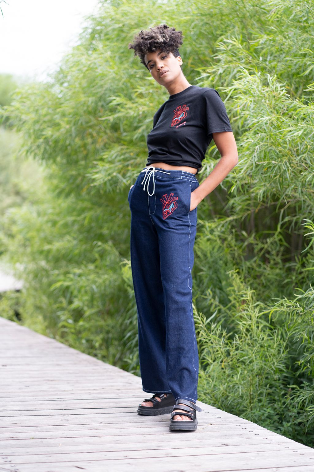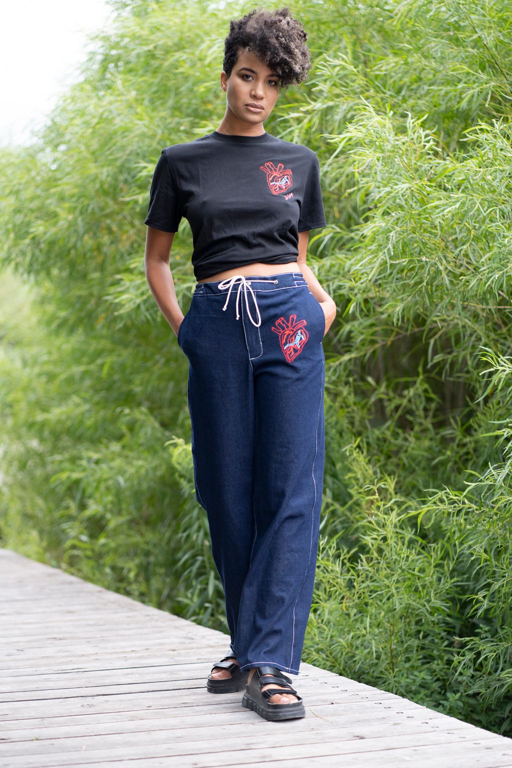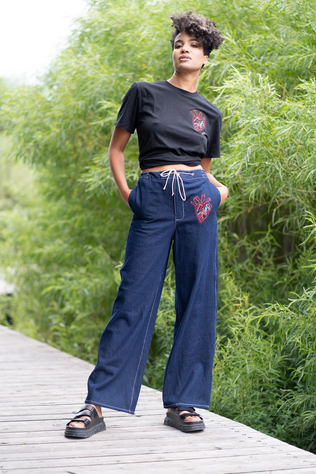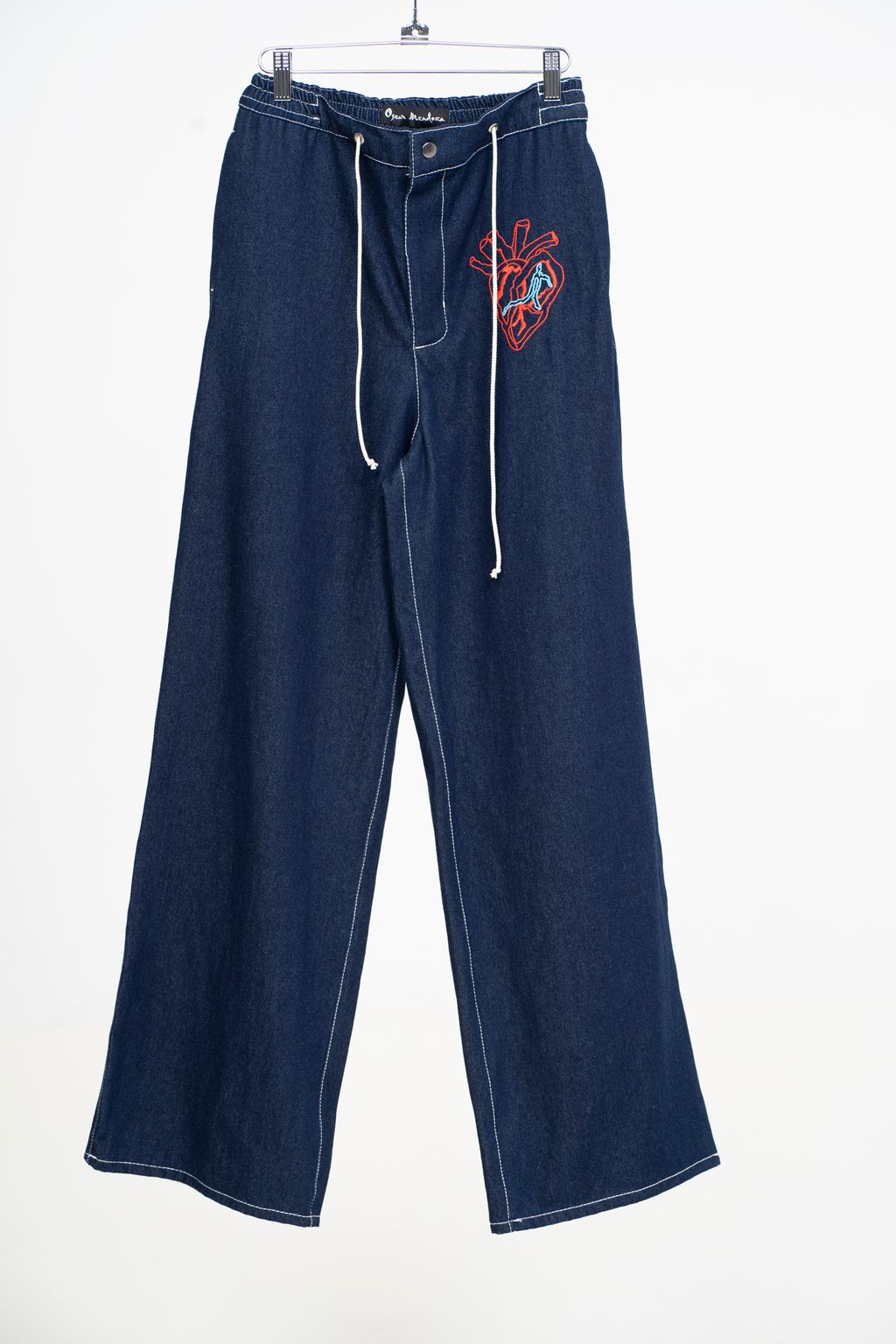Denim Jeans with embroidered Heart. Pefectly crafted jeans pants. Style urban and casual, You can wear it with the Black T-shirt with the same embroidery. Styled the pants with a hoodie, a jacket, trench-coat, sneakers or sandals, even a high heel boat. Be bold and creative with the look.