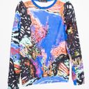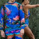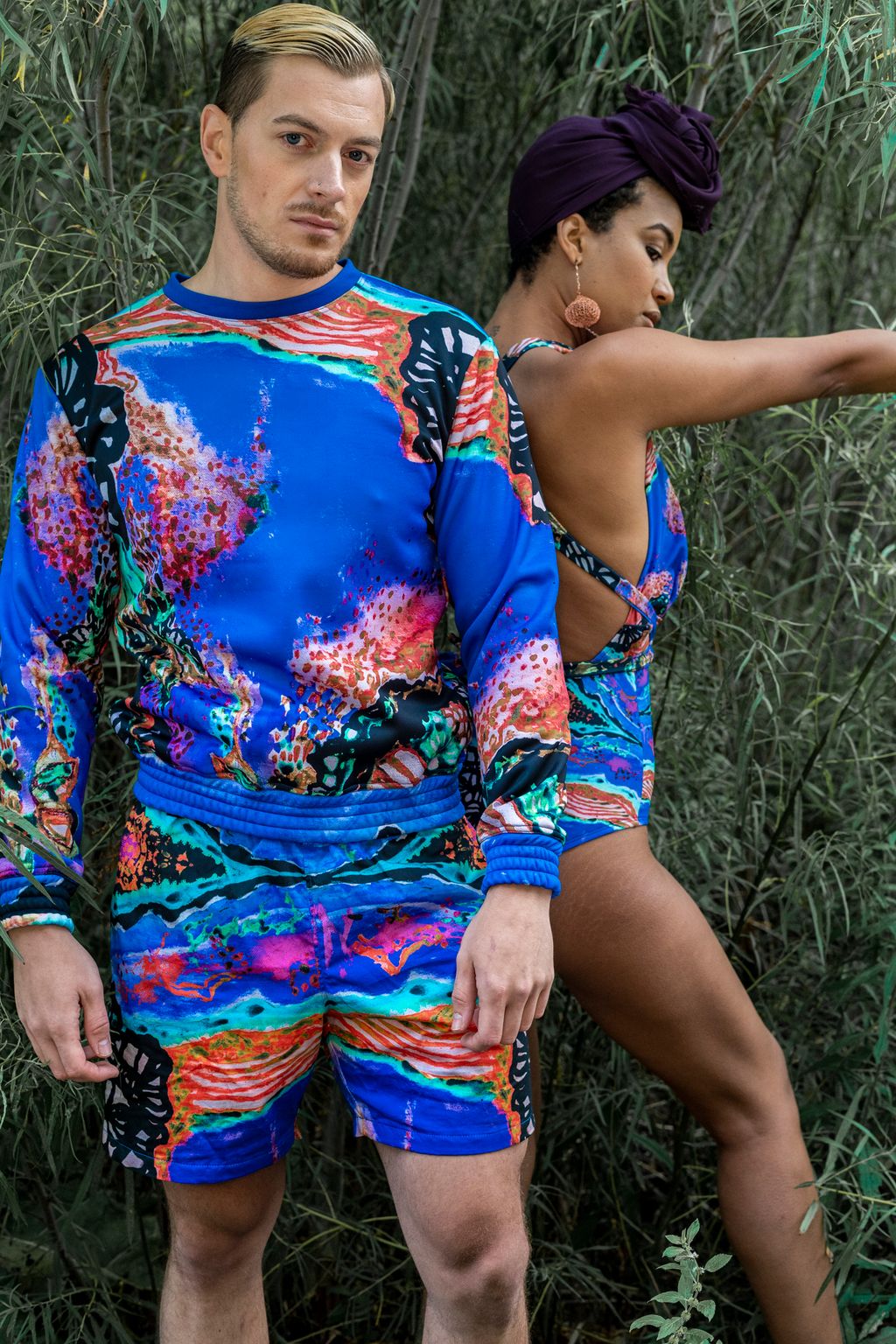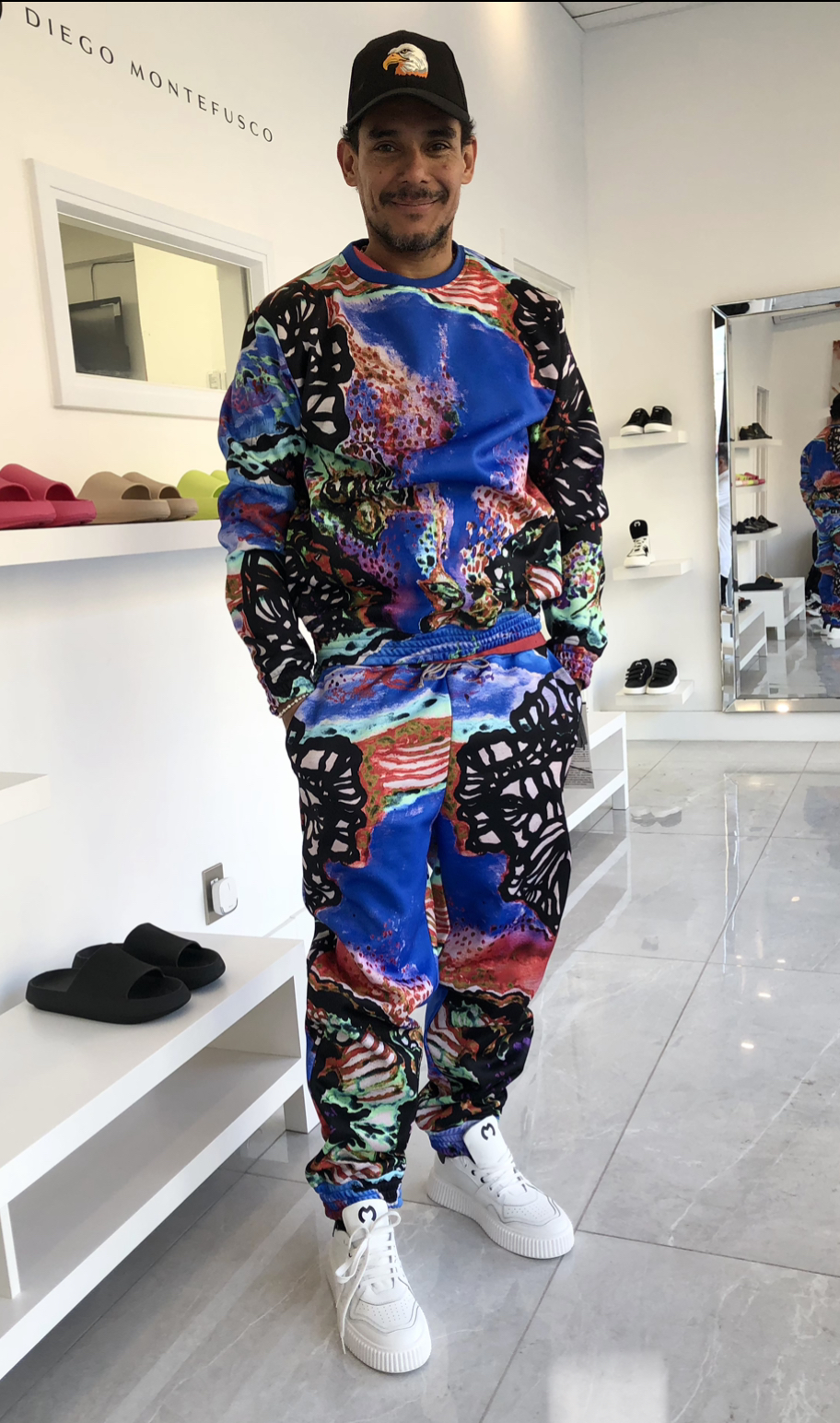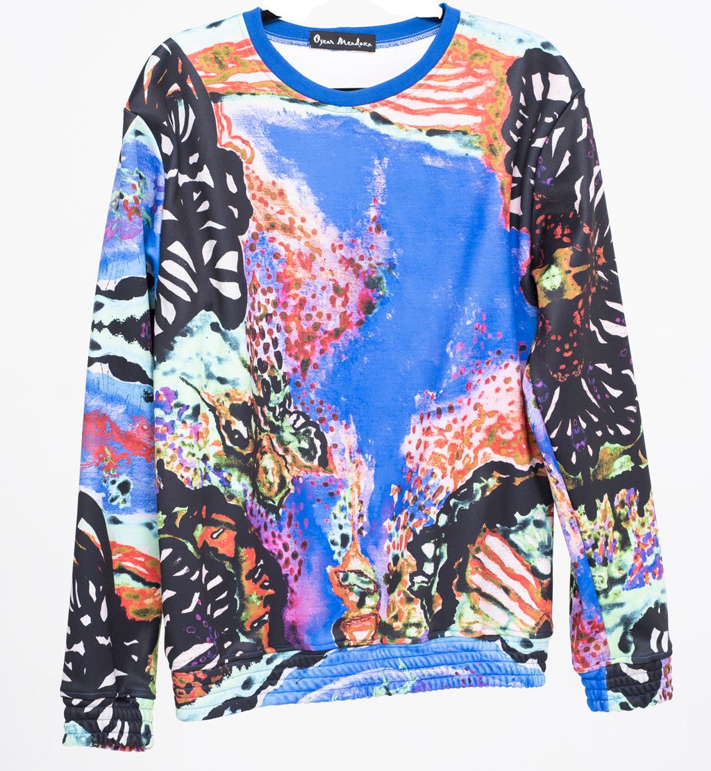 The in-house Abstract Butteflies Print is used to create a one-of-a-kind garment. This can be worn separetely with Jeans, shorts, or the same print sweatpants. Be bold and use your imagination to create your own statement.