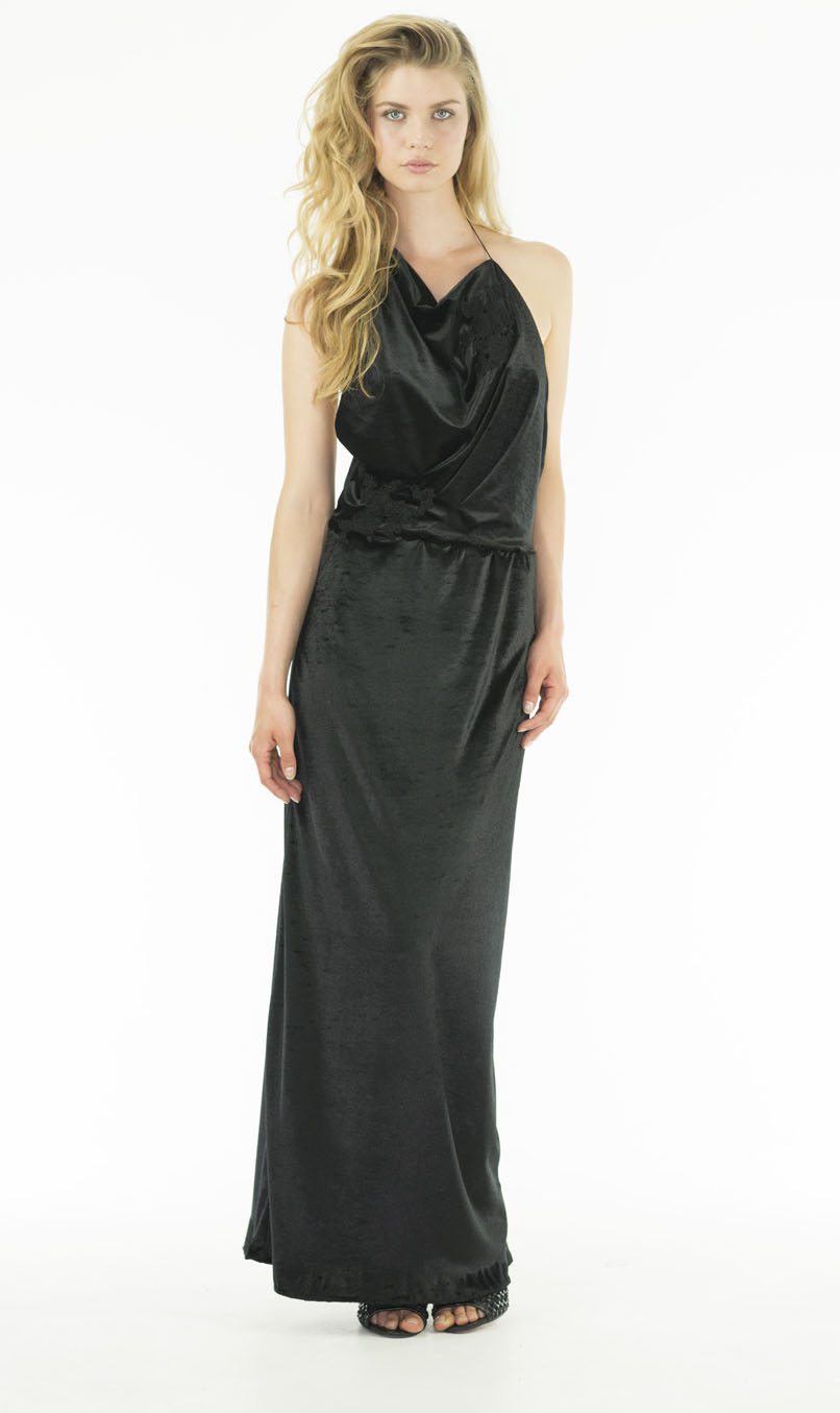 This dress is made with velvet and it is draped, opened back very flattering, no zipper juste very confortable and easy to wear,