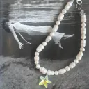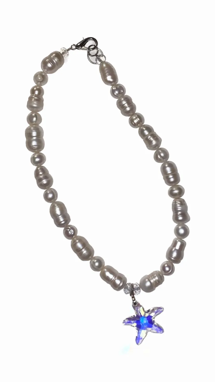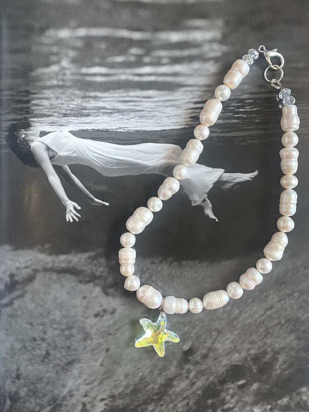 Handmade necklace crafted with freshwater pearls and adorned with a vintage crystal star.