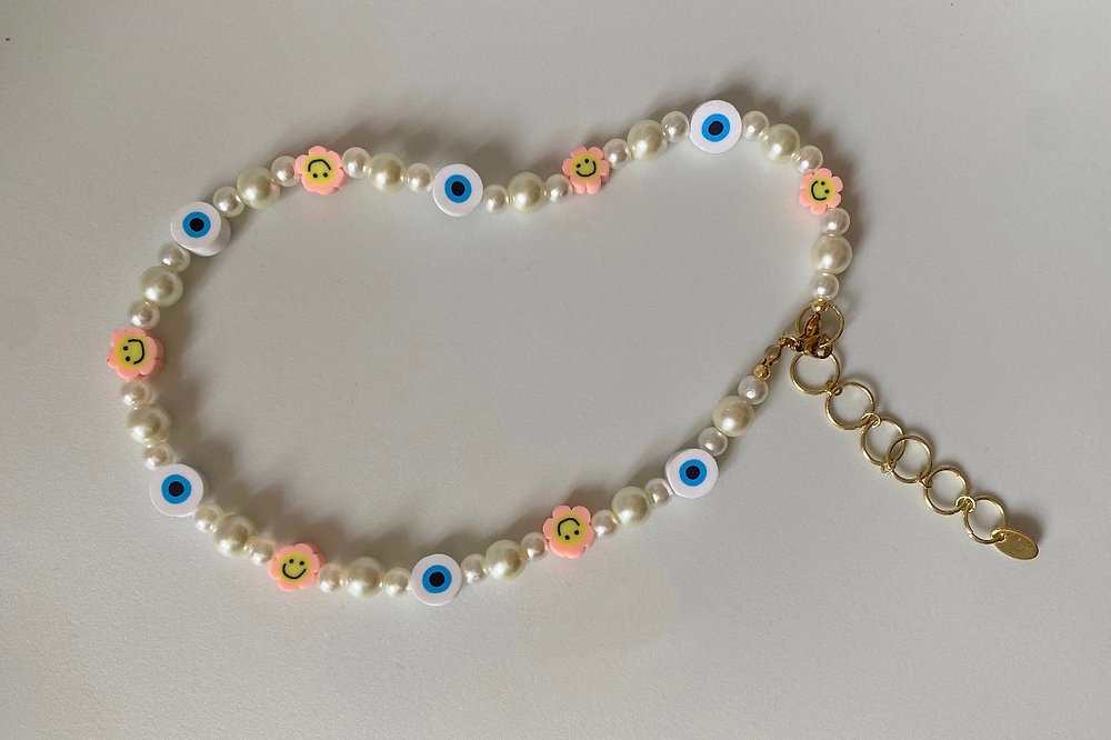 Cutest statement piece to any outfit! Made with synthetic pearls and clay beads. The extended chain and closure are made with Gold Plated 18k, Stainless Steel.
