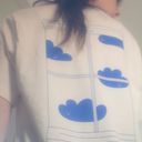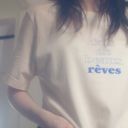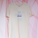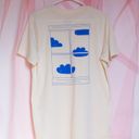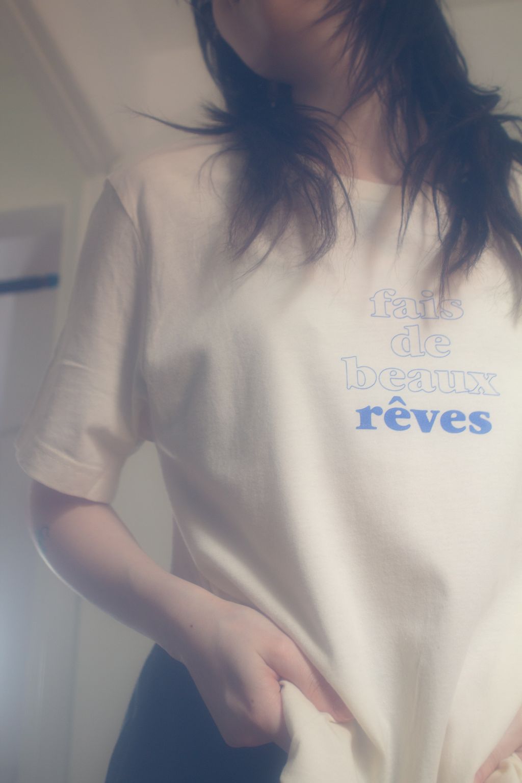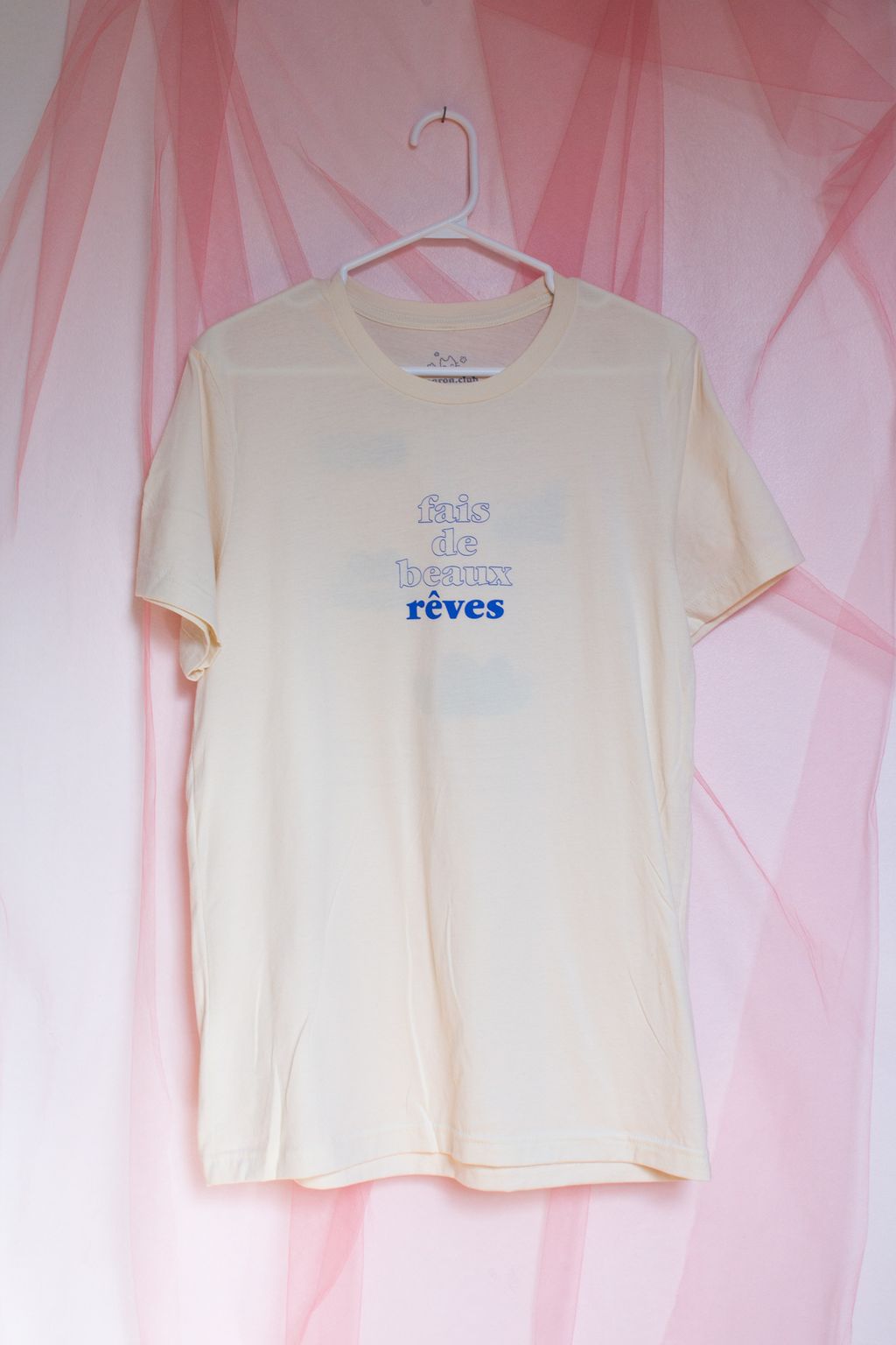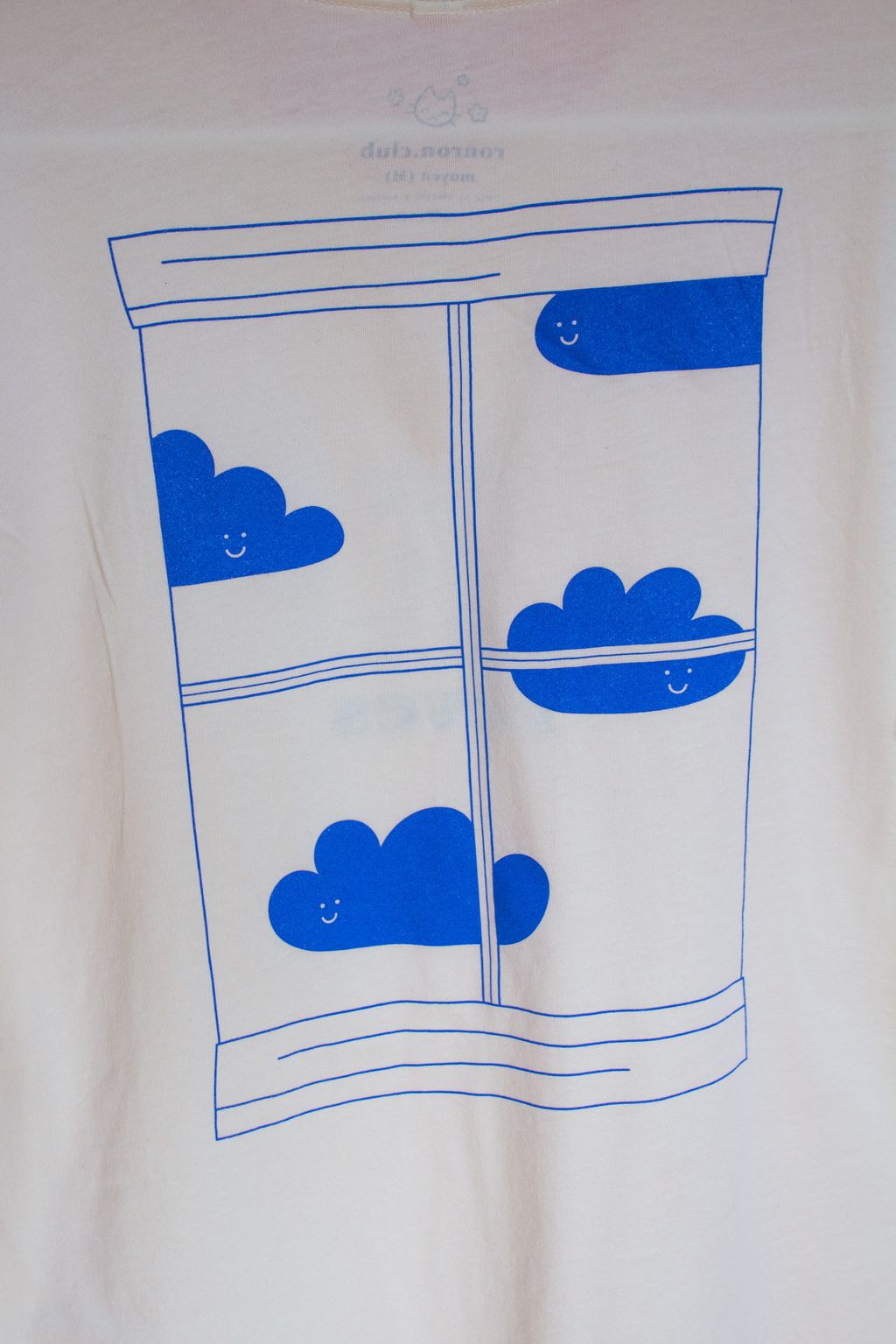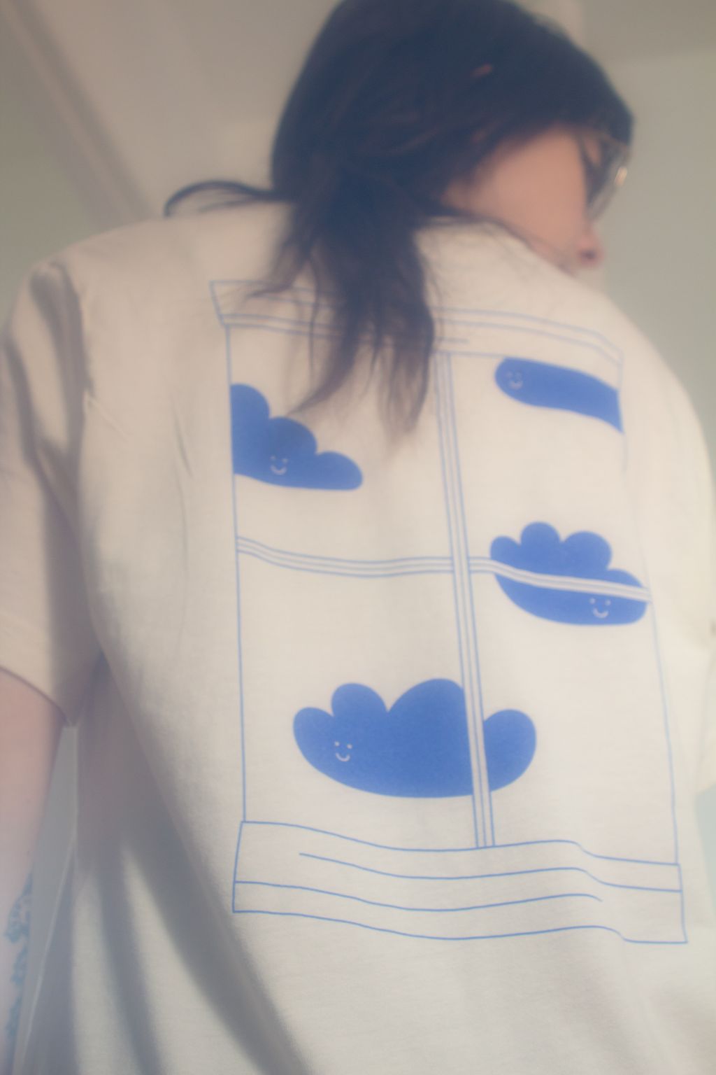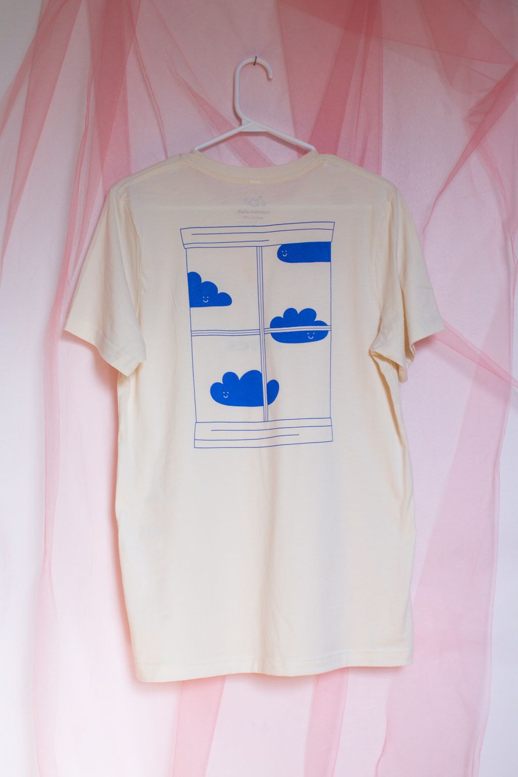 Beige screen printed t-shirt with an illustration of a window on the back. Intended for dreamers!