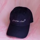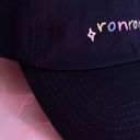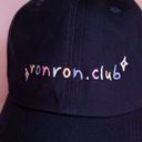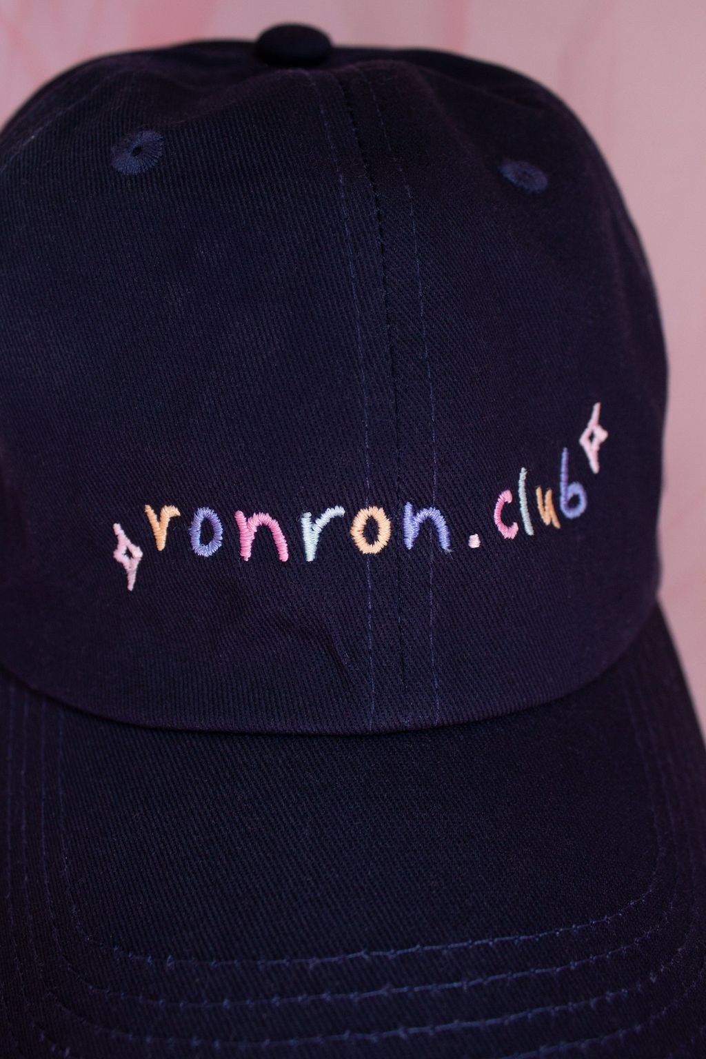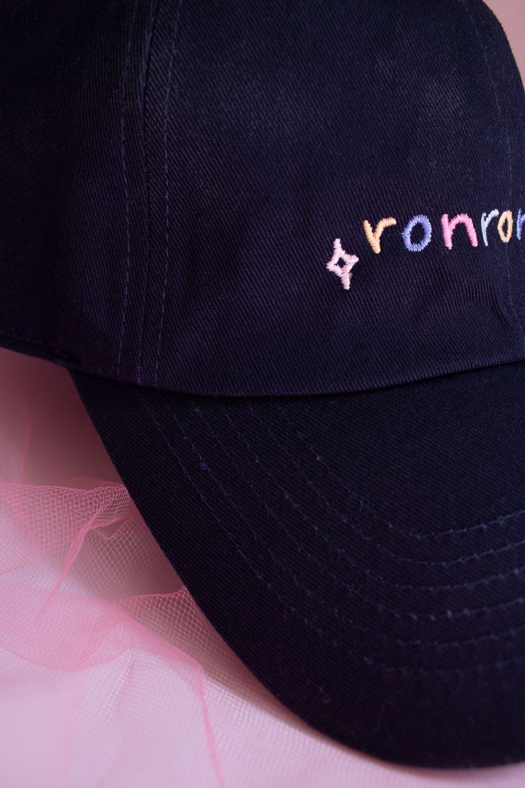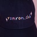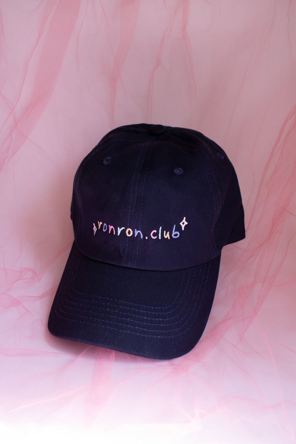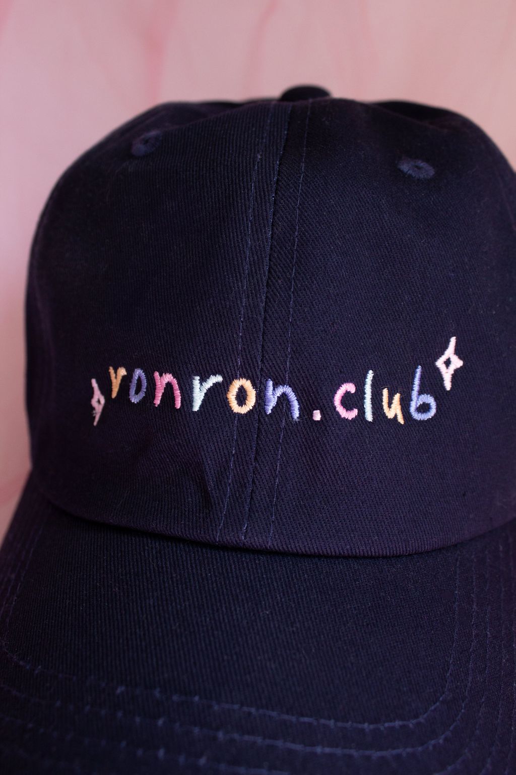 Navy blue hat with pastel rainbow "Ronron.club" embroidery.