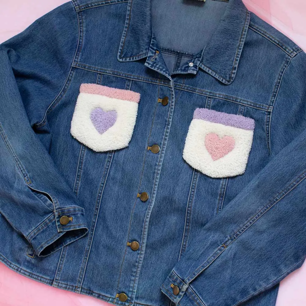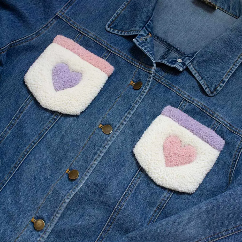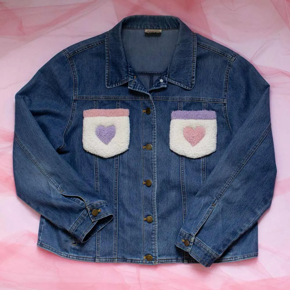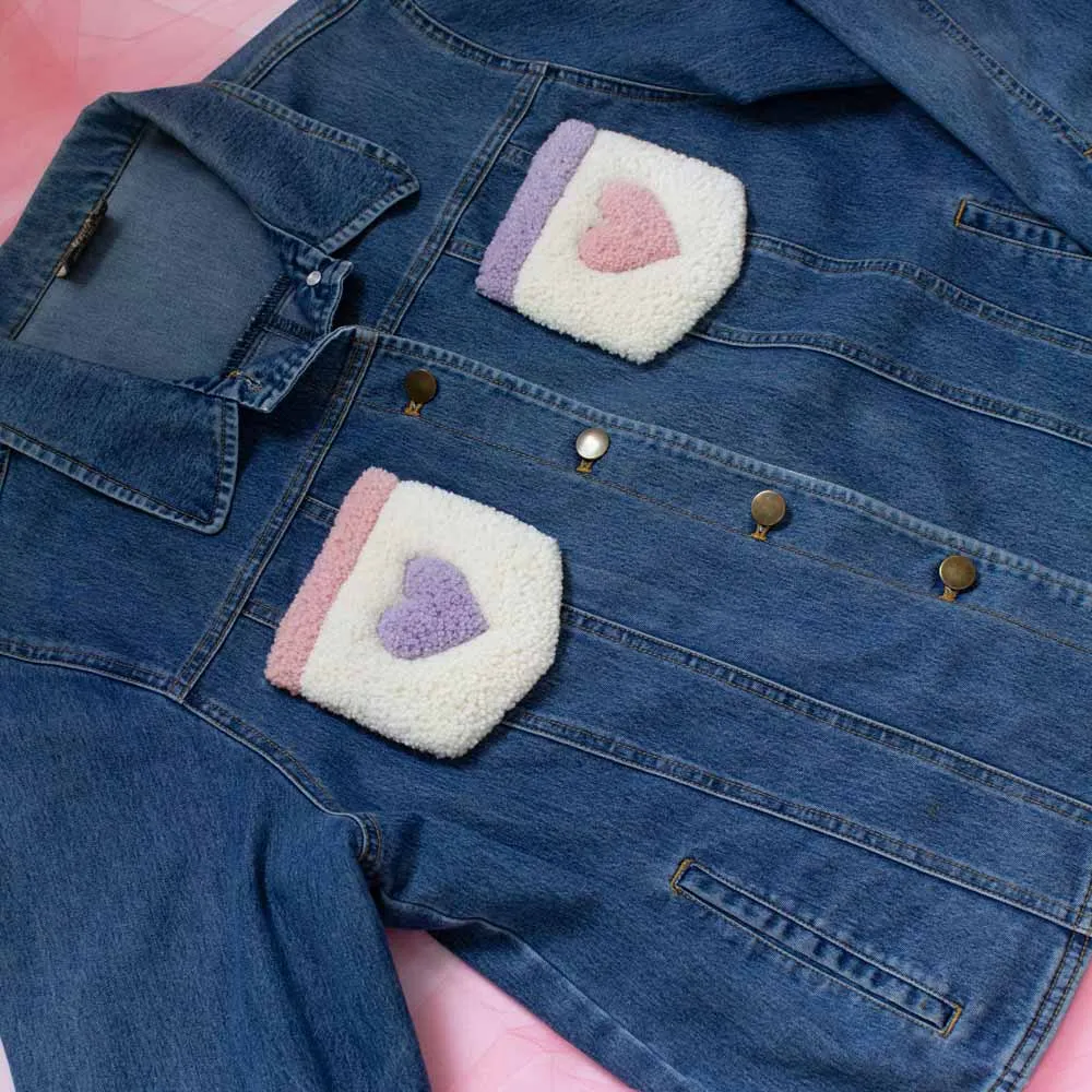 Denim jacket upcycled with two small hand-tufted rugs. This is my first piece from the upcycled clothing collection decorated with tufted rugs.