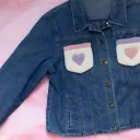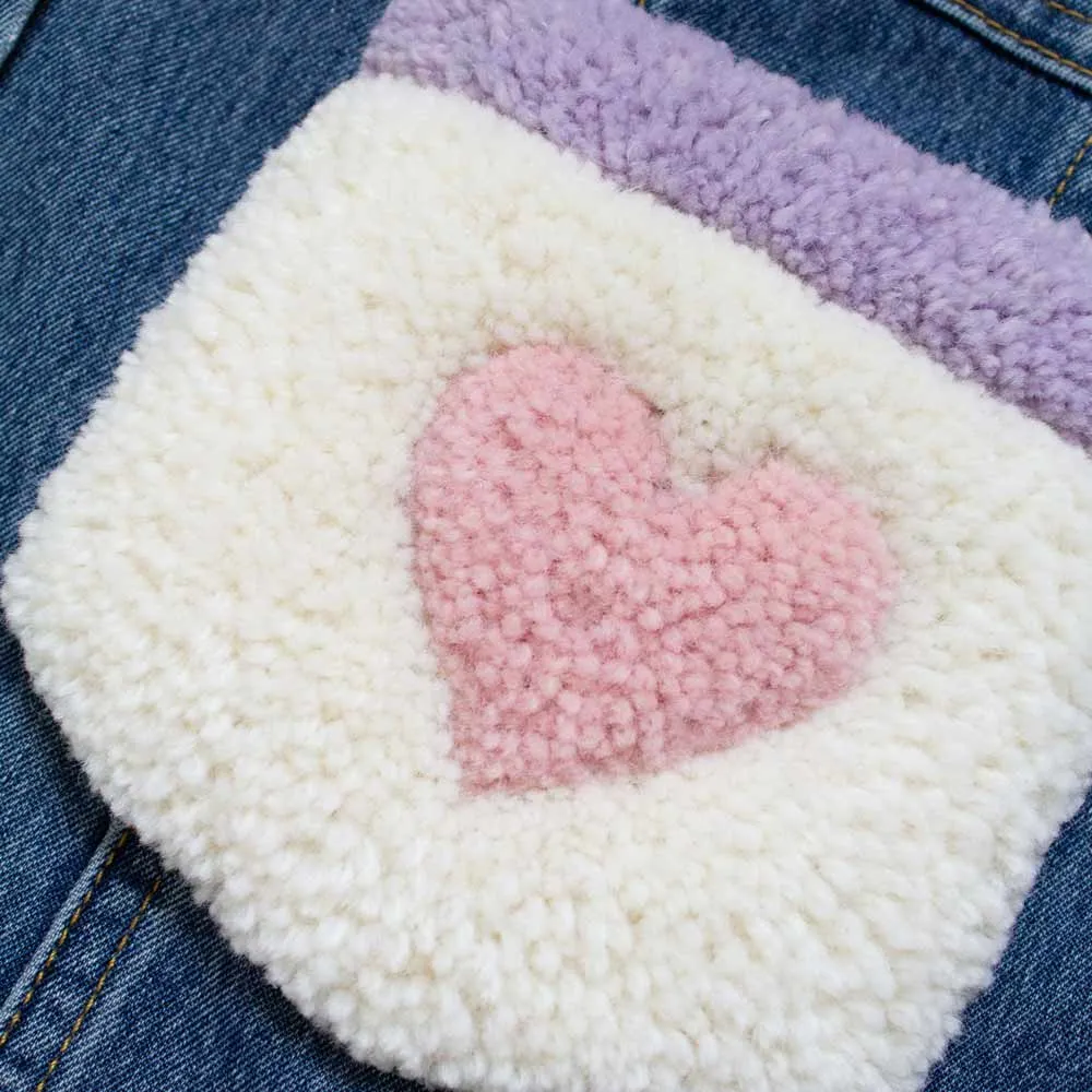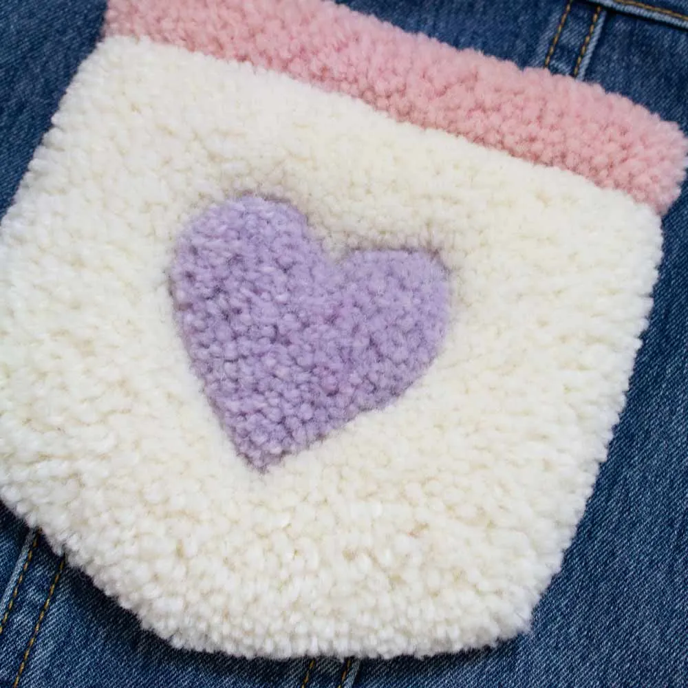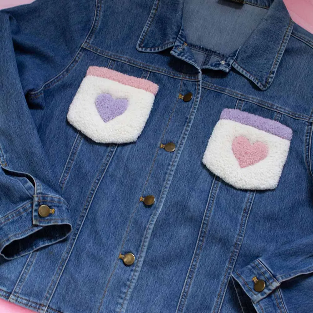 Denim jacket upcycled with two small hand-tufted rugs. This is my first piece from the upcycled clothing collection decorated with tufted rugs.