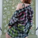 The details on this garment are stunning! Lined edges with multicoloured imitation pearls and a hand-made pearl flower button adorn this incredible piece. Hand painted flowers fall atop the hand-dyed light blue and black plaid, finished with multi-coloured imitation pearls in the centre.