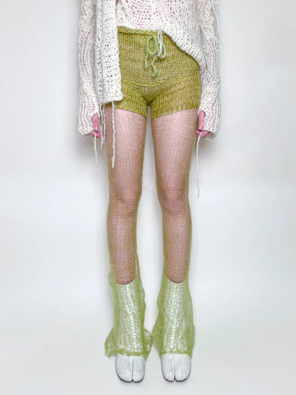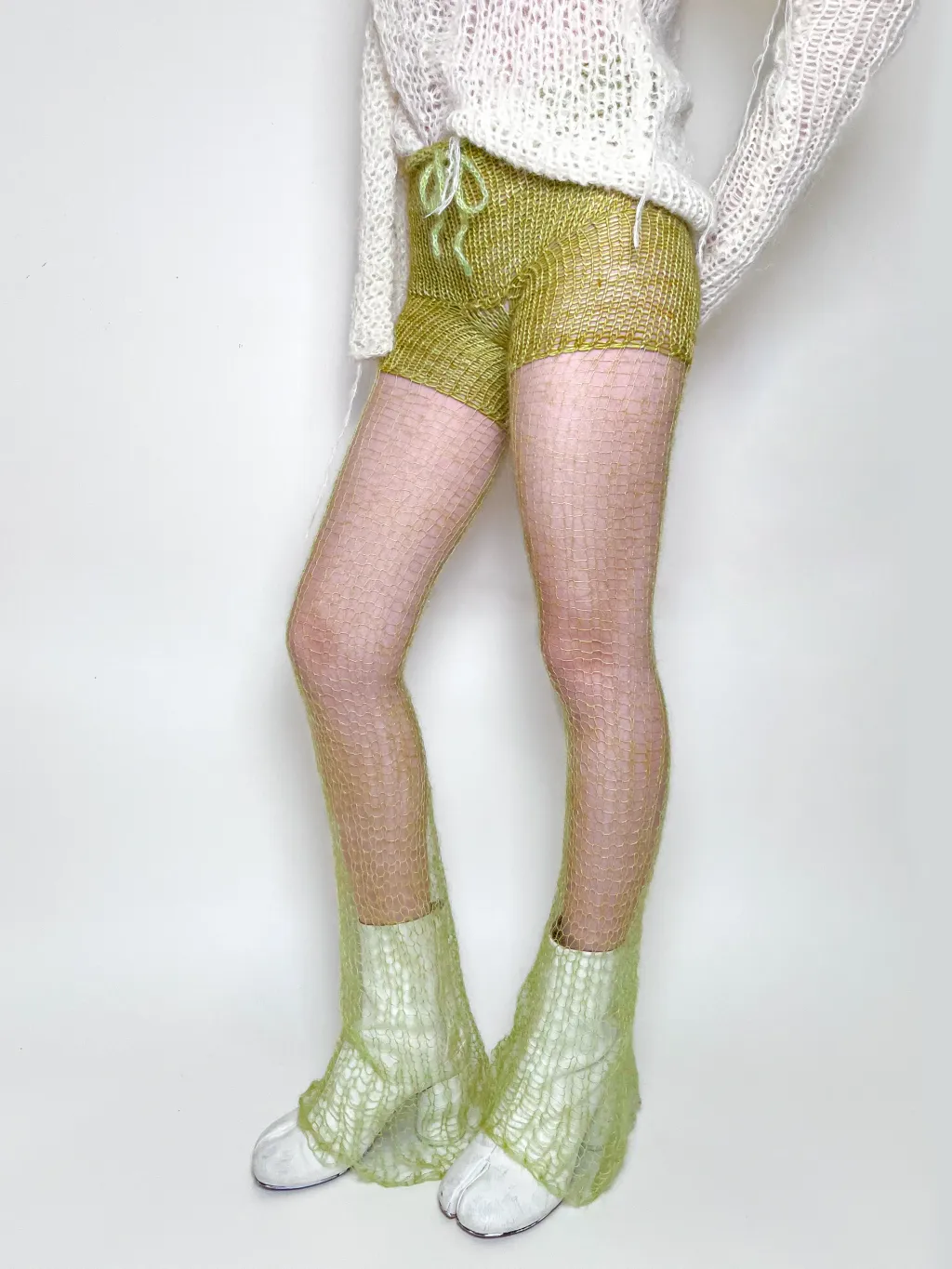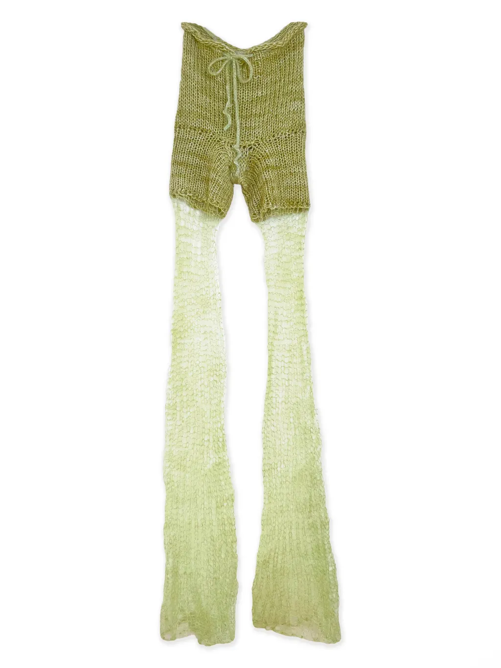 Hand-knit pants with see-through flared mohair pant legs. Includes an adjustable drawstring closure at the waist.