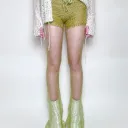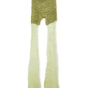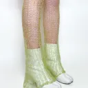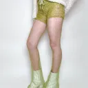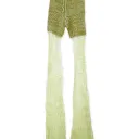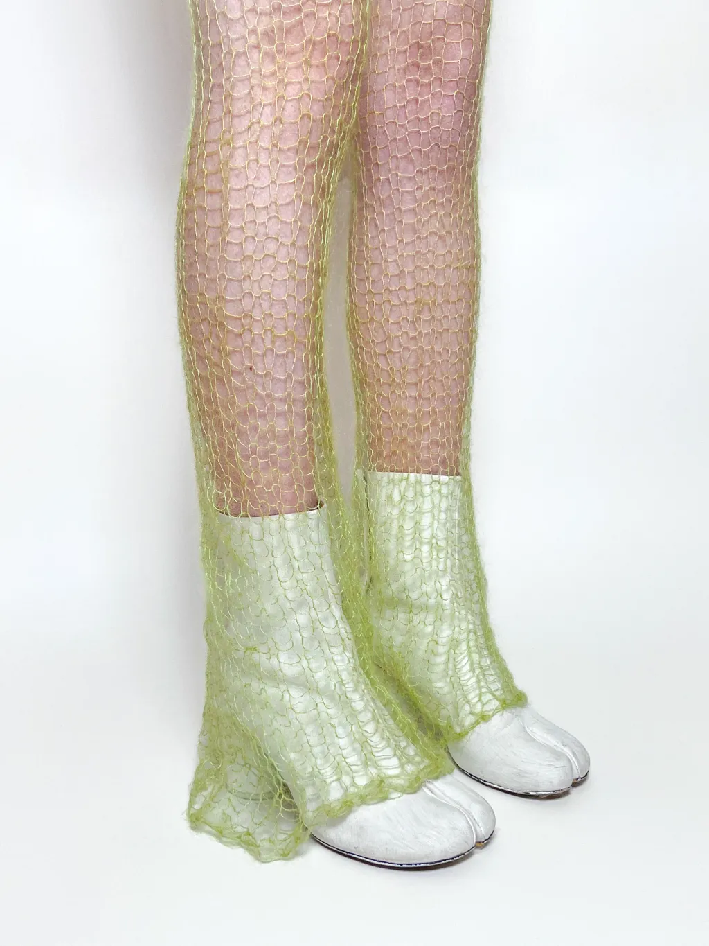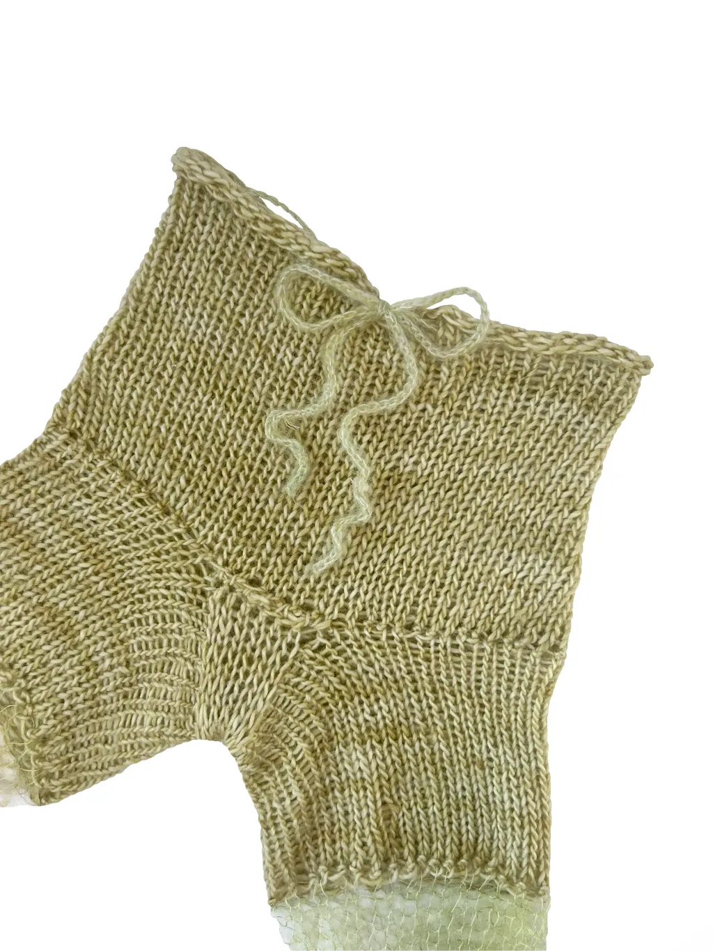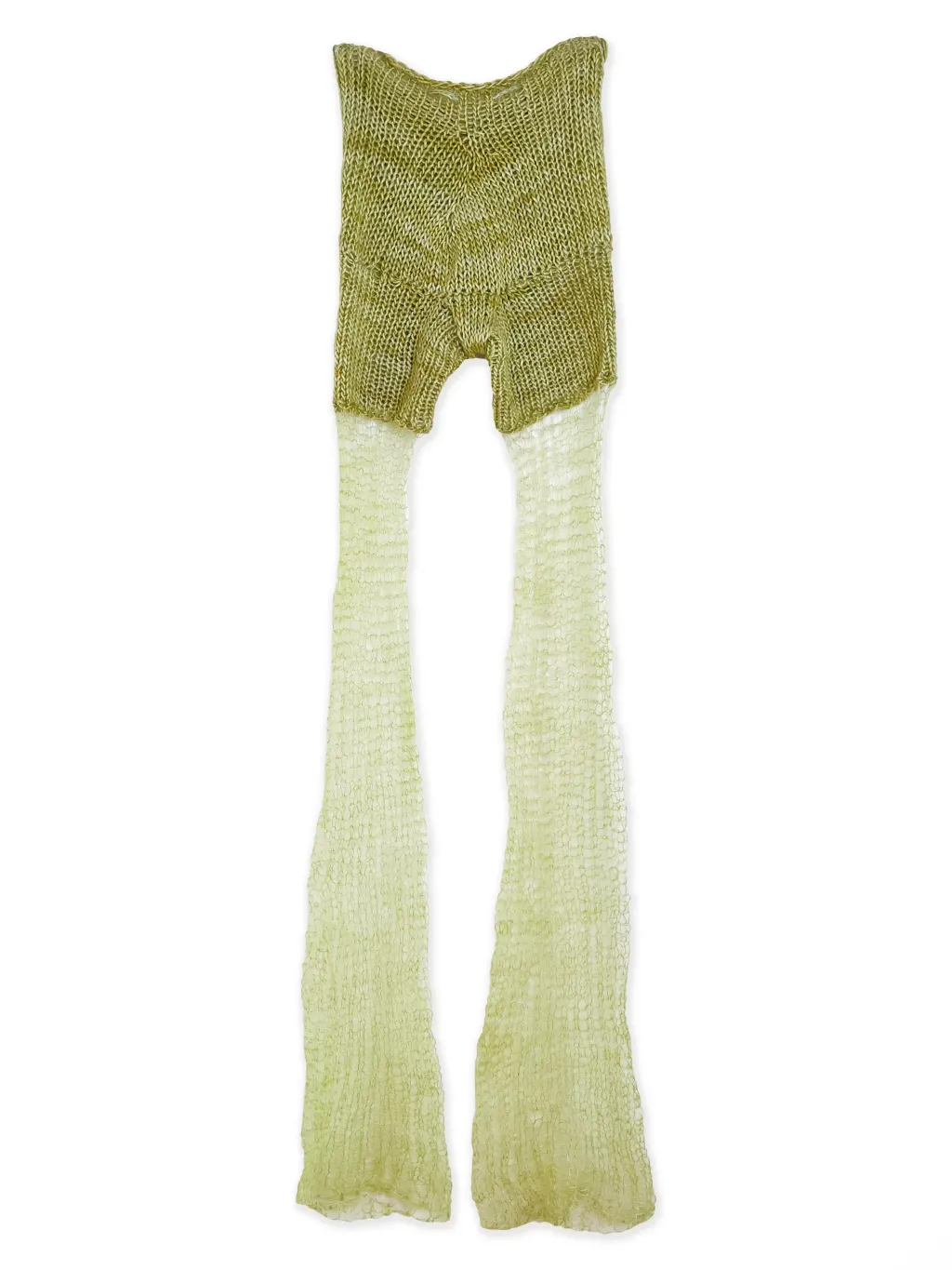 Hand-knit pants with see-through flared mohair pant legs. Includes an adjustable drawstring closure at the waist.