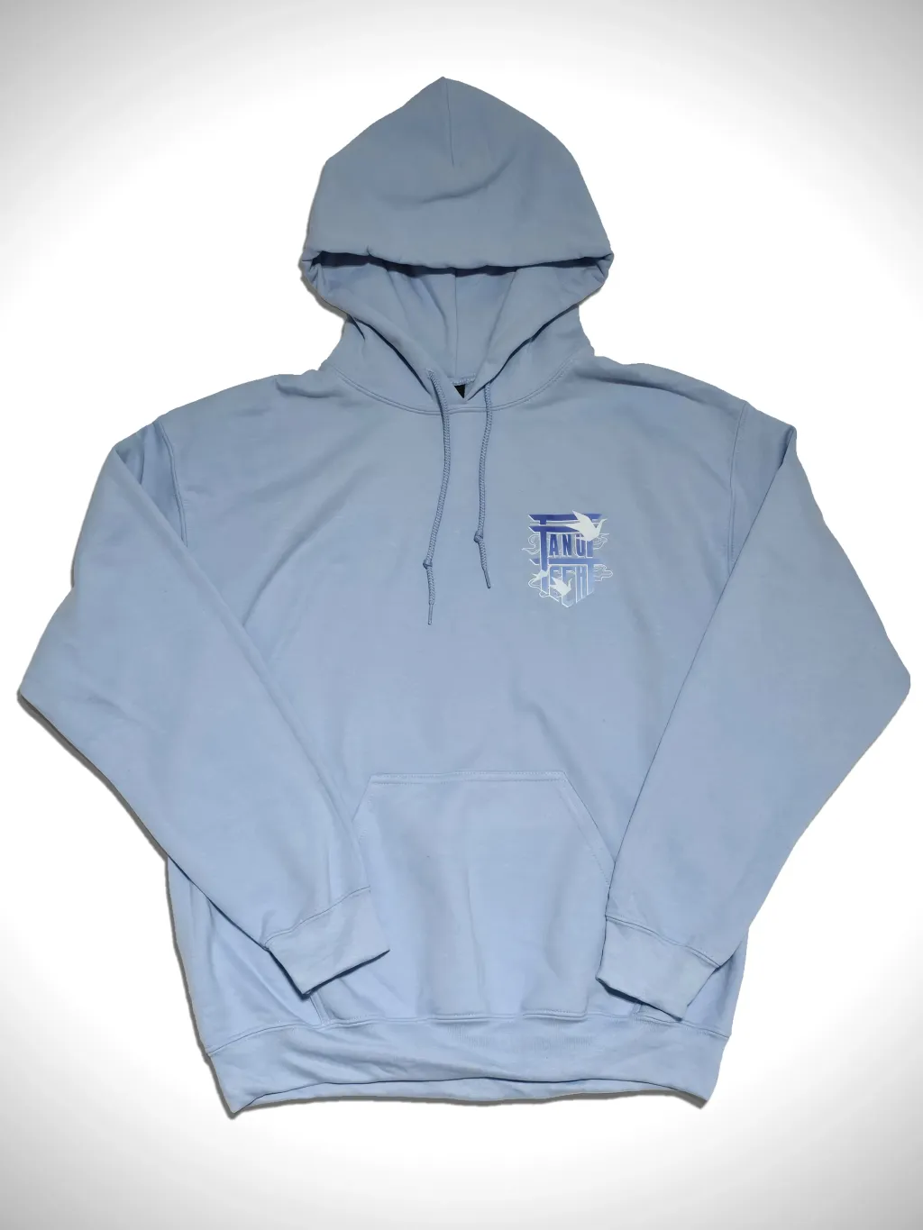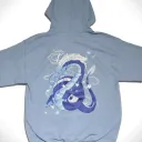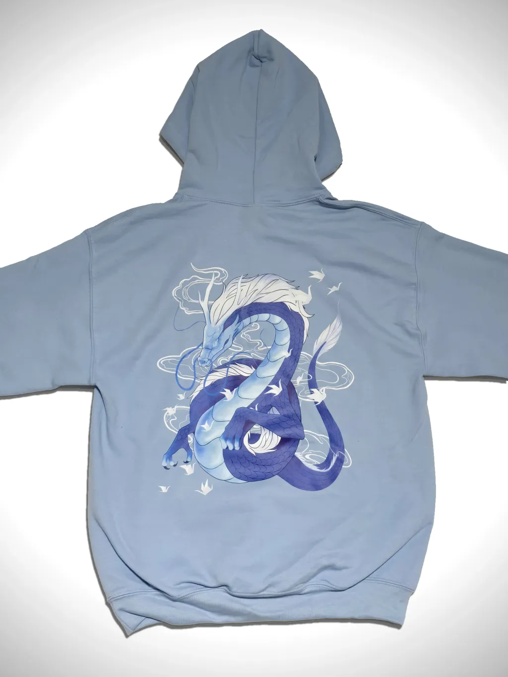 This captivating design features a soothing blue water dragon with a flowing white mane, blending the grace of Chinese and Celtic influences. Delicate origami cranes swirl around, enveloped in soft white wisps of smoke. A matching logo on the front completes this harmonious and striking creation.
