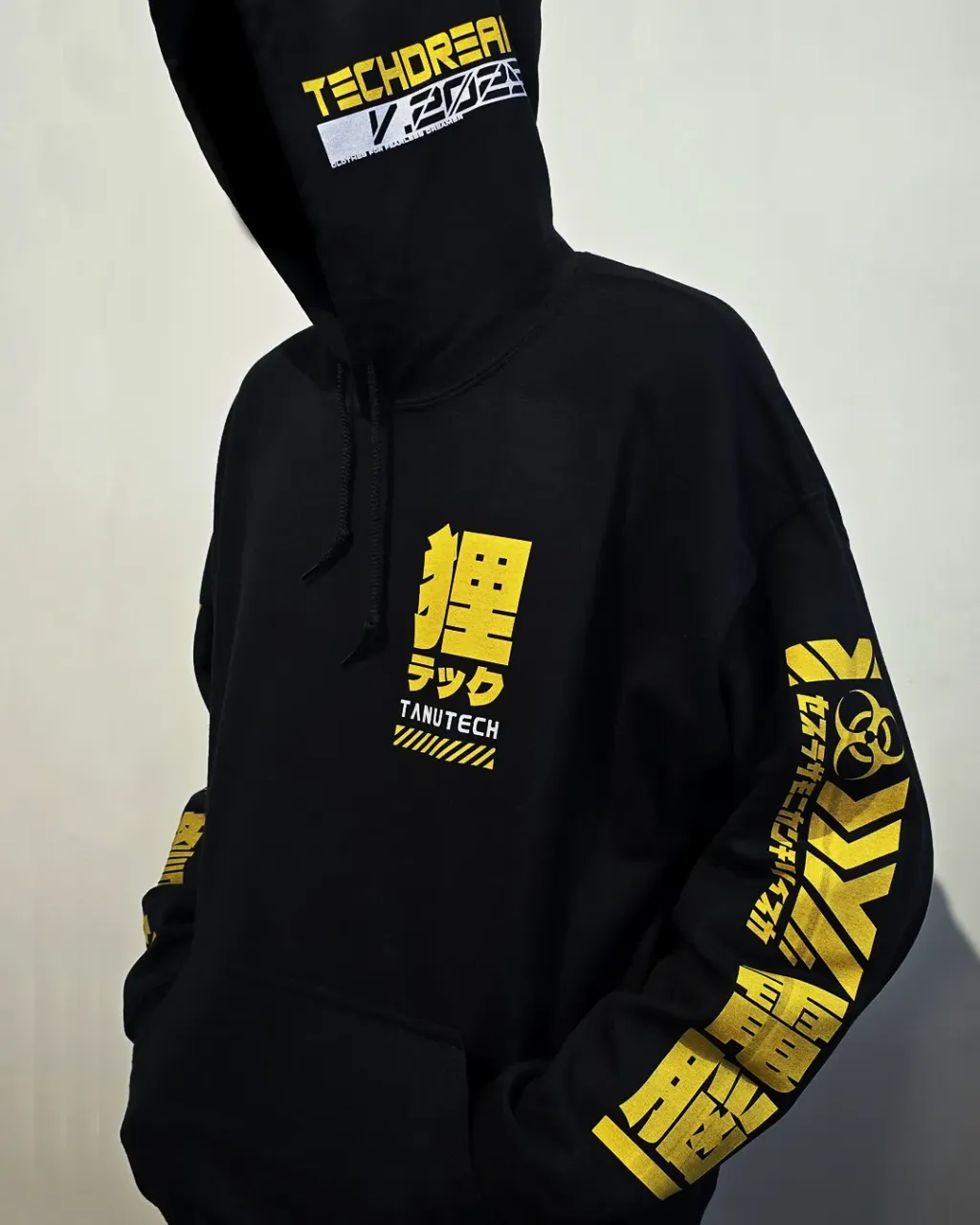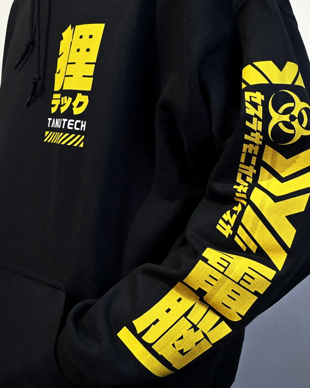 Front: Tanuki kanji logo and Techwear.