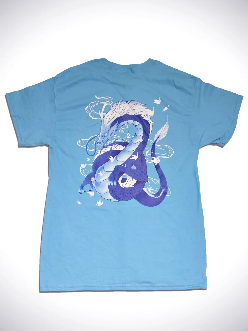 Add a touch of sky blue to your everyday style with our brand-new design, featuring a majestic blue and white dragon—symbol of power and wisdom—accompanied by delicate paper cranes.