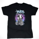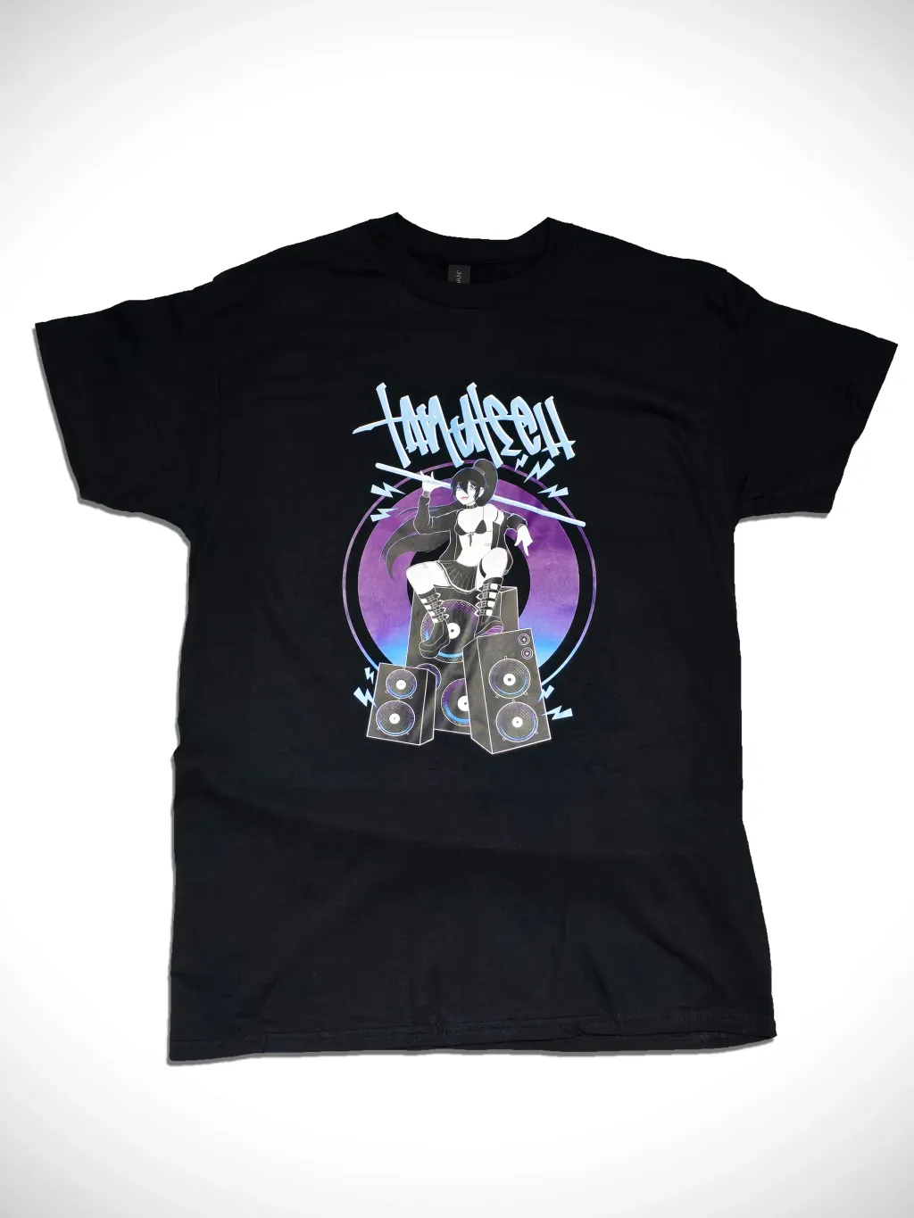 This exclusive piece features a detailed front illustration of an anime girl holding a glowing neon light, sitting on concert speakers. A design that captures the vibrant energy and festive spirit of electro nights.