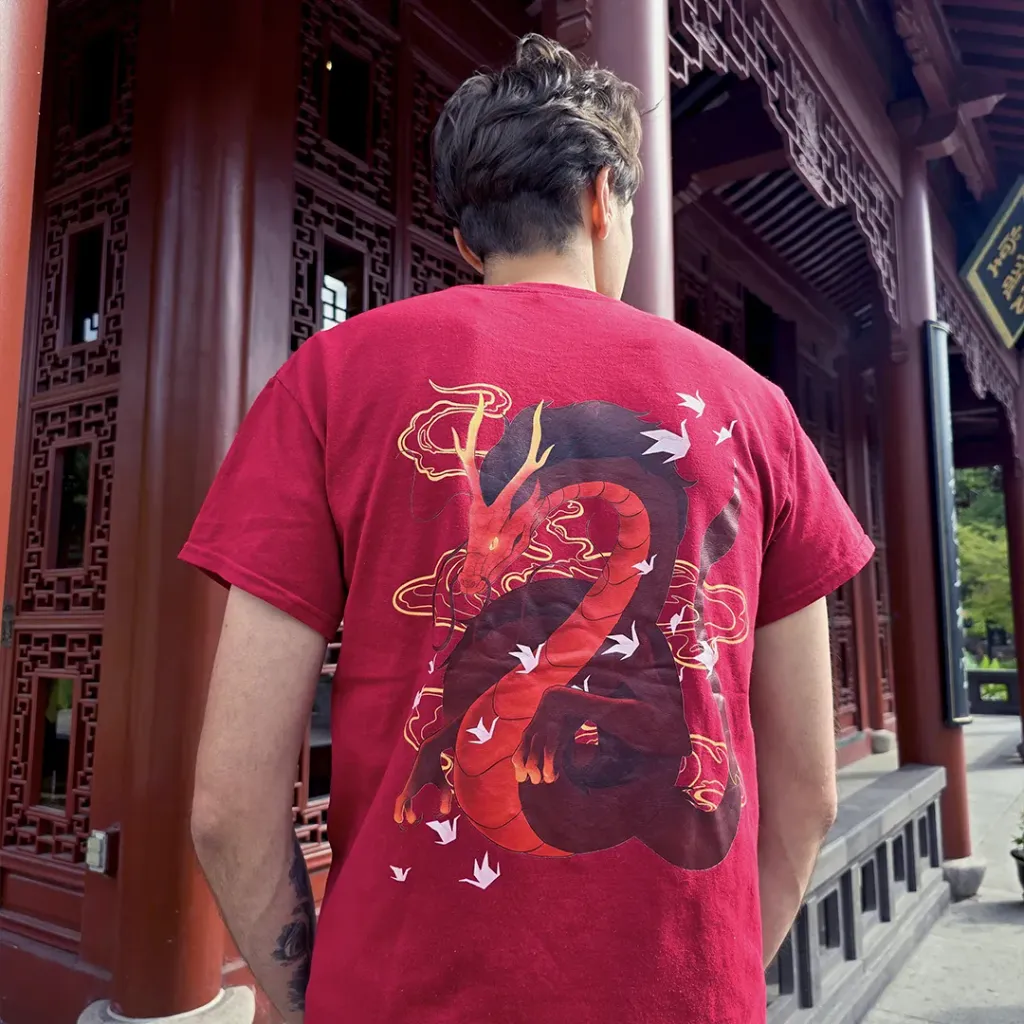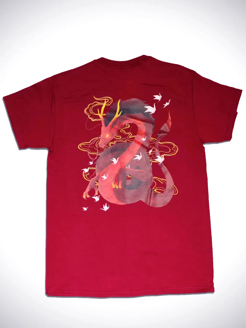 Add a bold touch to your everyday style with our striking new red design, featuring a majestic red dragon—symbol of power and strength—accompanied by delicate paper cranes.