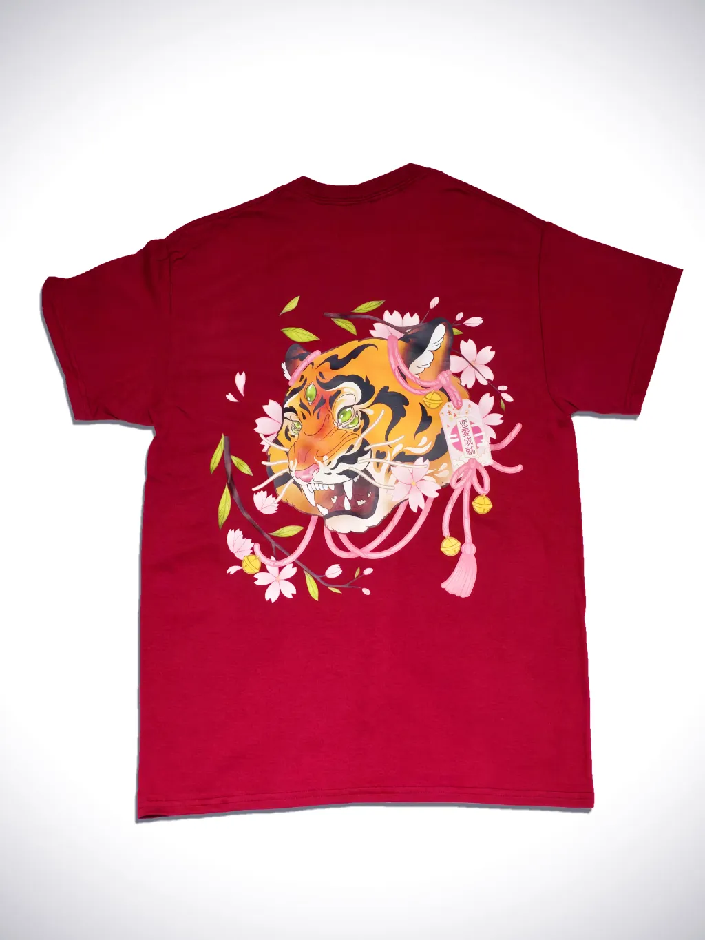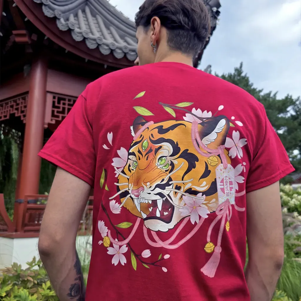 Add a bold and mystical touch to your style with our striking design featuring a radiant tiger with five piercing eyes. Surrounded by elegant branches and sakura petals, this tiger is accompanied by Japanese omamori, symbols of protection and good fortune.