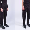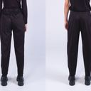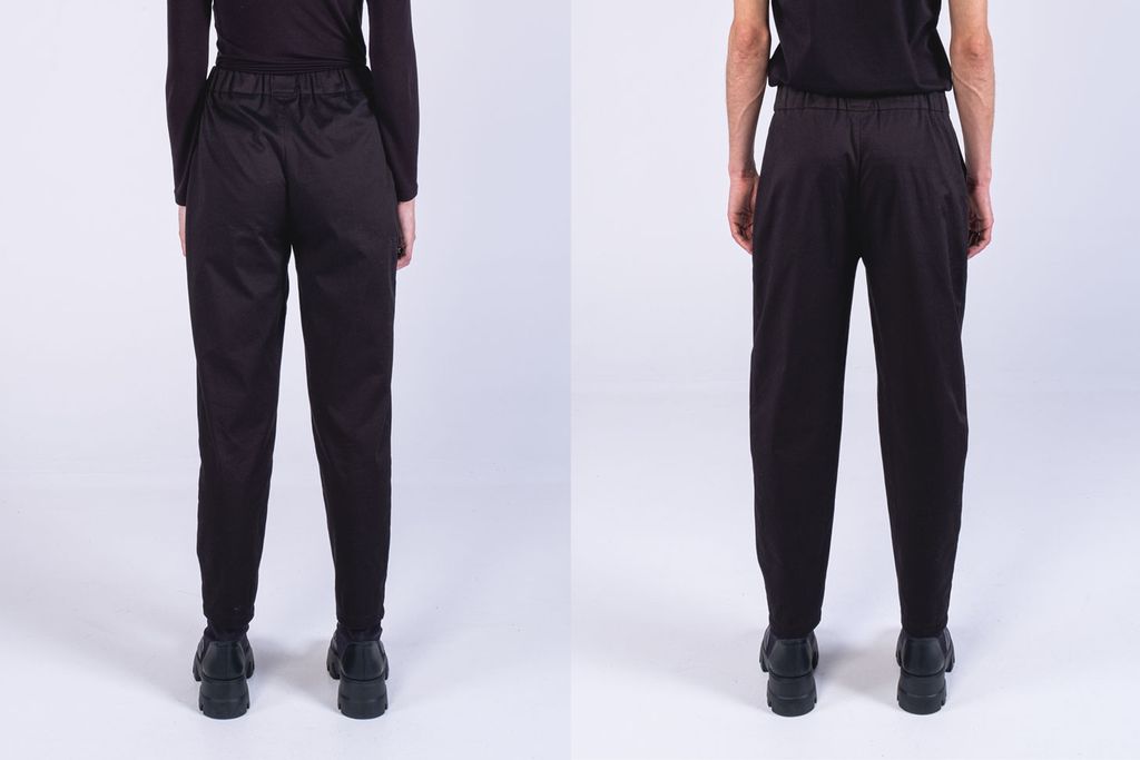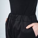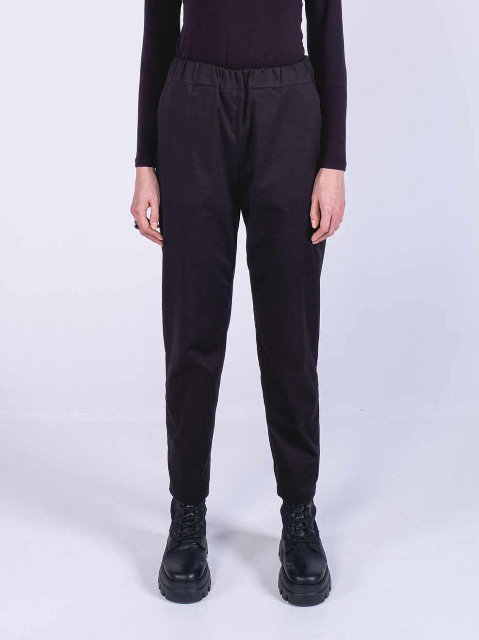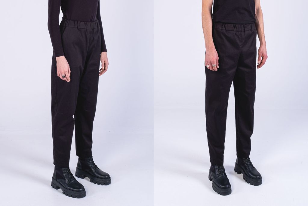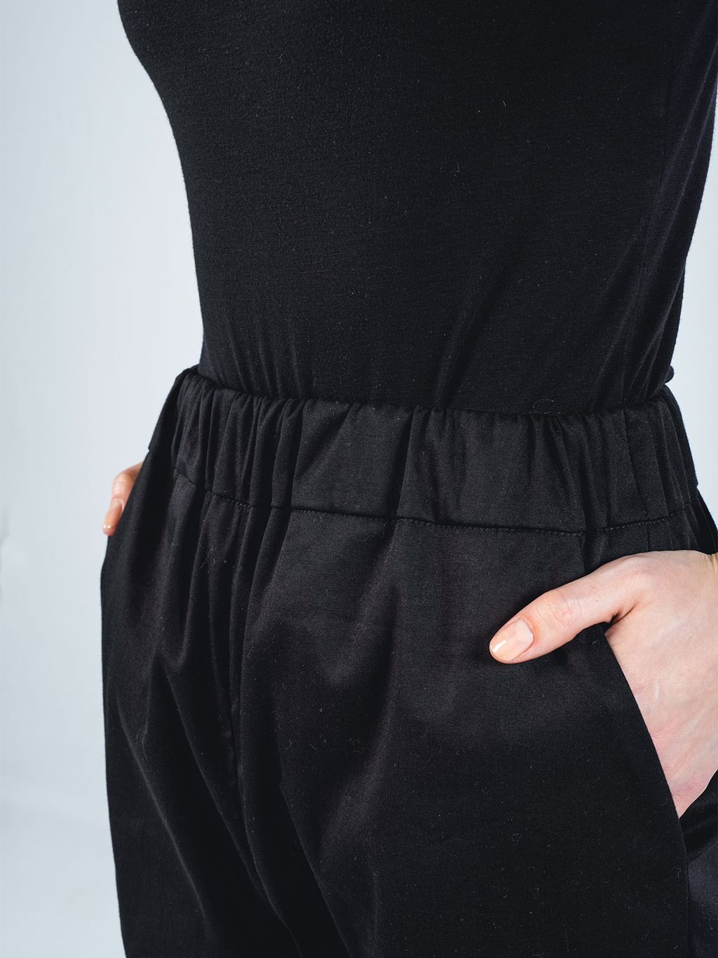 Ce pantalon noir en satin de coton italien est un basique à ajouter à votre garde-robe. De coupe ample, avec une jambe fuselée et une bande de taille élastique, il est fabriqué dans un tissé de haute qualité : doux et compact, de poids léger à moyen, très légèrement satiné et avec un peu d’extensibilité. Polyvalent, il s’agence aisément à un look décontracté ou élégant.