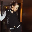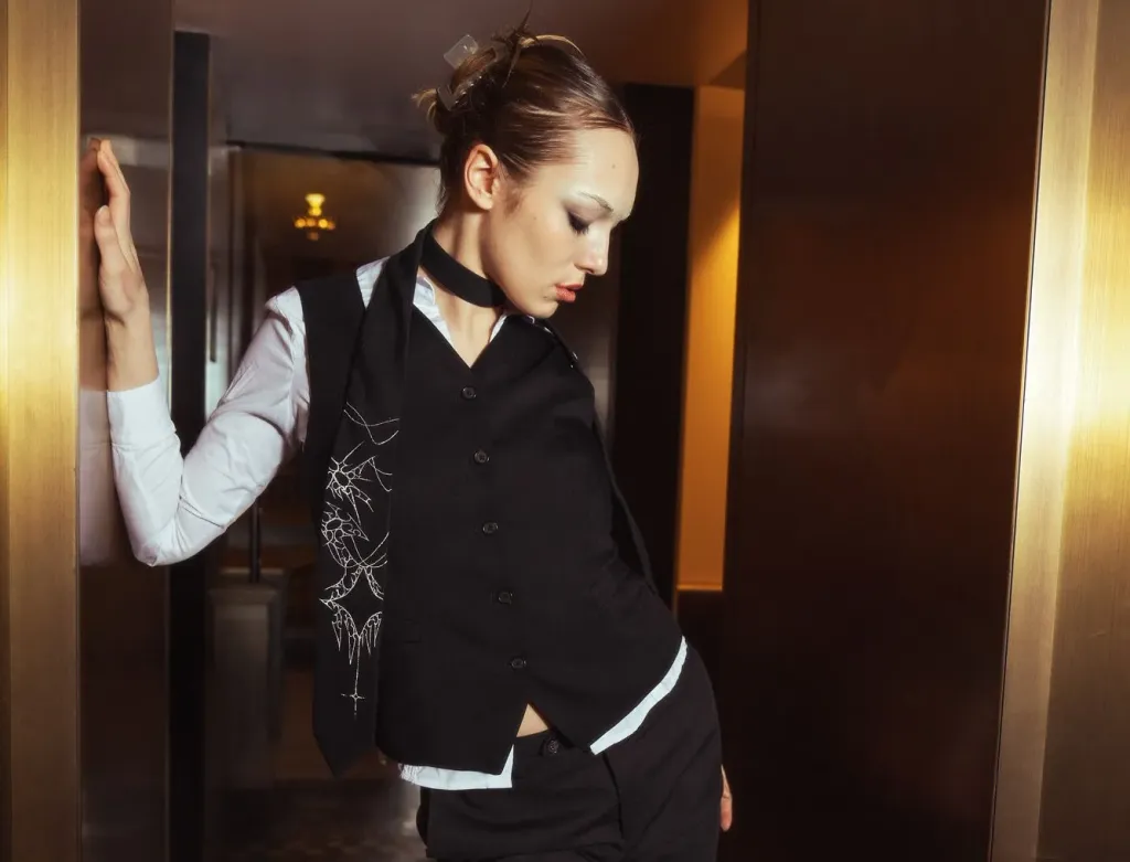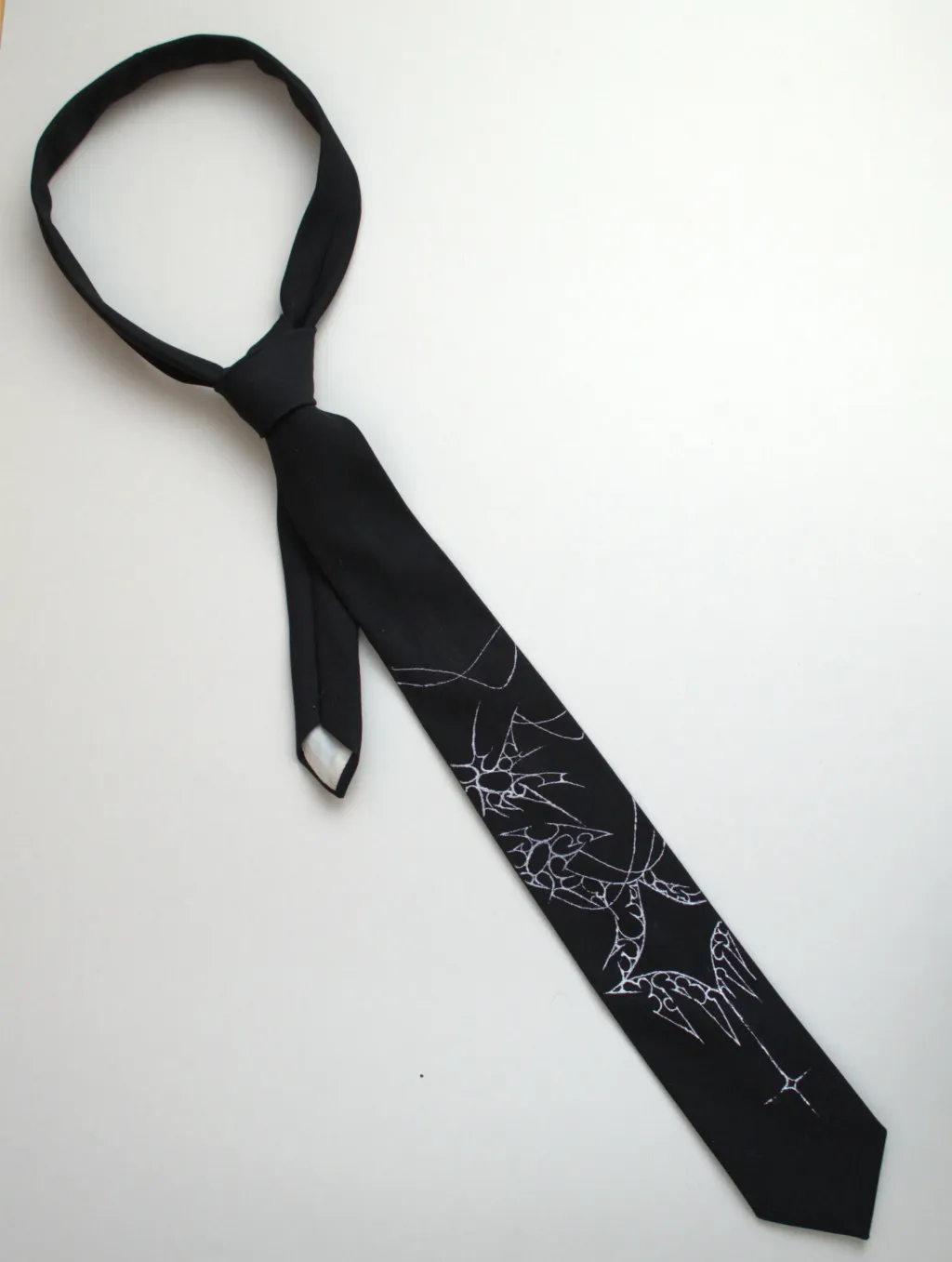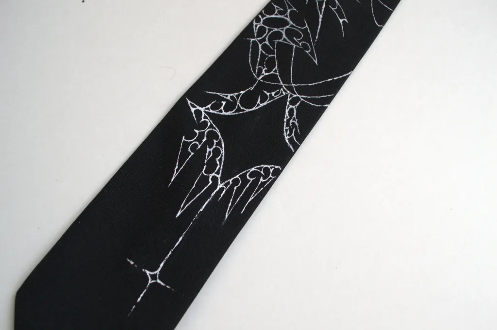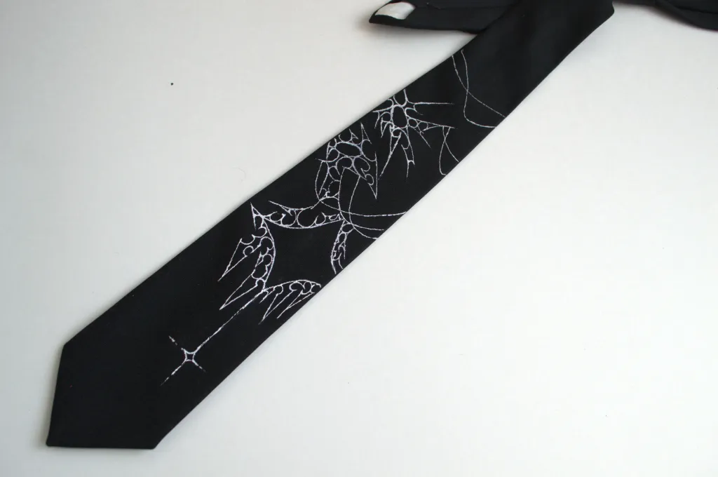 Cravate noire peinte à la main avec des détails blancs.