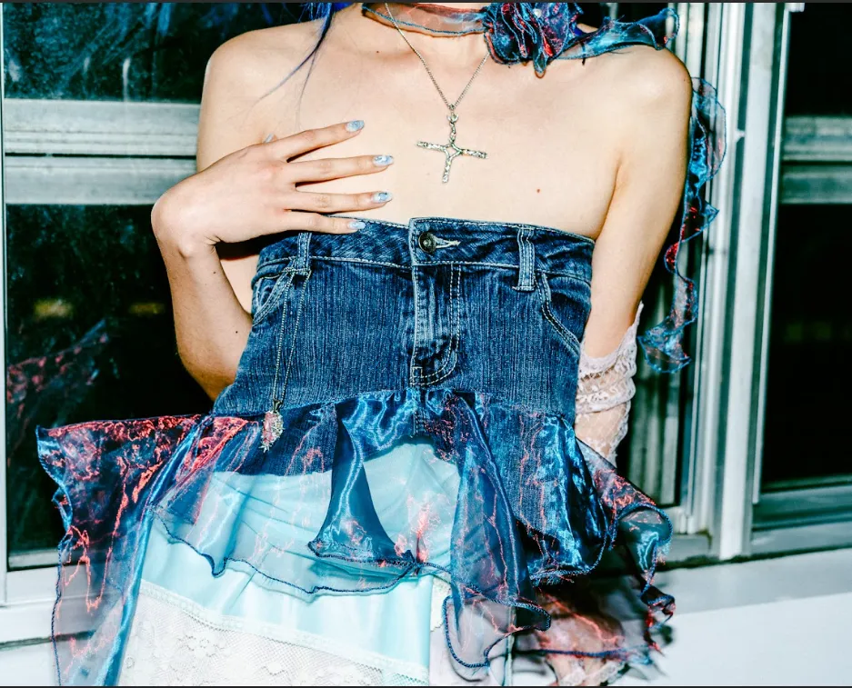 Mini jupe en jean à volants bleus avec un éclat réfléchissant rouge. Cette pièce peut être portée comme un haut et une jupe.