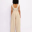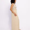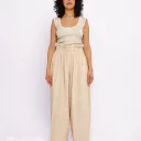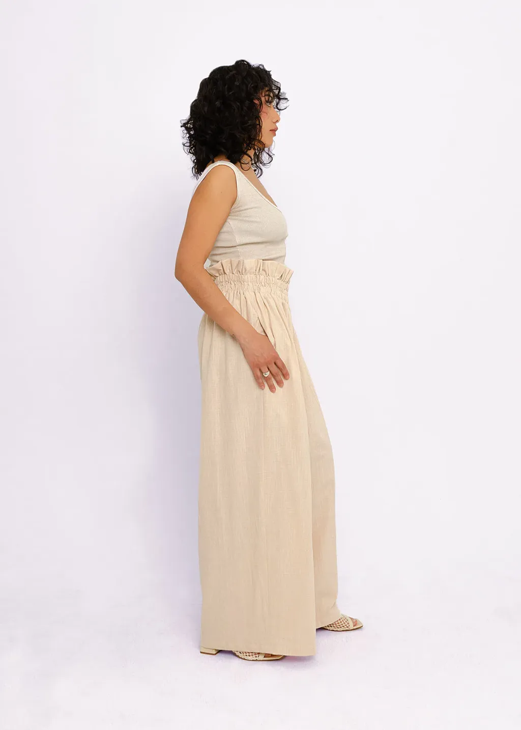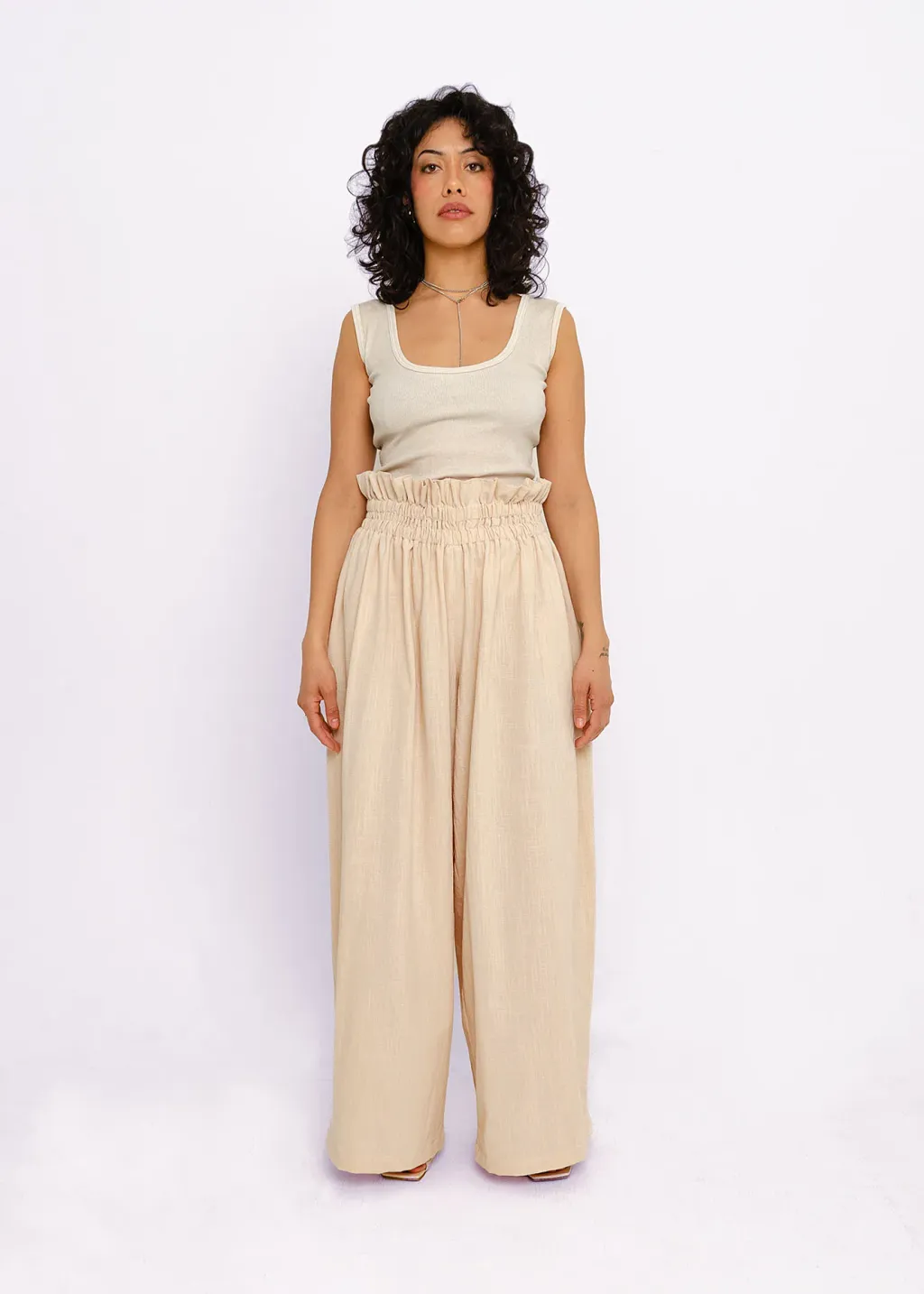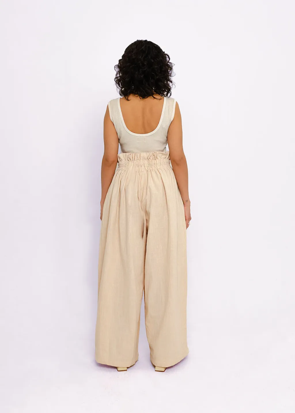 Pantalon à taille haute, à jambe large et à enfiler, en coton froissé. Il est doté de poches sur les coutures latérales, d'une taille élastiquée de type sac en papier et d'une jambe large.