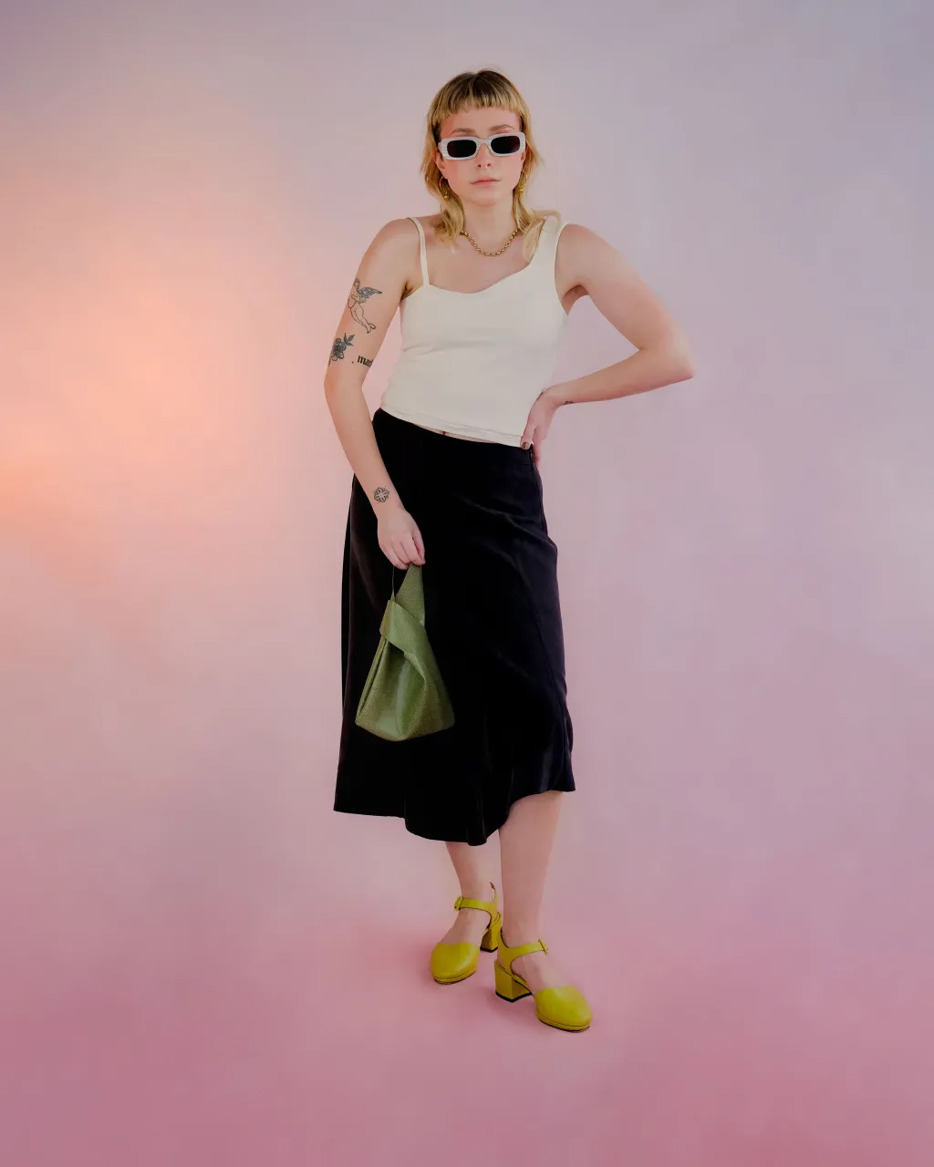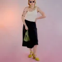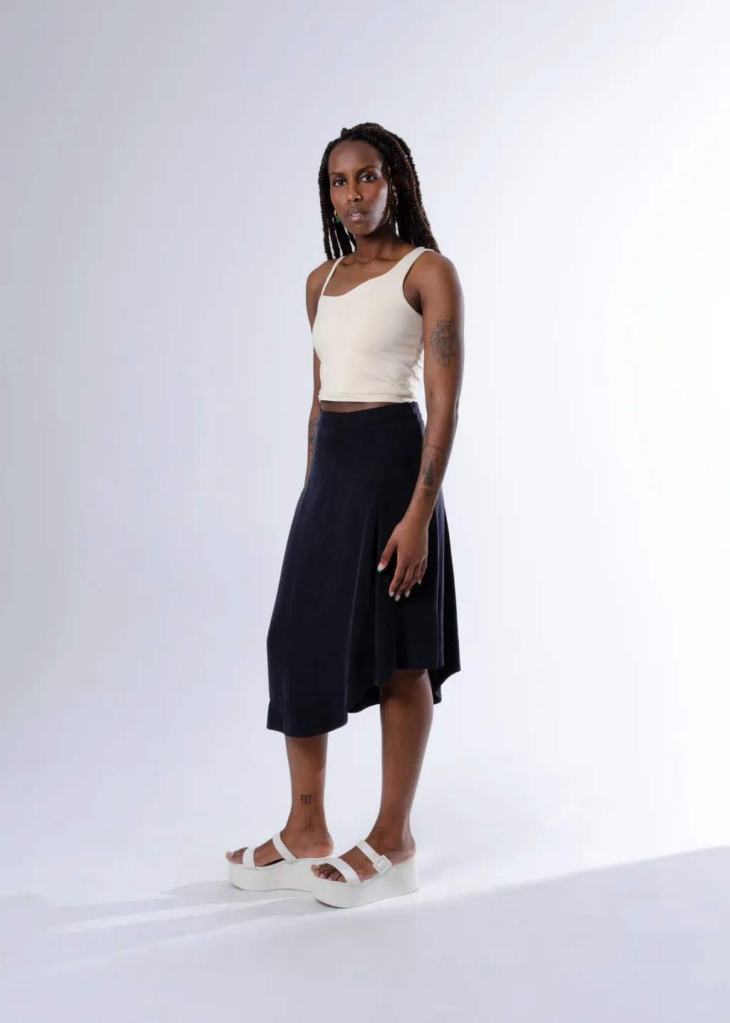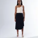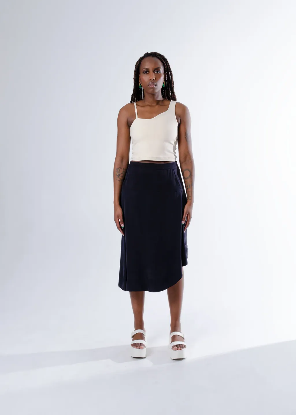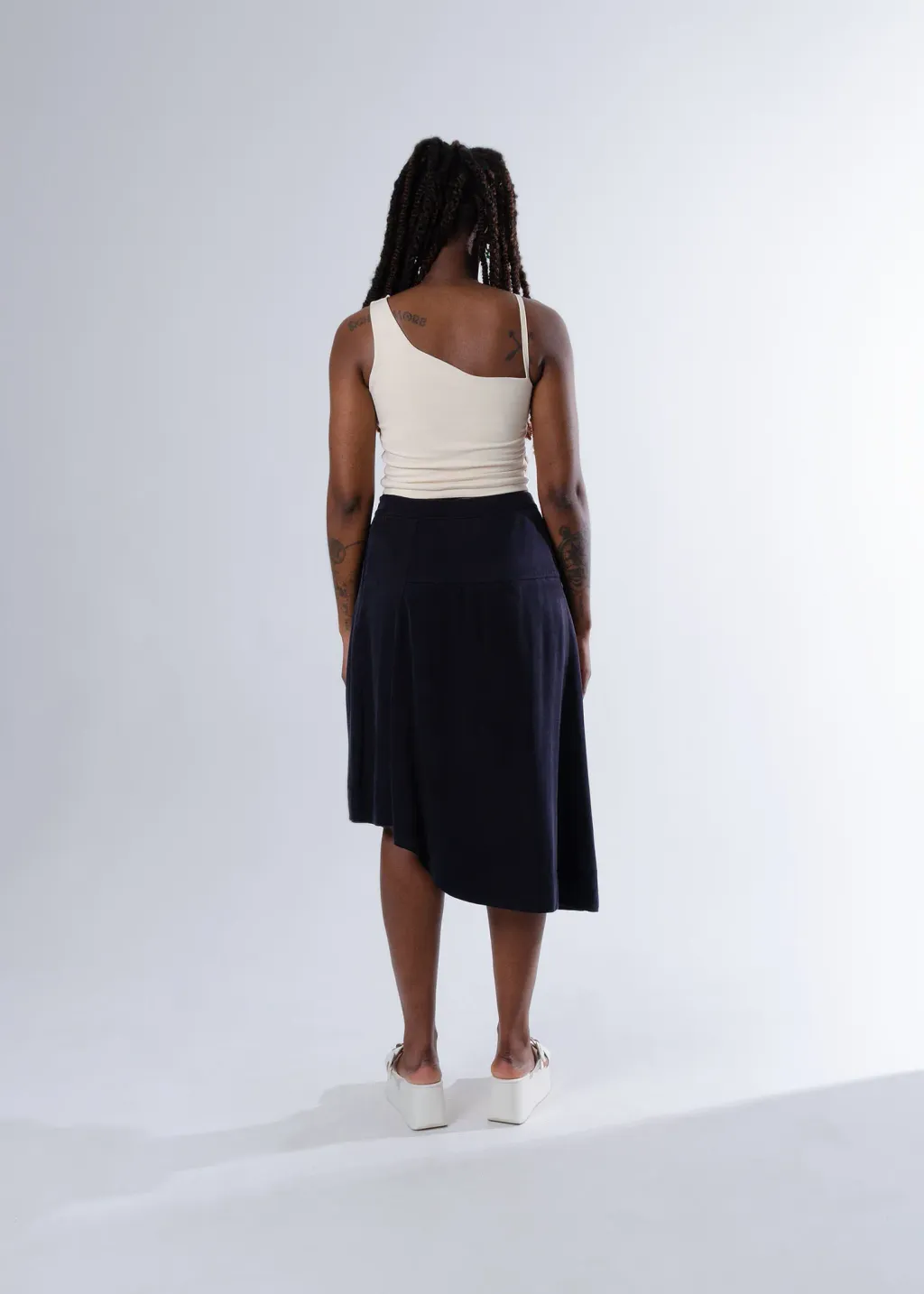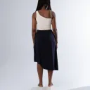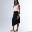 Jupe trapèze avec ourlet asymétrique et fermeture éclair invisible sur le côté. Le vêtement n'est pas doublé.