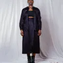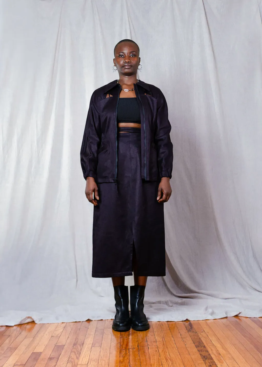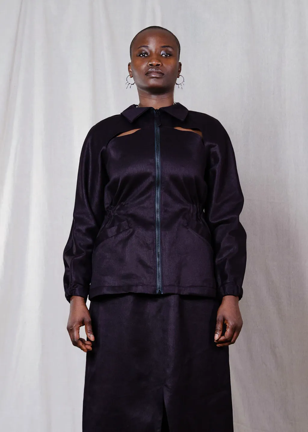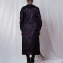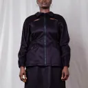 Veste en sergé à manches raglan avec fermeture à glissière centrale sur le devant, détails en trompe-l'œil et élastiques à la taille et aux poignets.