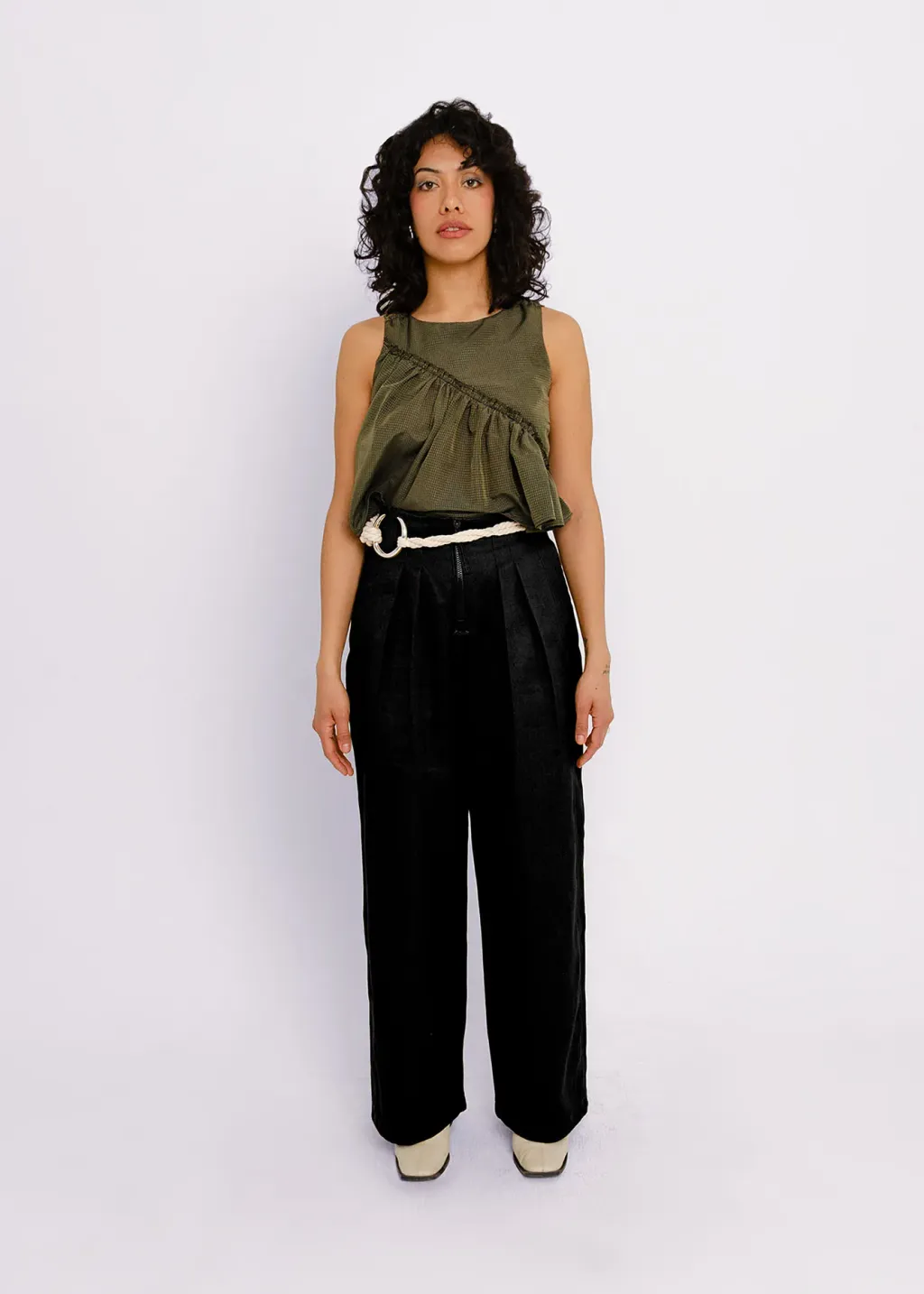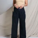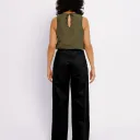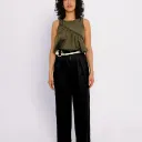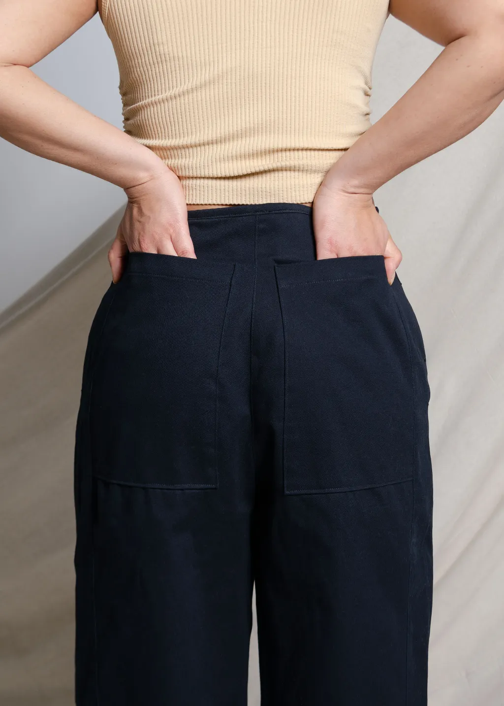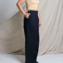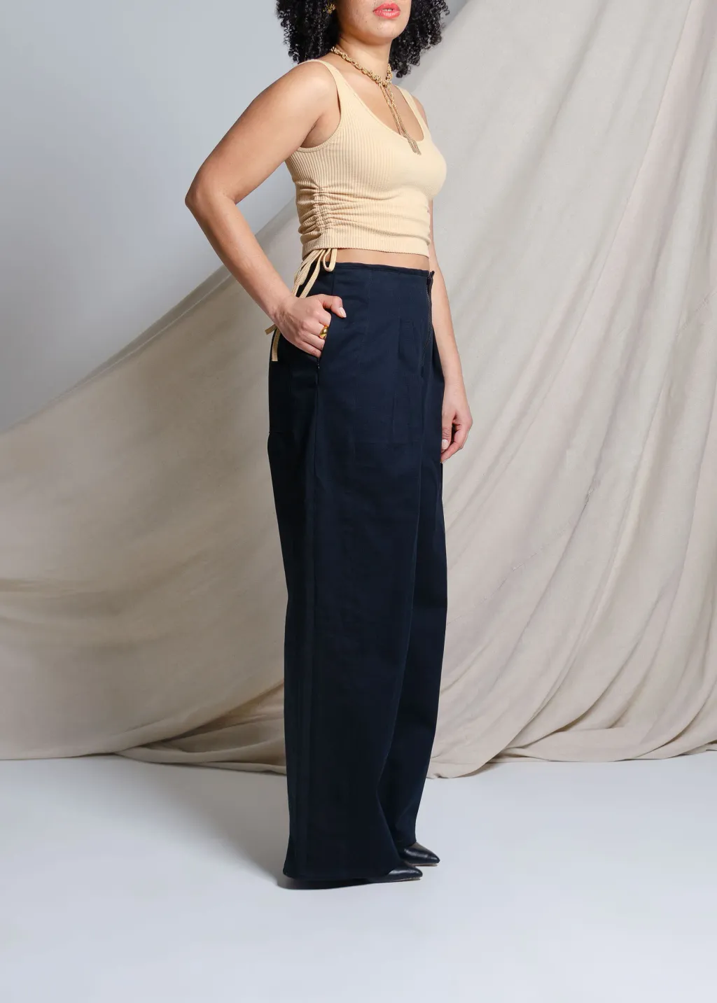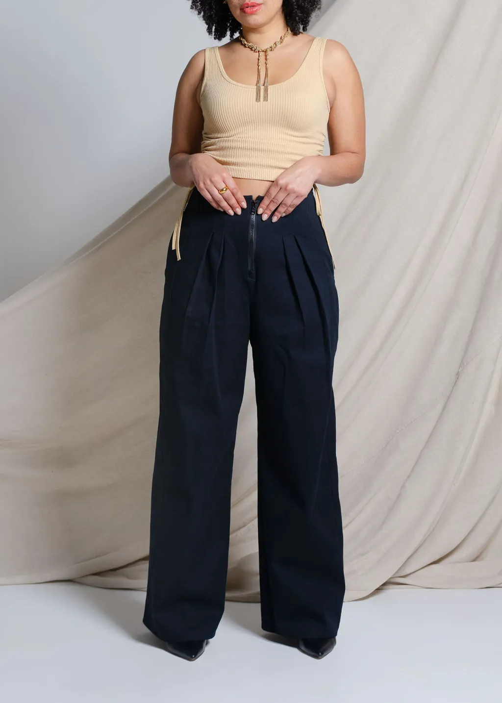 Pantalon en sergé à taille haute et à jambe large, avec fermeture éclair centrale apparente, poches cachées dans les coutures latérales et grandes poches plaquées au dos.