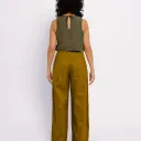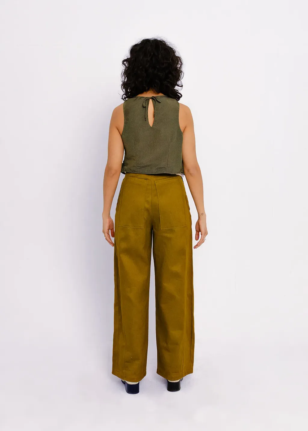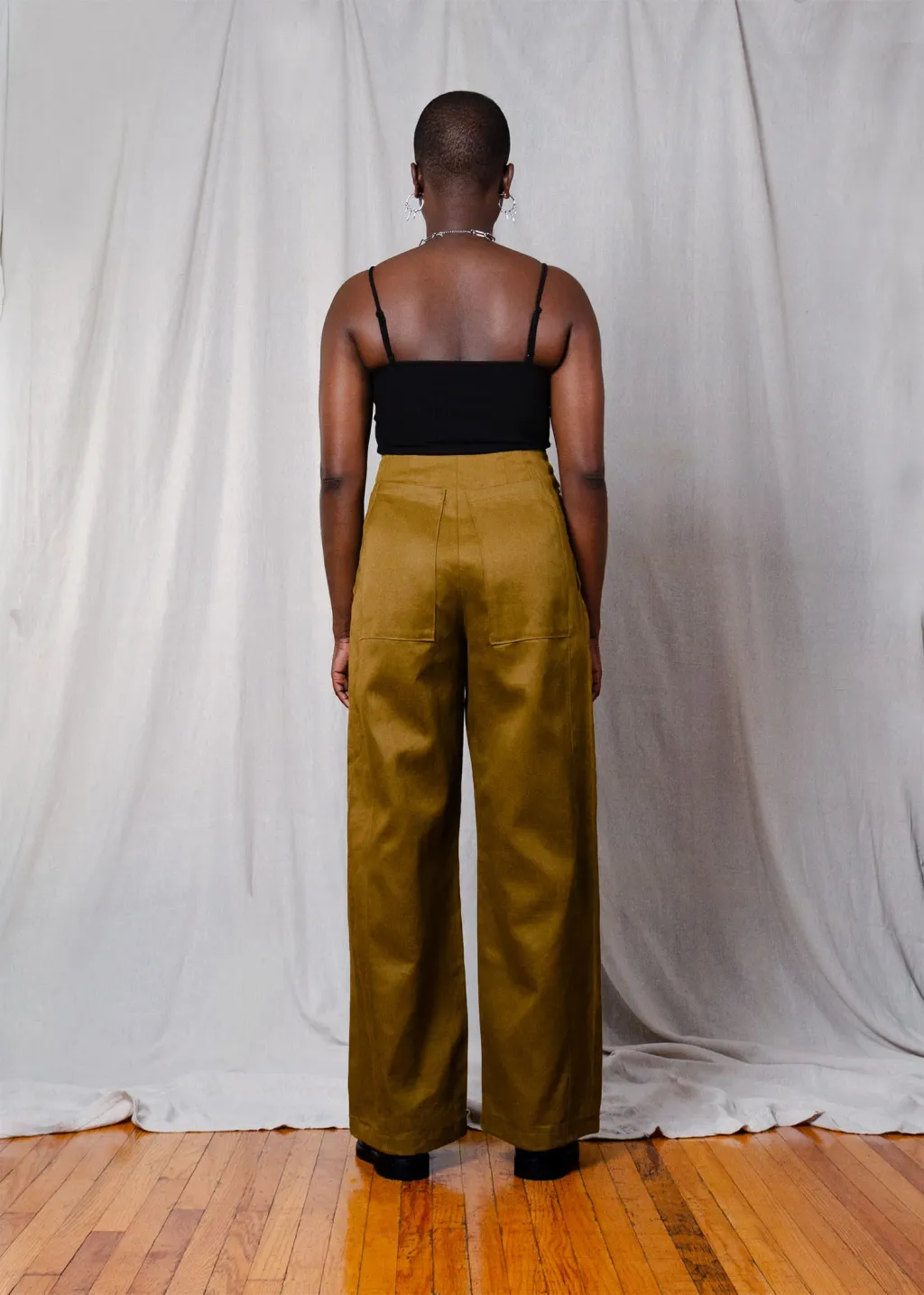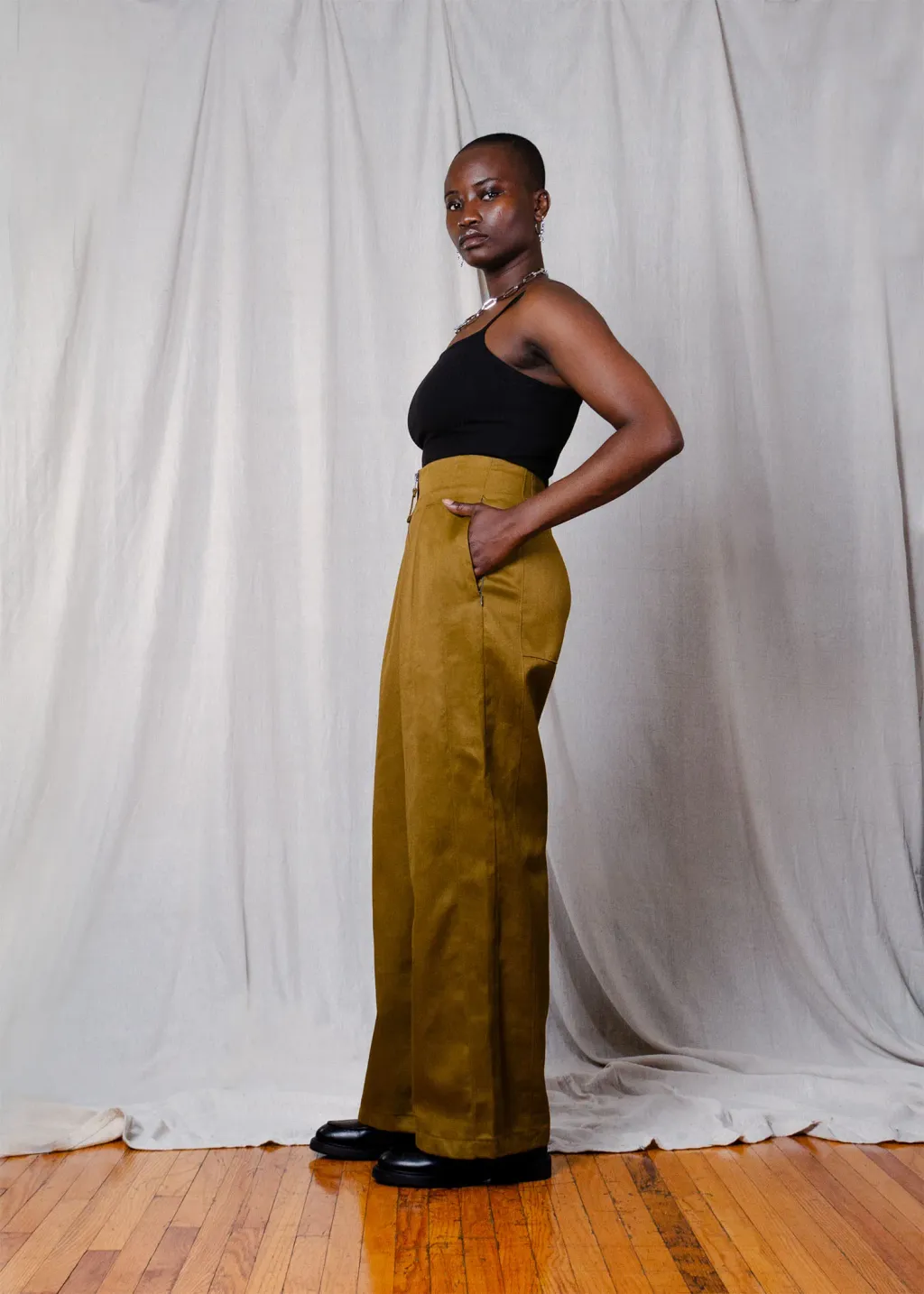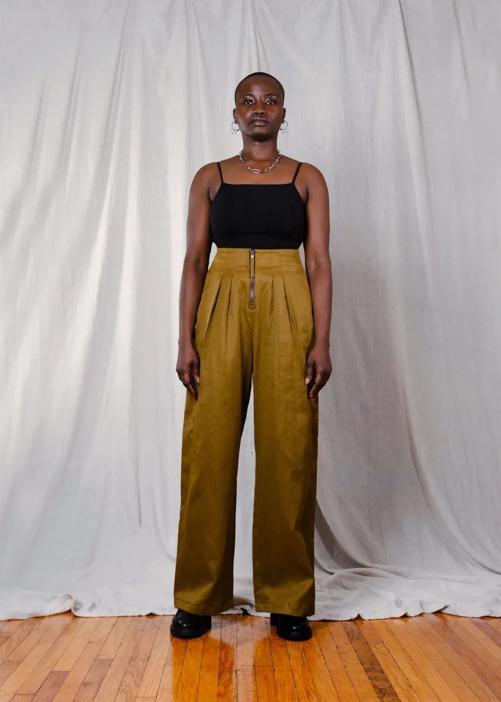 Pantalon en sergé à taille haute et à jambe large, avec fermeture éclair centrale apparente, poches cachées dans les coutures latérales et grandes poches plaquées au dos.