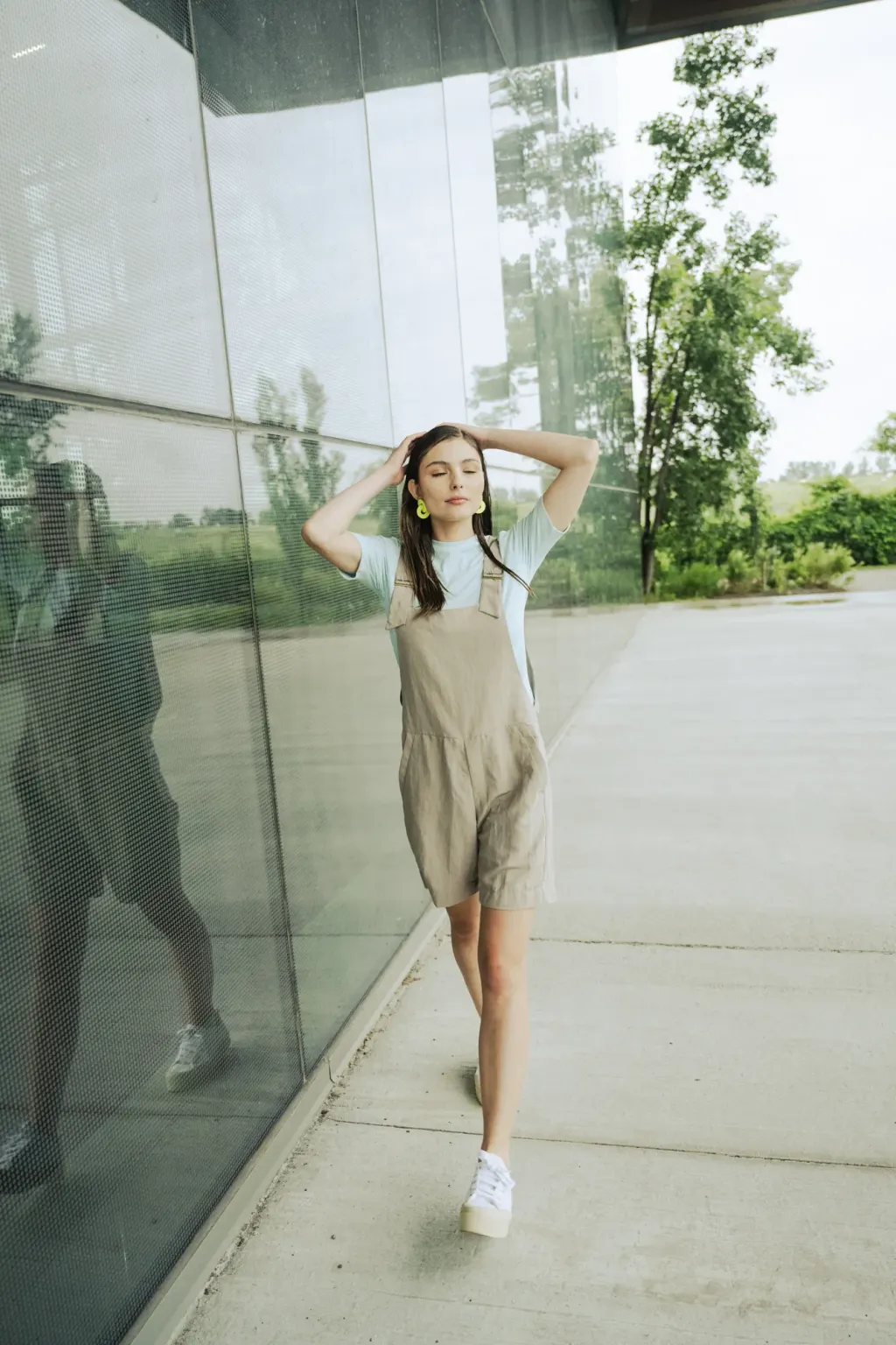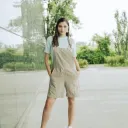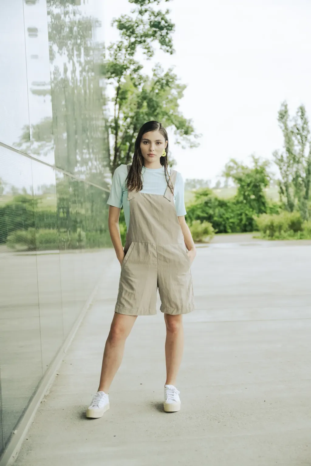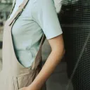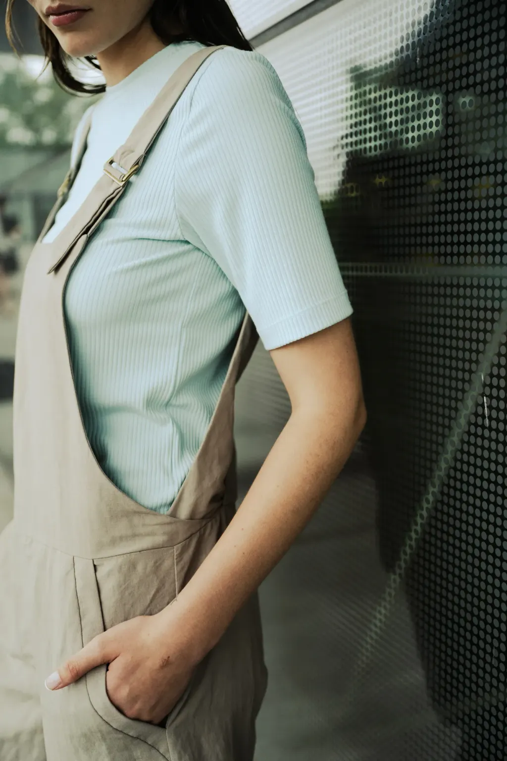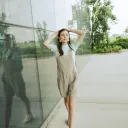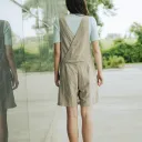 Large dos croisé. Longueur au-dessus des genoux. Larges bretelles croisées au dos, réglables par des attaches métalliques. Deux poches sur le devant.