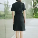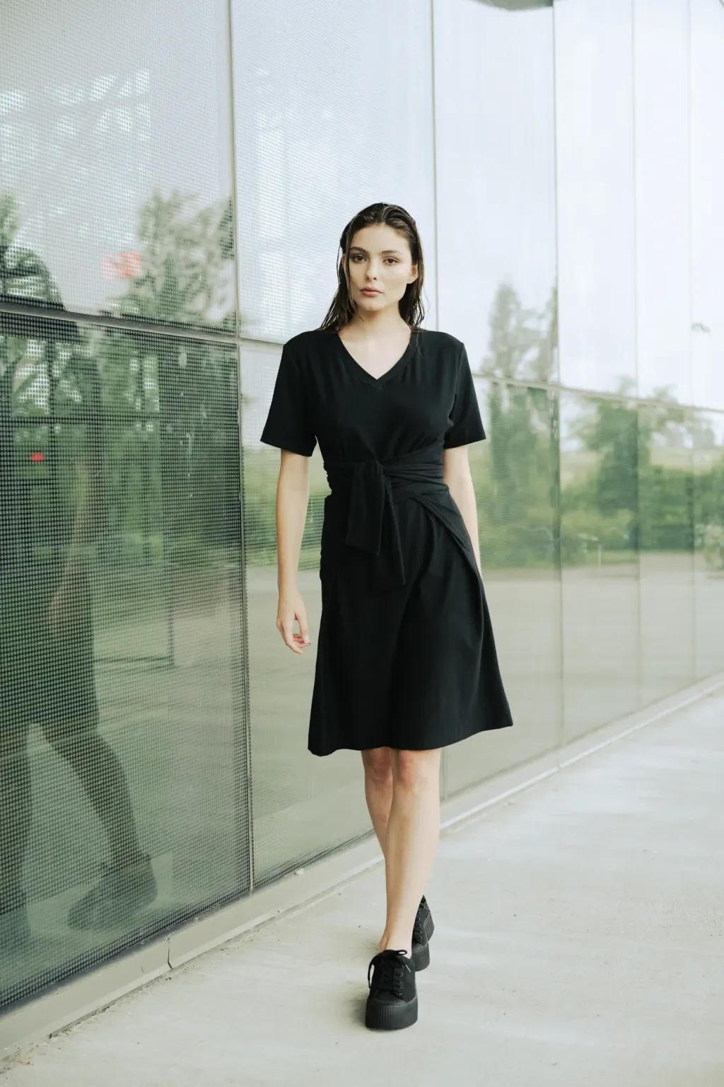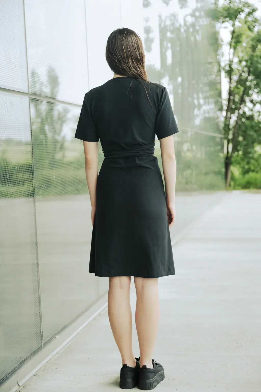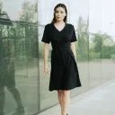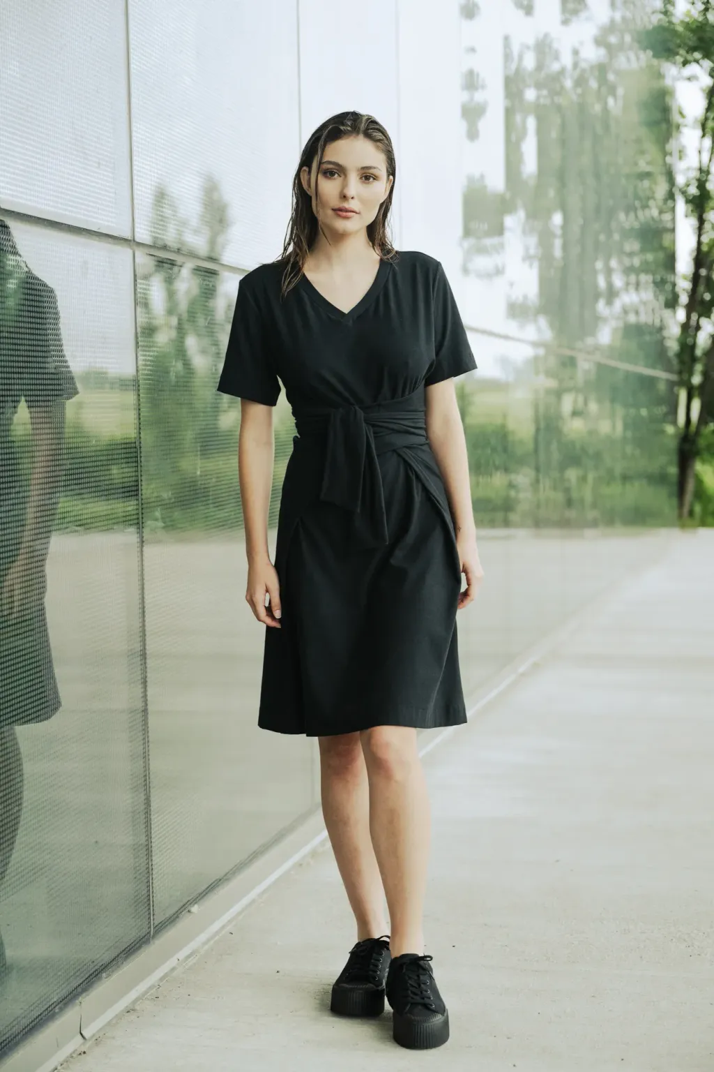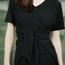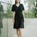Robe croisée en jersey à la taille. Robe que vous pouvez envelopper de 3 façons. Col en V et manches courtes. Longueur au-dessus du genou.