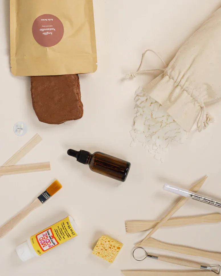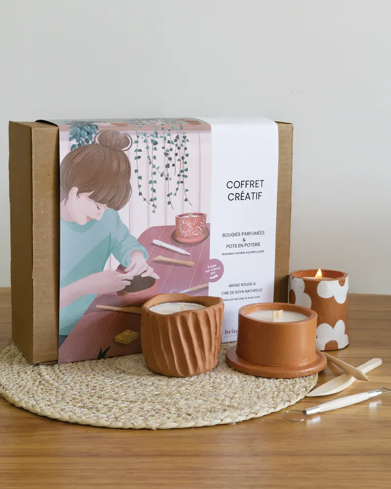 Ce coffret contient les outils pour la confection de 2 pots en argile rouge et le nécessaire pour créer 2 bougies en cire de soja avec mèches crépitantes issues de bois certifié FSC. Un lien pour visionner les instructions, étape par étape, est aussi compris.