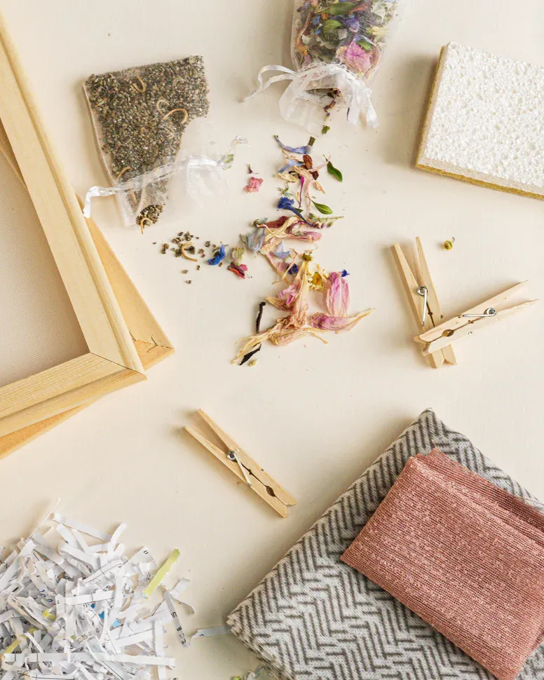 Ce coffret contient tout le nécessaire pour confectionner votre propre papier, en réutilisant du matériel qui était destiné au recyclage. Personnalisez-le avec les pétales de fleurs séchées ou les graines de fleurs pollinisatrices incluses. Un lien pour visionner les instructions, étape par étape, est aussi compris.