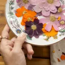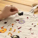 Des fleurs séchées et matières organiques : cosmos pressées, pétales de roses pourpres, pétales de roses trémières, pétales de soucis, cochenilles, paillettes d’oignon