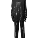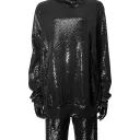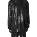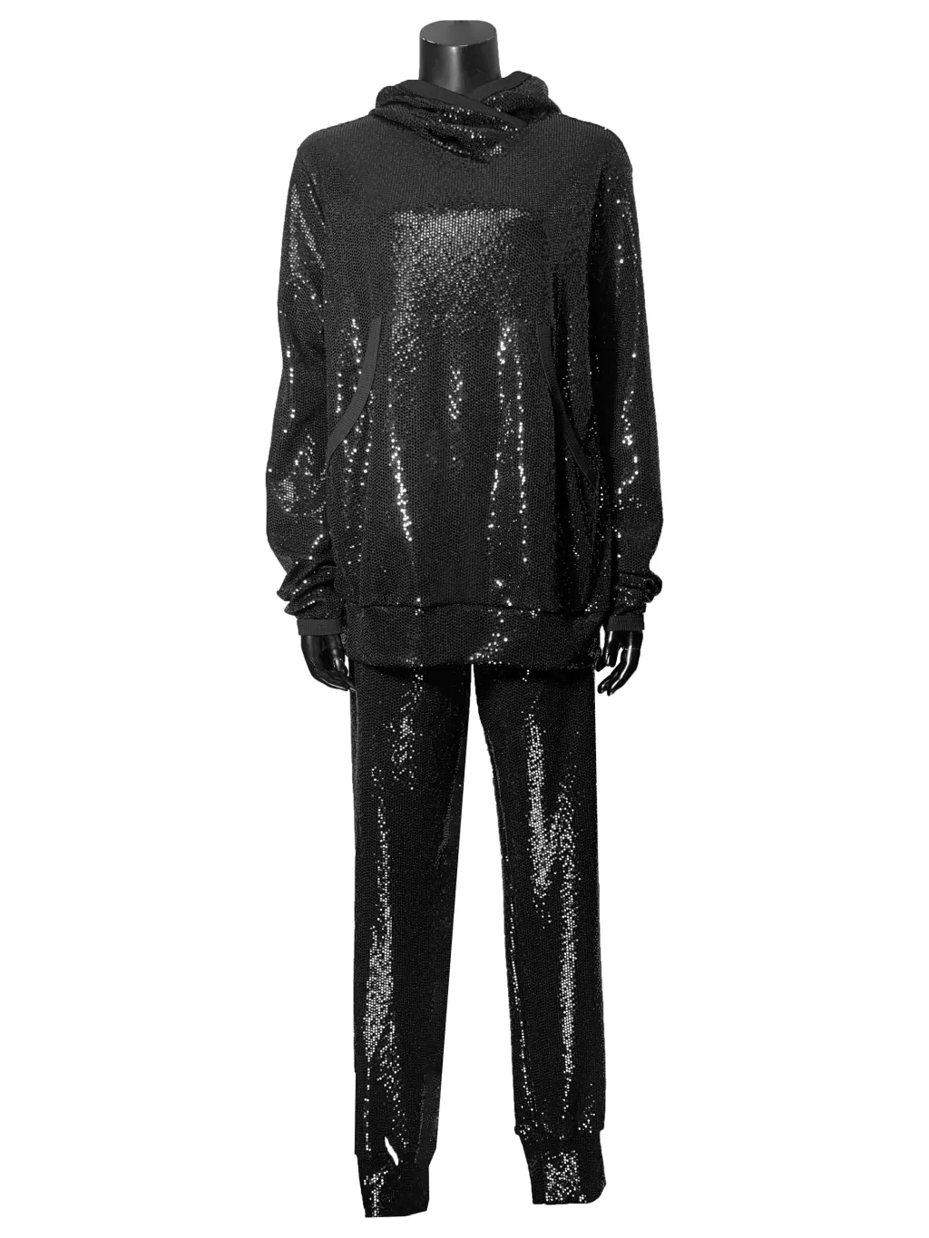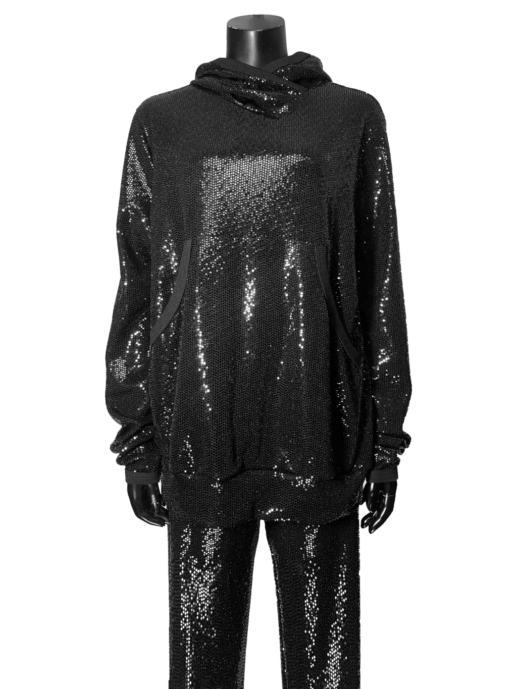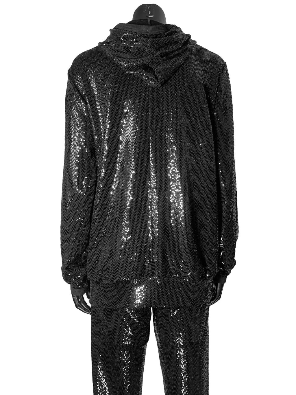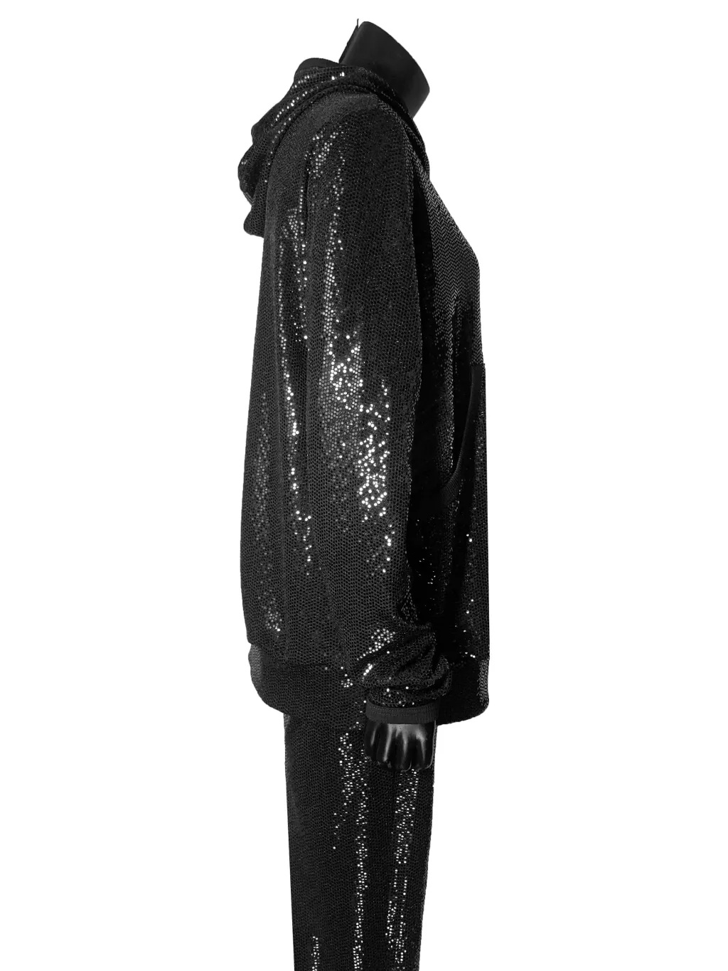 Hoodie en paillettes noires, coupe ample, confortable et décontractée avec poche kangourou au devant et capuche.
