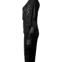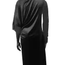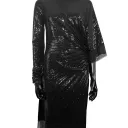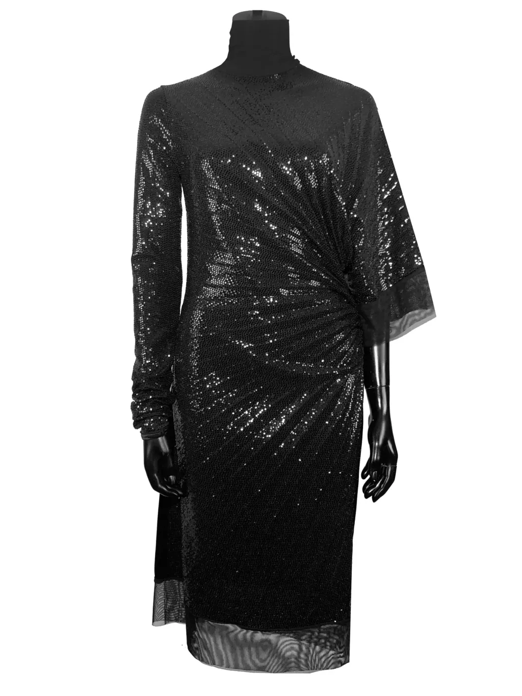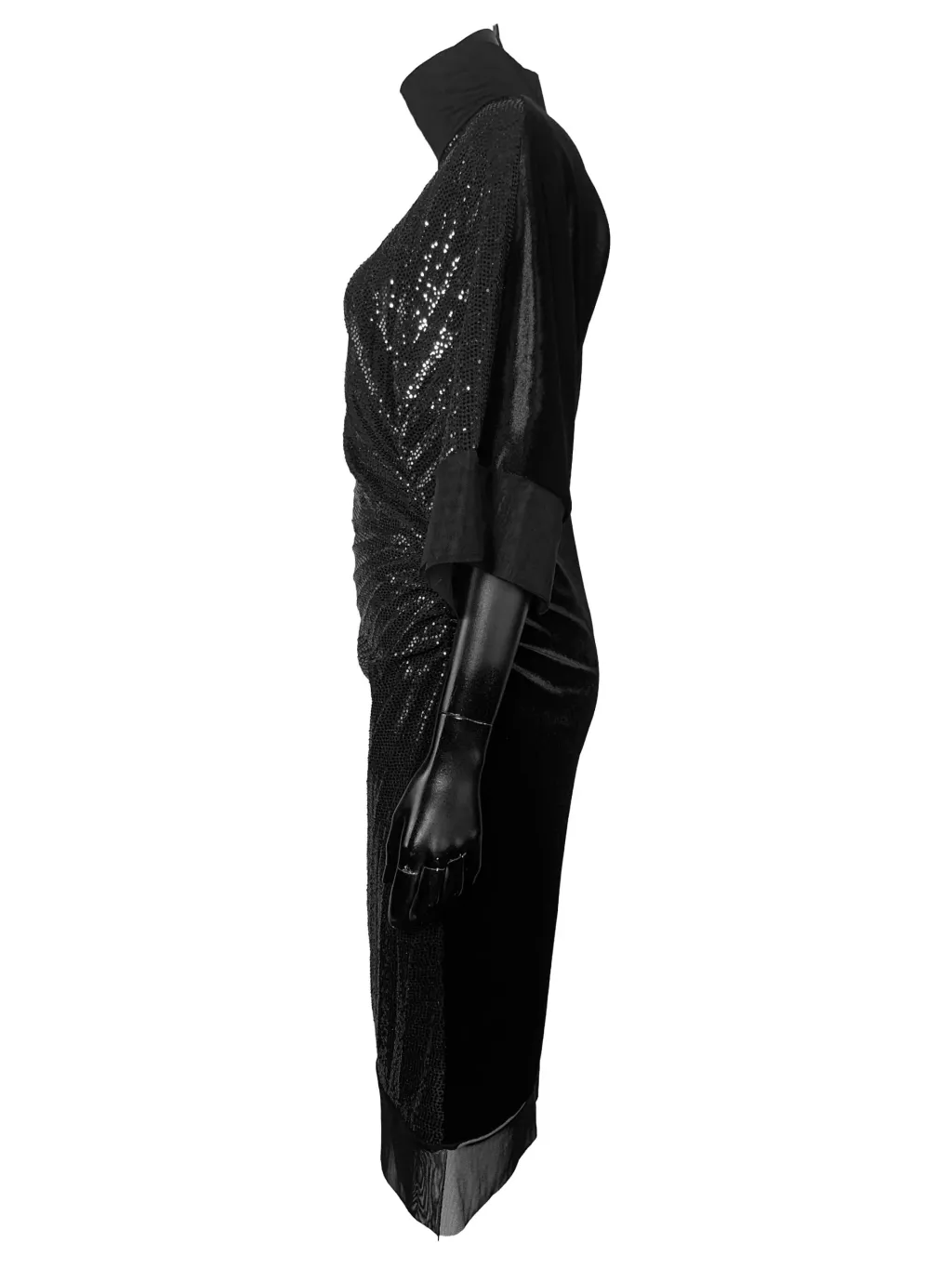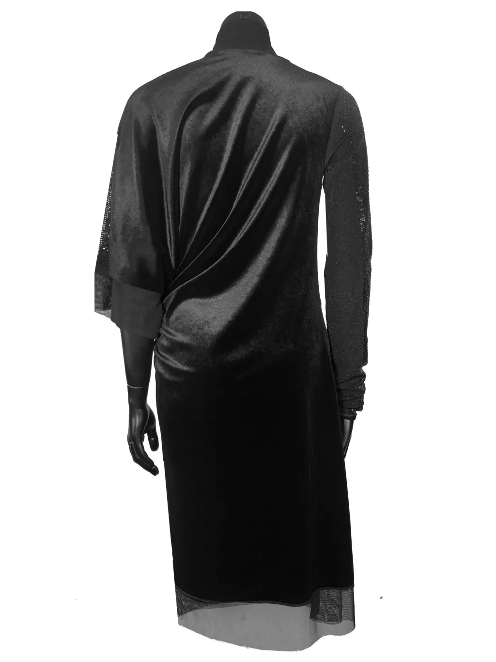 Robe en velours plissé/paillettes plissées, col et manches en mesh de polyester noir, détails de mesh à la manche et au bas