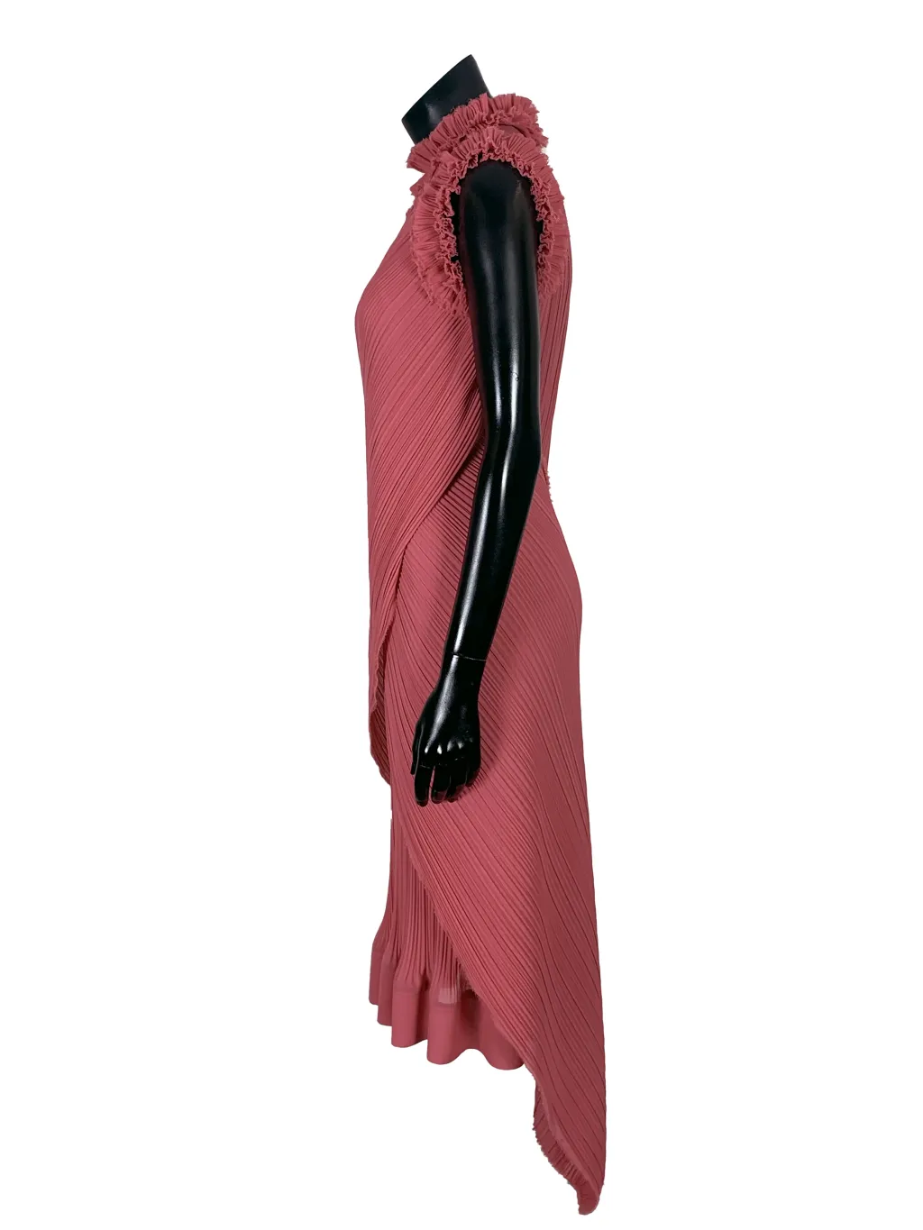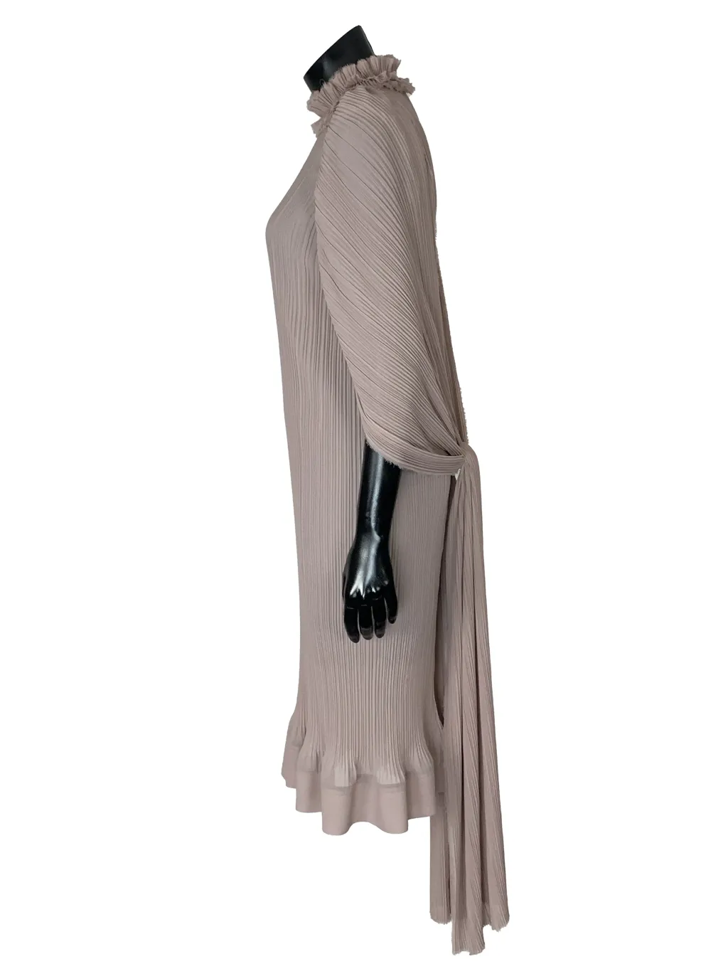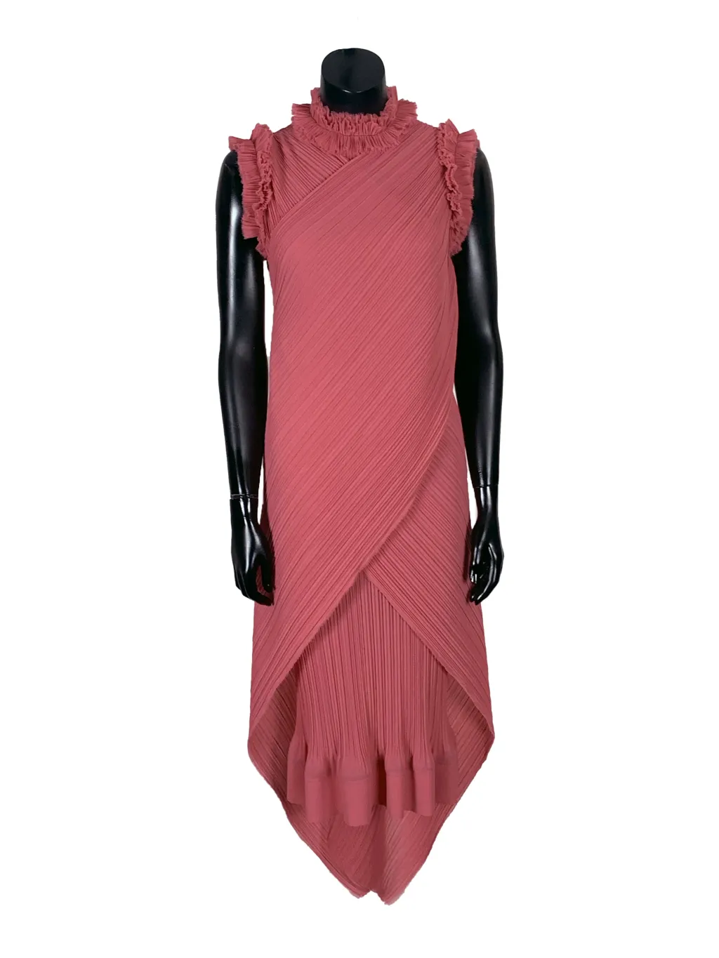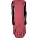 Robe en en chiffon de polyester plissé, panneaux de chiffon plissé permettant d'être portée de plusieurs différentes manières, doublée en jersey de bamboo.