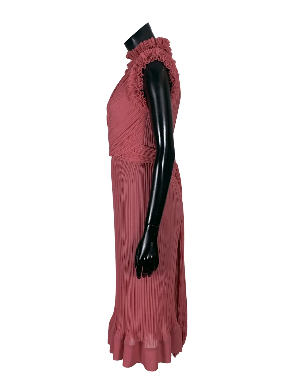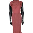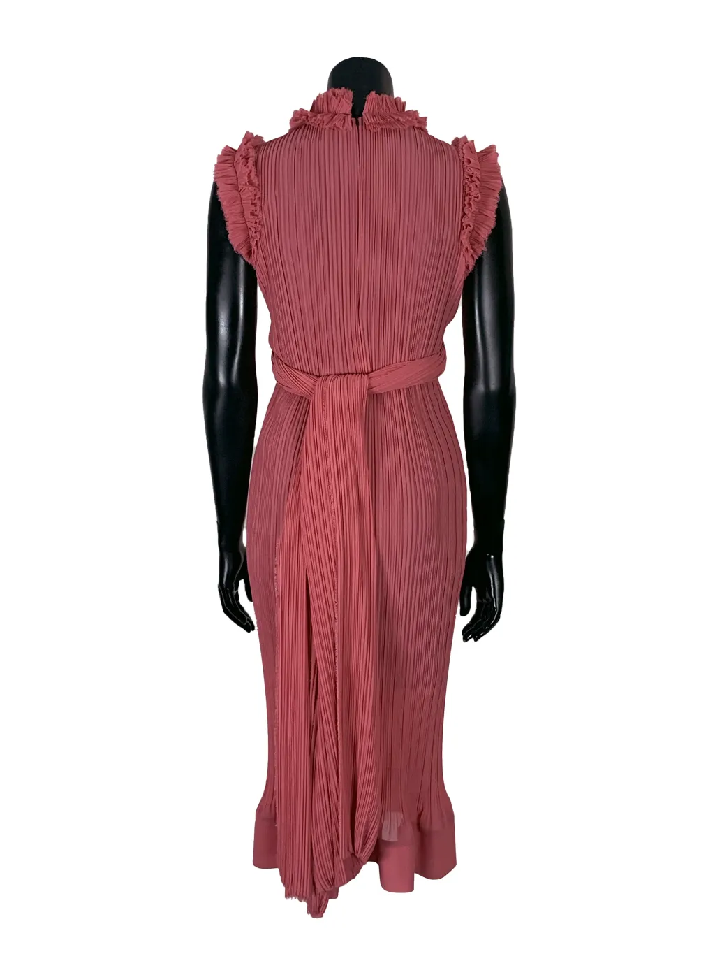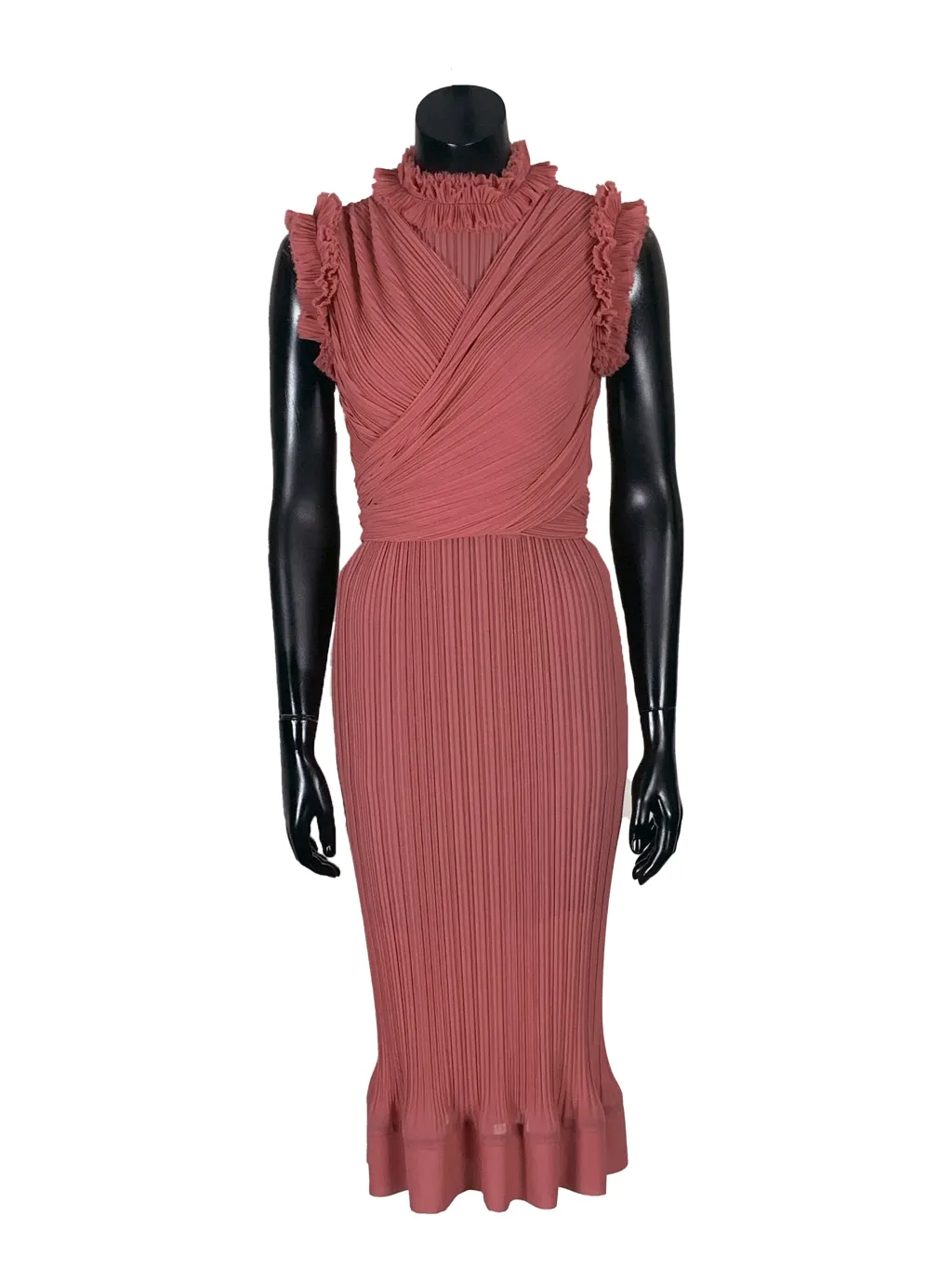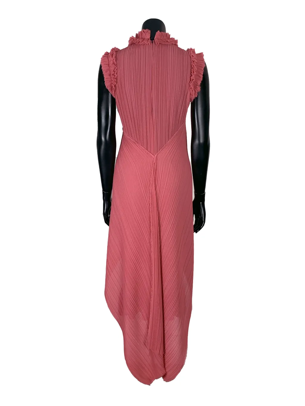 Robe en en chiffon de polyester plissé, panneaux de chiffon plissé permettant d'être portée de plusieurs différentes manières, doublée en jersey de bamboo.