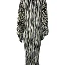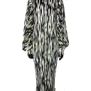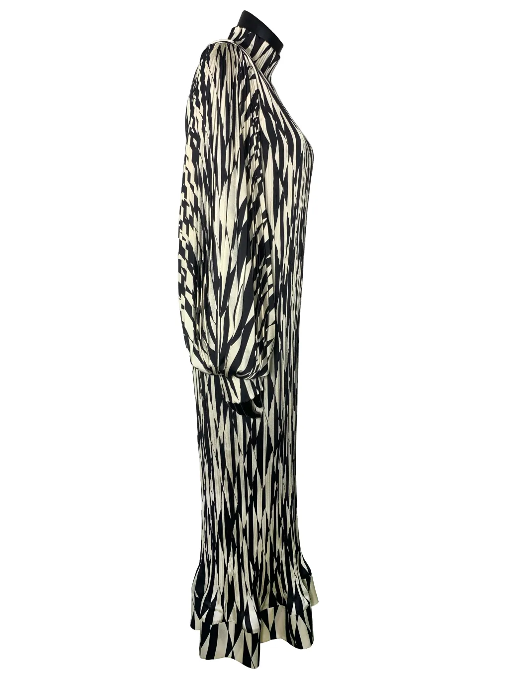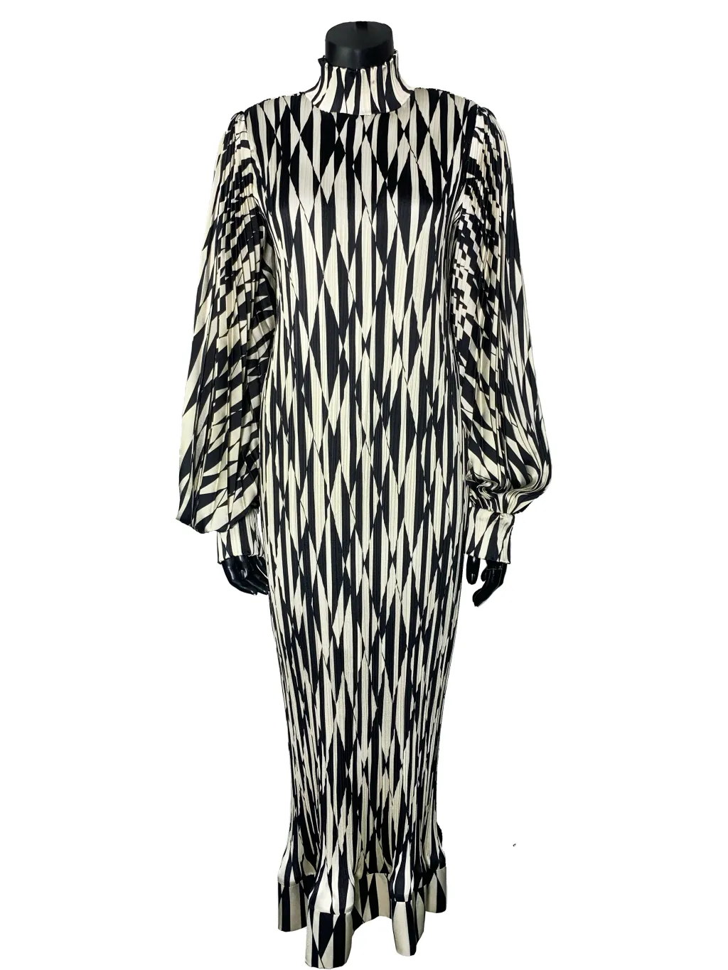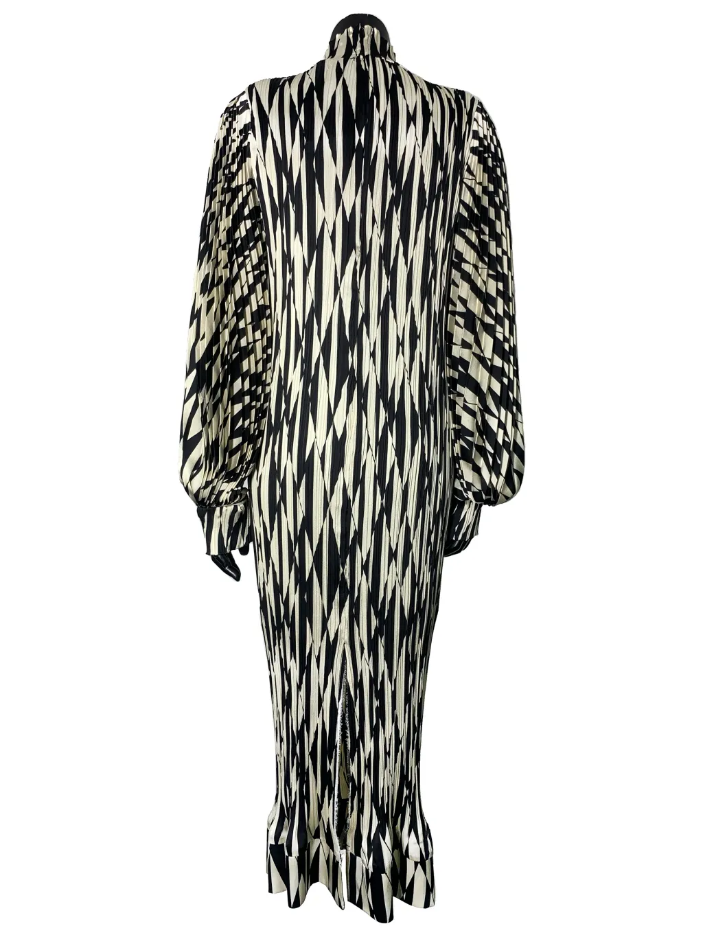 Robe plissée à imprimés géométriques bicolores, manches longues bouffantes plissées, doublure en jersey de nylon noir, fermeture à glissière au dos