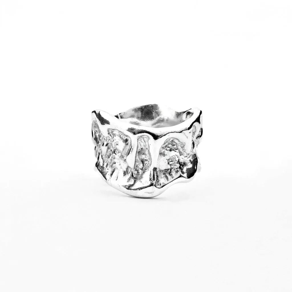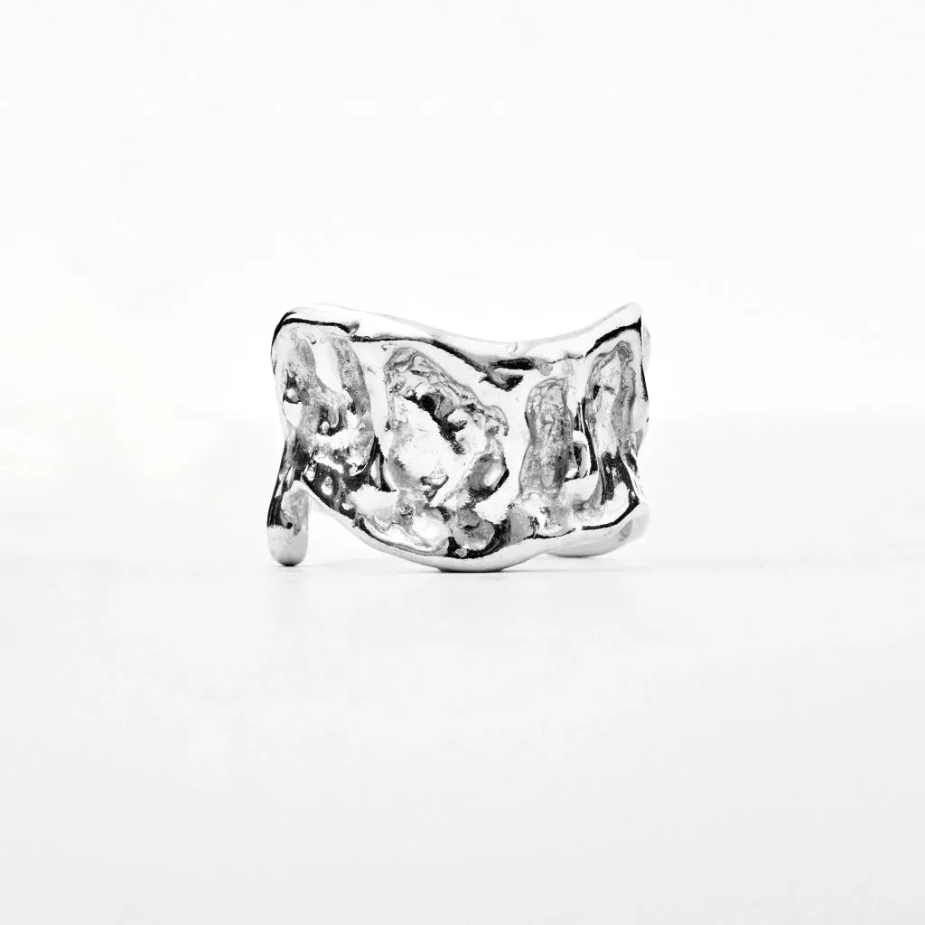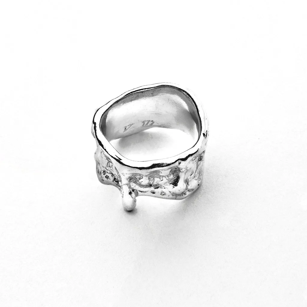 Une bague épaisse, ondulée avec une courbure extérieure et un intérieur arrondi, offrant un confort 24/7. Agrémentée d'une texture semblable à la lave en fusion et d'une goutte individuelle.