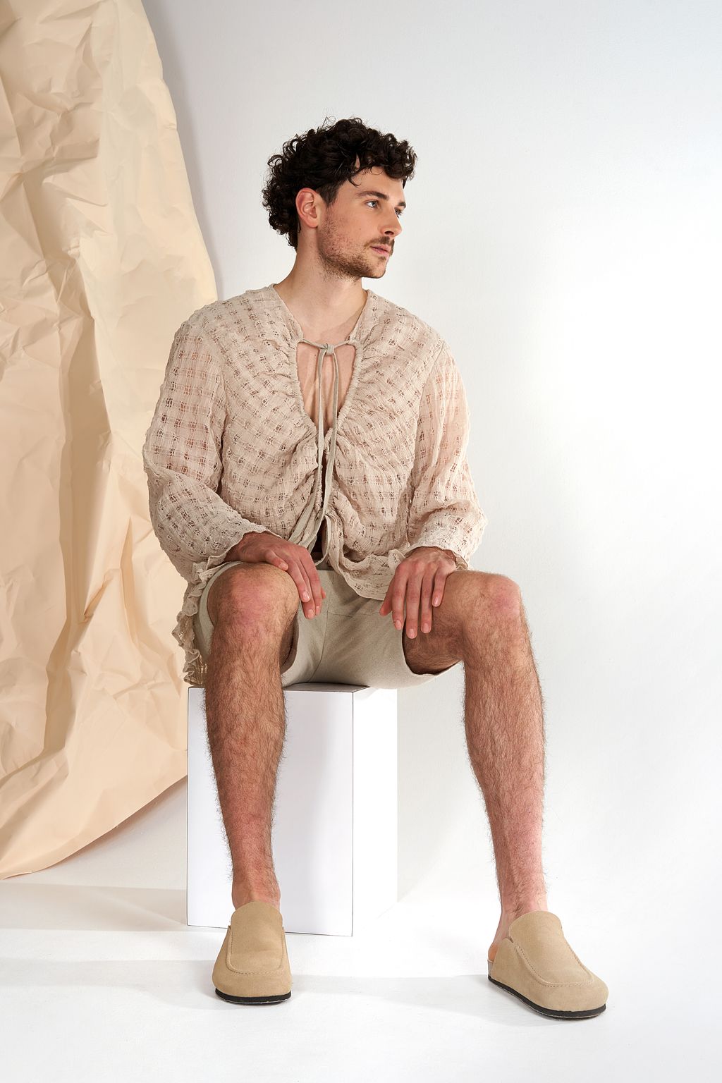 Delicia est une robe-chemise transparente unisexe, avec une coupe surdimensionnée. Elle est disponible qu'en taille unique car le tissu est très ajustable et extensible.