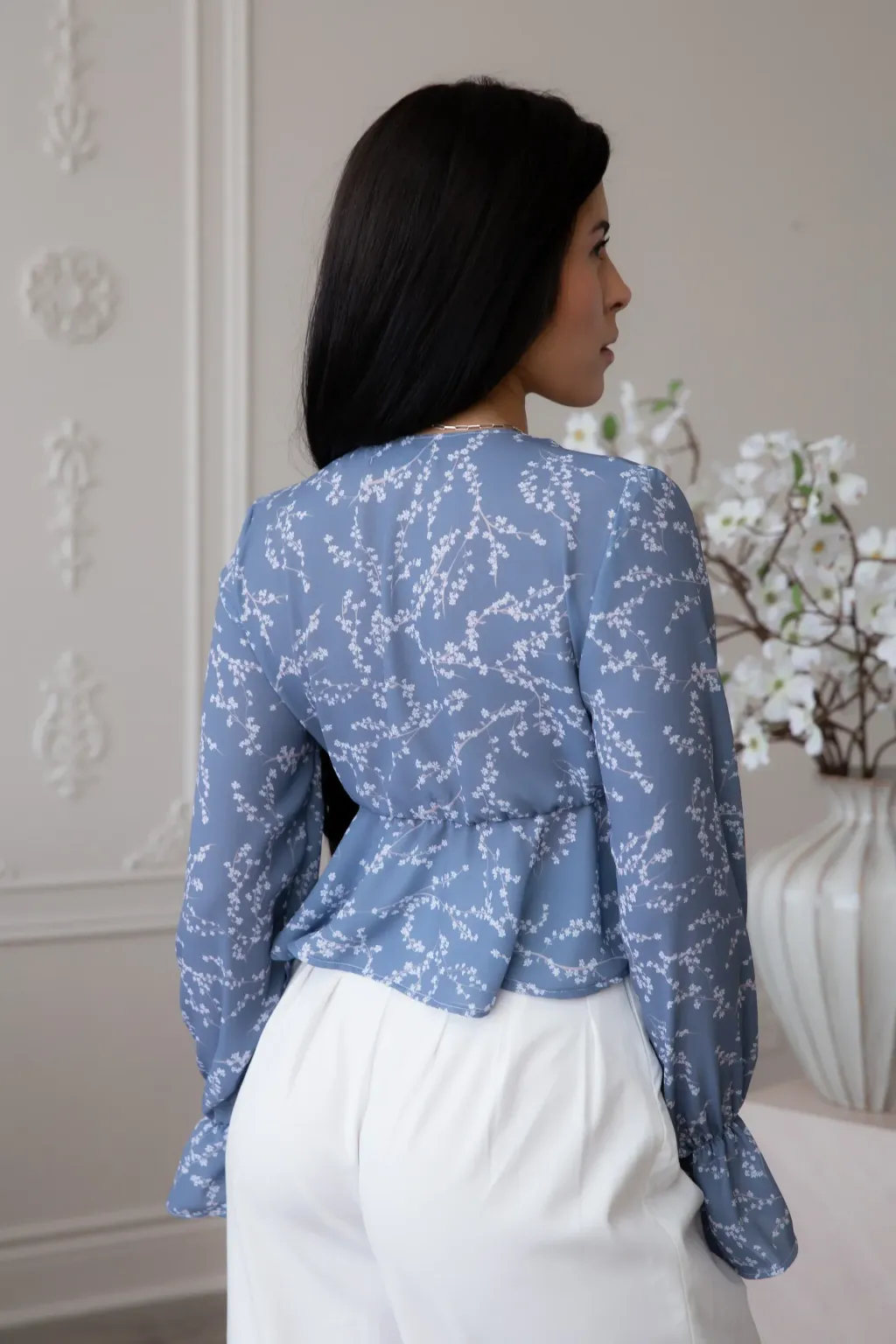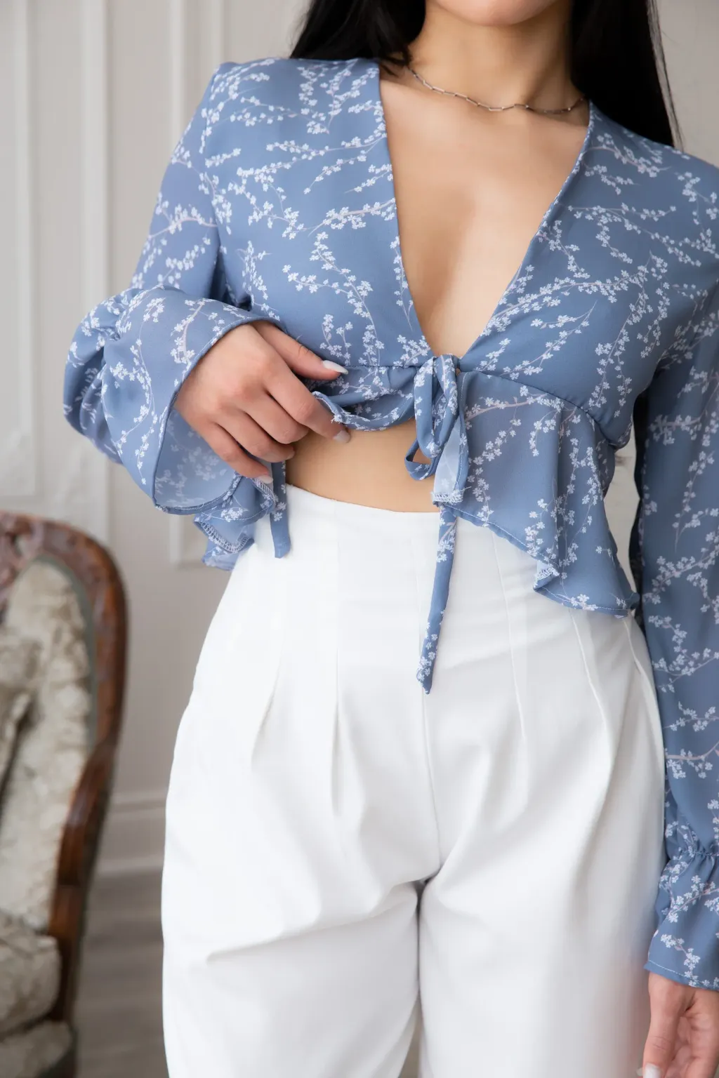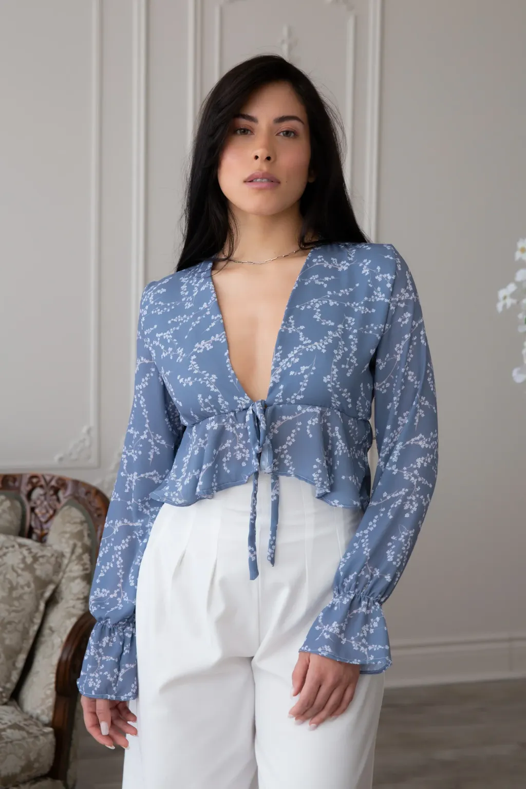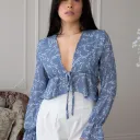 -Blouse légère s'attachant avec une corde fine au devant, volants à la taille! On a inséré un élastique sous la poitrine pour offrir un soutien et la rendre avantageuse. Le détail de fronces aux manches rend ce style aérien et bohème. Son tissu est si doux et léger et on adore son imprimé floral, entièrement développé par notre équipe qui rend cette blouse estivale et romantique tout en étant complètement indémodable par sa simplicité!