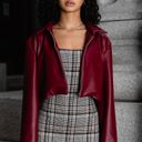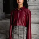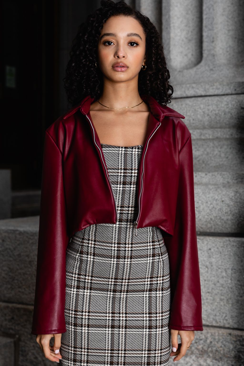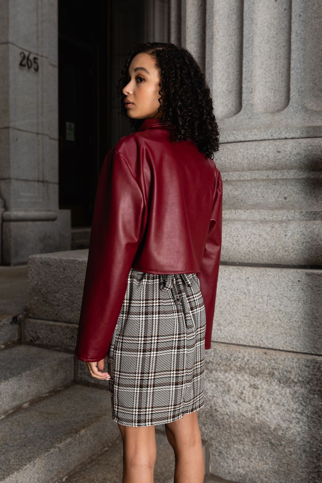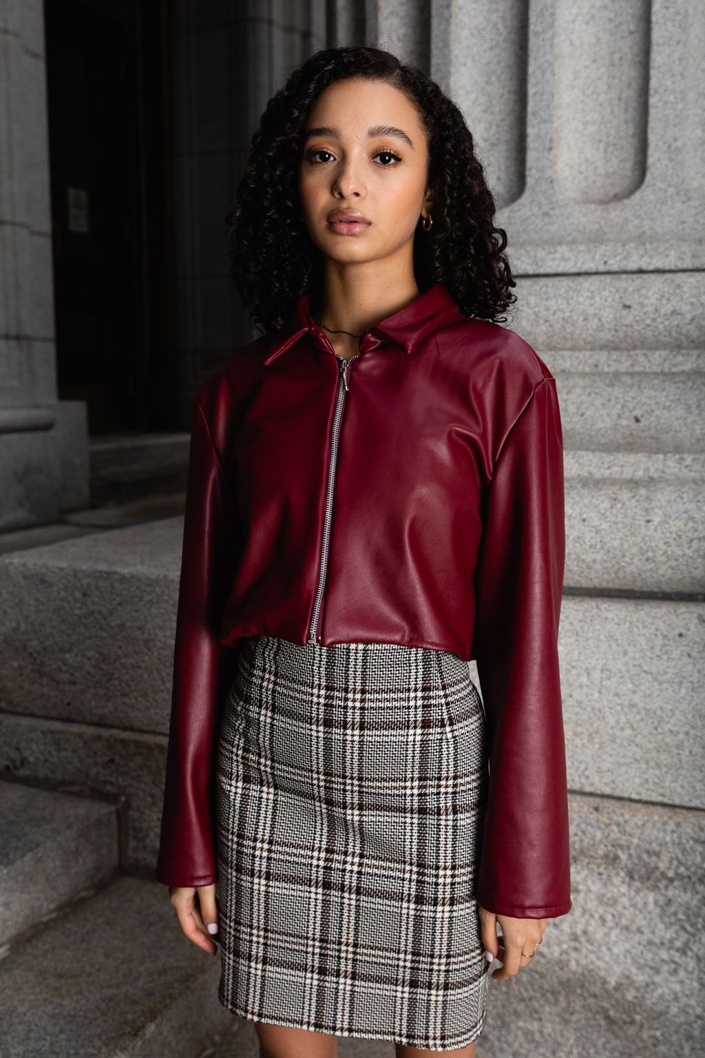 Veste en cuirette extensible bourgogne avec col chemisier, l'intérieur de la veste a un fini suède doux. La «leather» jacket parfaite cet automne ou printemps pour porter par dessus une robe, un chemisier ou un chandail basic! Procure toi là avec le pantalon Métro pour avoir le matching set complet et embarquer dans la tendance du «leather on leather»