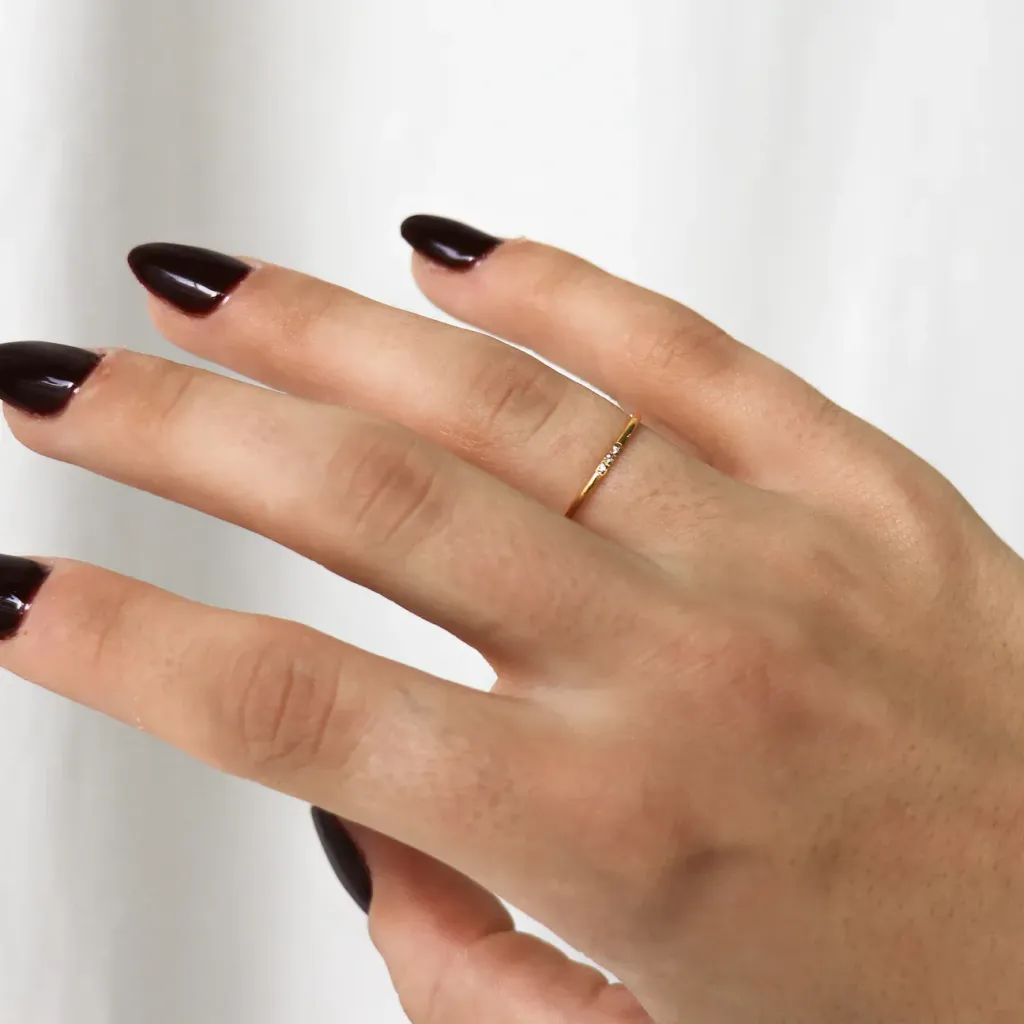 Bague très fine et délicate ornée de trois petits zircons clairs. Minimaliste et étincelante elle peut être portée avec nos autres bagues ou seule. Disponible en tailles 5 à 9.