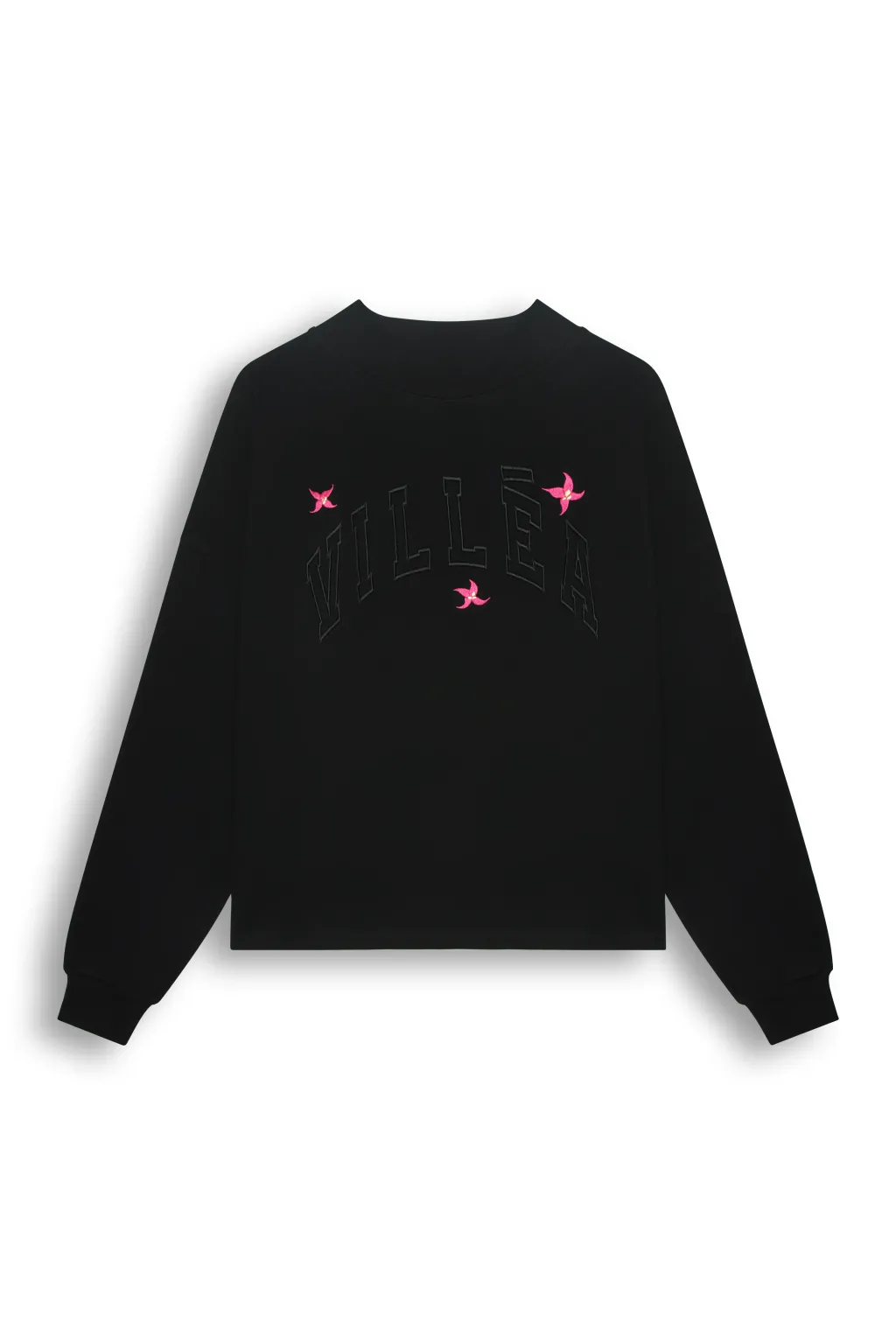 V I L L É A, notre sweatshirt inspiré de la magnifique bougainvillée. Le sweatshirt est une coupe surdimensionnée (oversized) avec une épaule tombante (drop shoulder). Ajoutez à cela un col montant et un motif brodé à deux endroits. Les bandes côtelées à vos poignets sont un peu plus longues. Vous permettant le plaisir de les plier et de mettre en valeur vos magnifiques ornements de poignet.