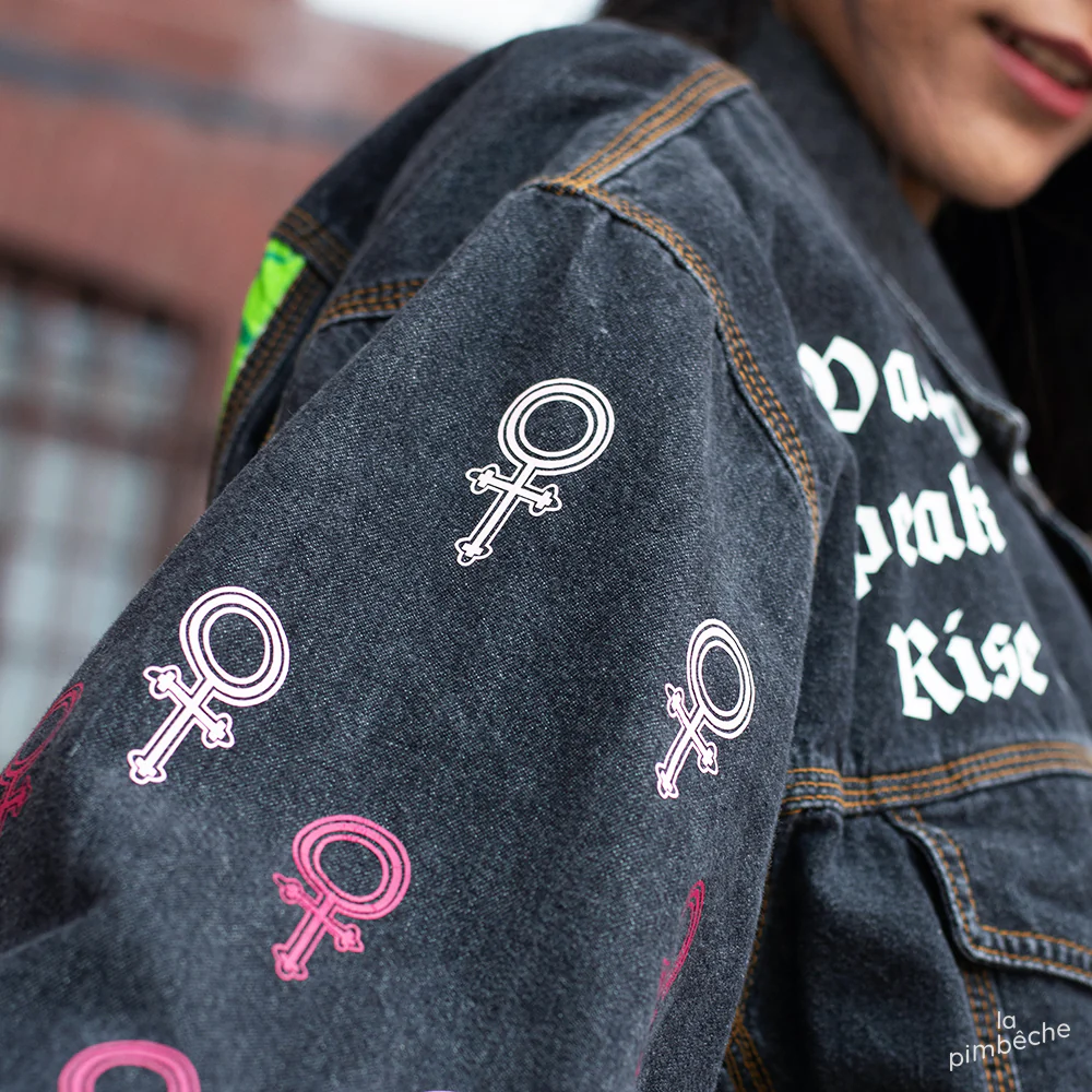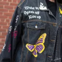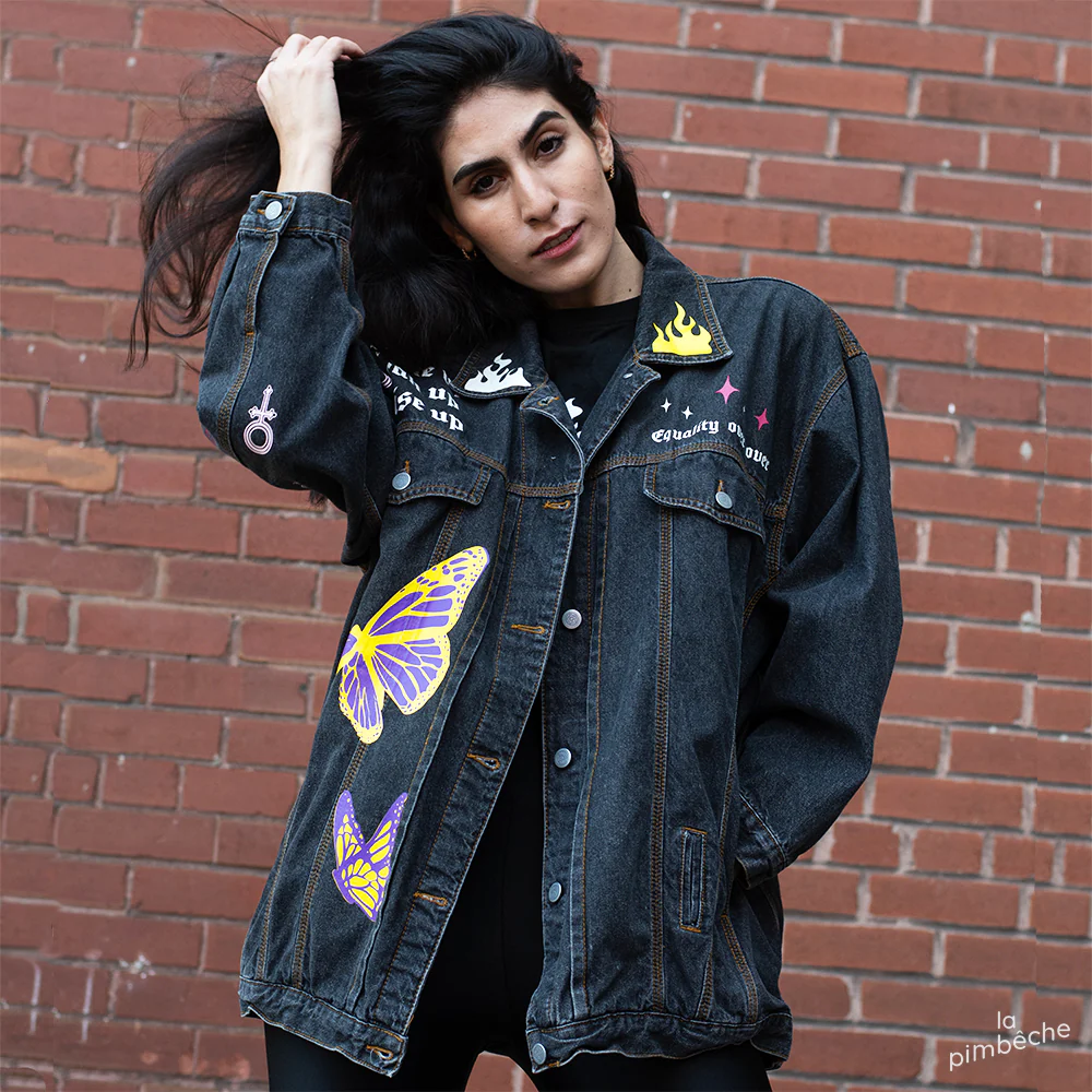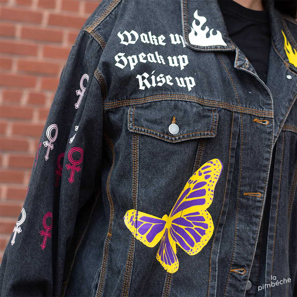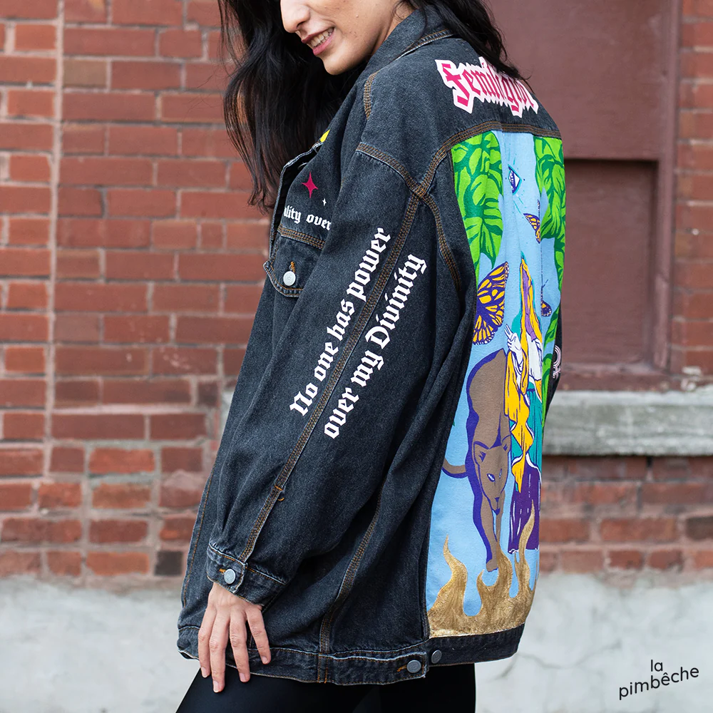 Cette veste en jeans fait partie d'une série de vestes confectionnées par La Pimbêche. Chaque œuvre unique est composée de couches de vinyle à transfert de chaleur. La veste devient la toile et votre corps le permet l'art de voyager.